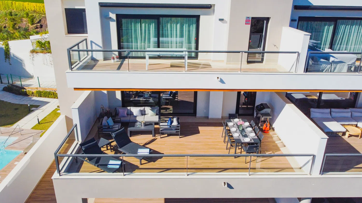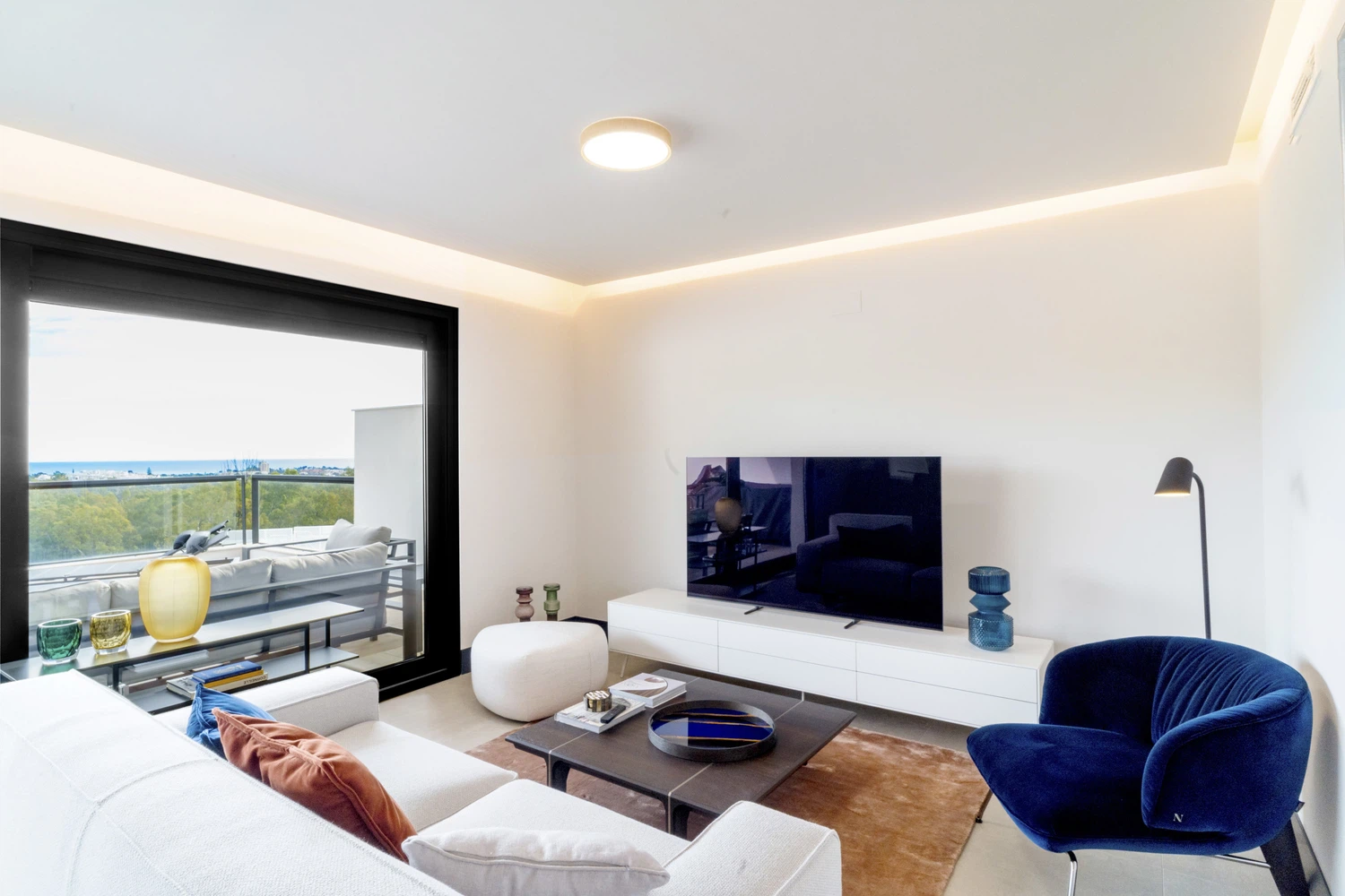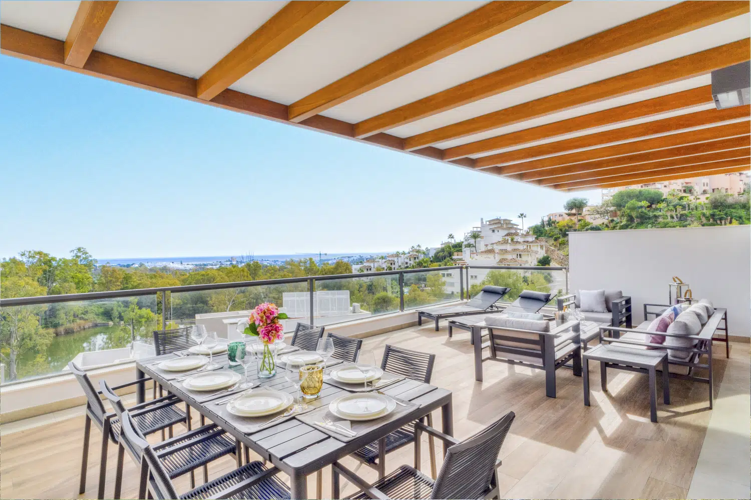 El apartamento presume un espacio de vida moderno y abierto, adornado con muebles y decoración de alta gama que transmite sofisticación. La característica destacada es la enorme terraza abierta con vistas increíbles sobre el lago cercano y el mar Mediterráneo azul más allá. La comunidad ofrece una atmósfera privada y tranquila, con características elegantes y modernas, incluyendo áreas de piscina que recuerdan a hoteles boutique. Los huéspedes pueden disfrutar de tranquilidad con seguridad las 24 horas y estacionamiento privado.