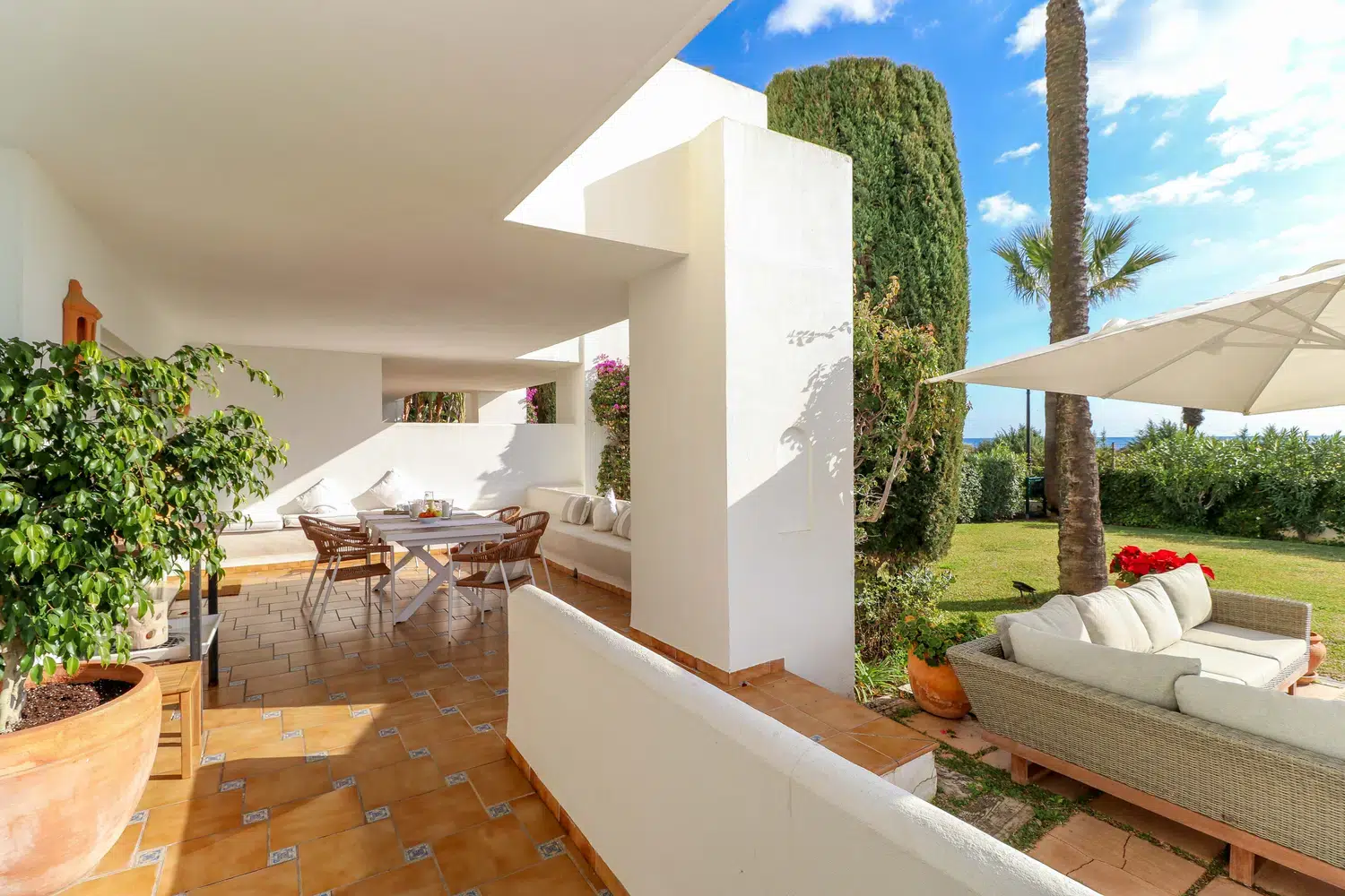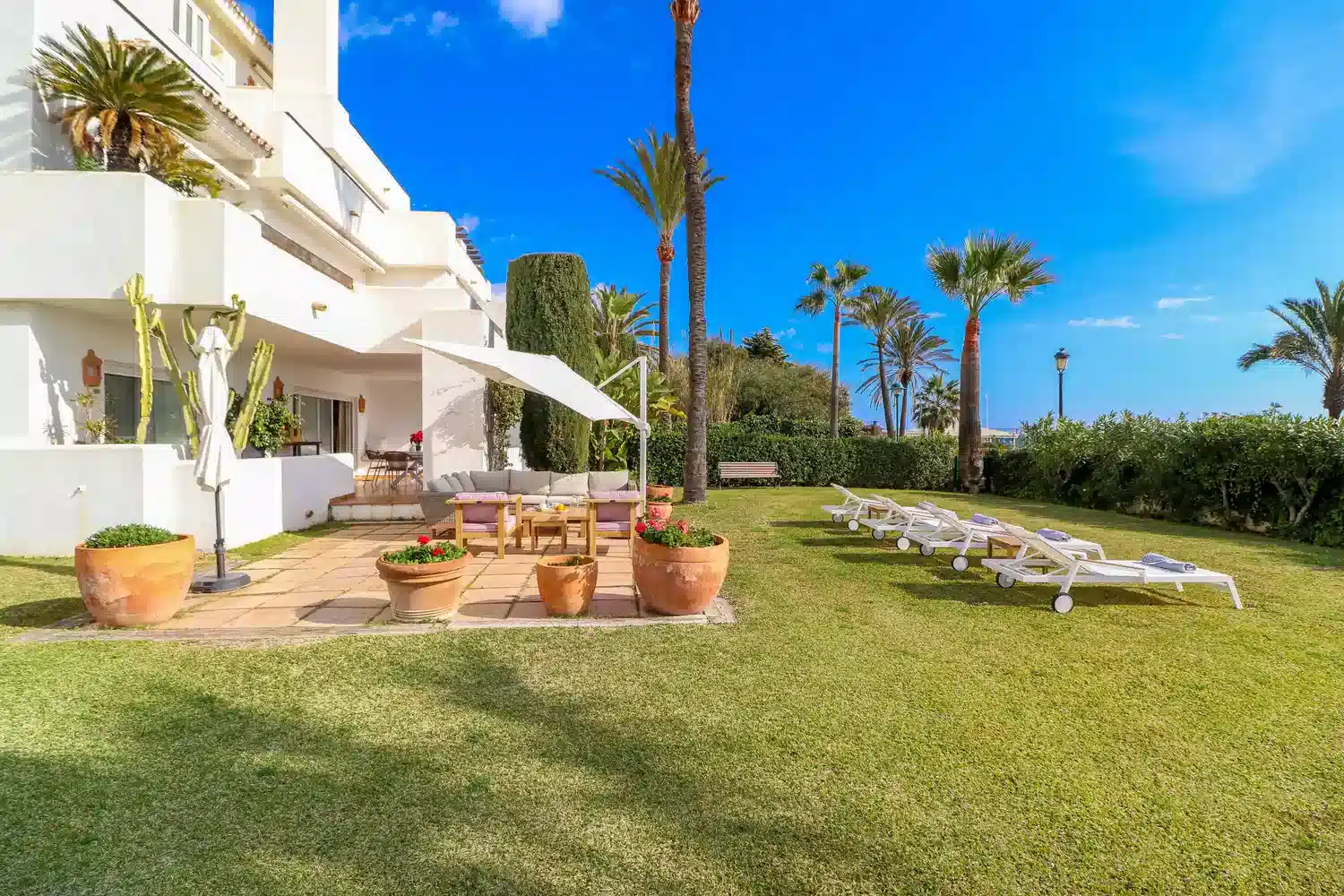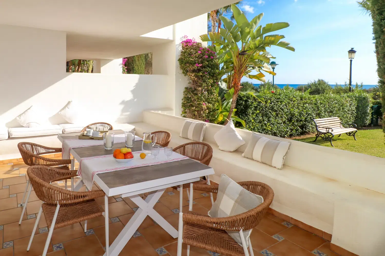 Apartamento espacioso y moderno que ofrece 3 hermosos dormitorios en suite con camas muy cómodas (tamaño super king) y una sala de estar bellamente decorada con acceso a la terraza y un gran jardín privado con muebles de exterior de alta calidad y magníficas vistas al mar.