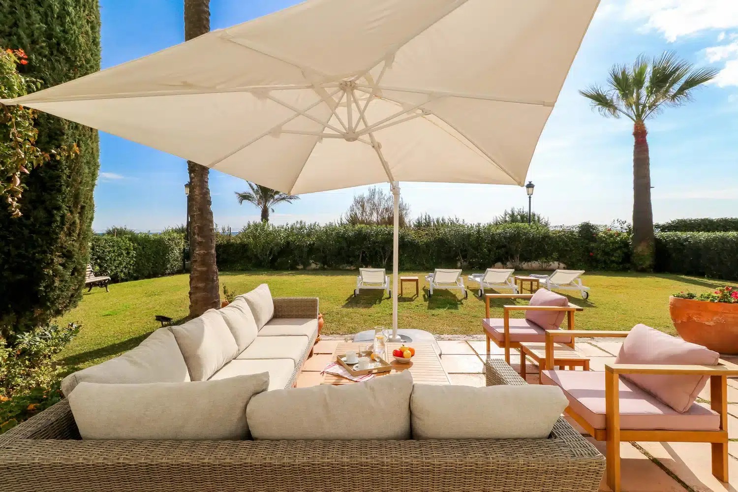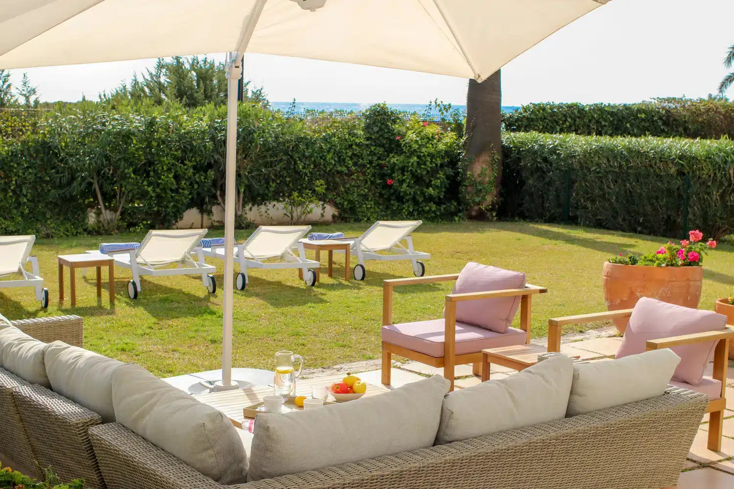 Gran jardín privado con el sofá exterior más cómodo, gran parasol para dar sombra, cuatro tumbonas, sillones, mesa de comedor para 6 personas y barbacoa para disfrutar de sabrosas comidas a la parrilla con la familia. ¡Casa de vacaciones ideal donde puedes disfrutar de vistas al mar y escuchar el sonido de las olas gracias a su privilegiada ubicación!