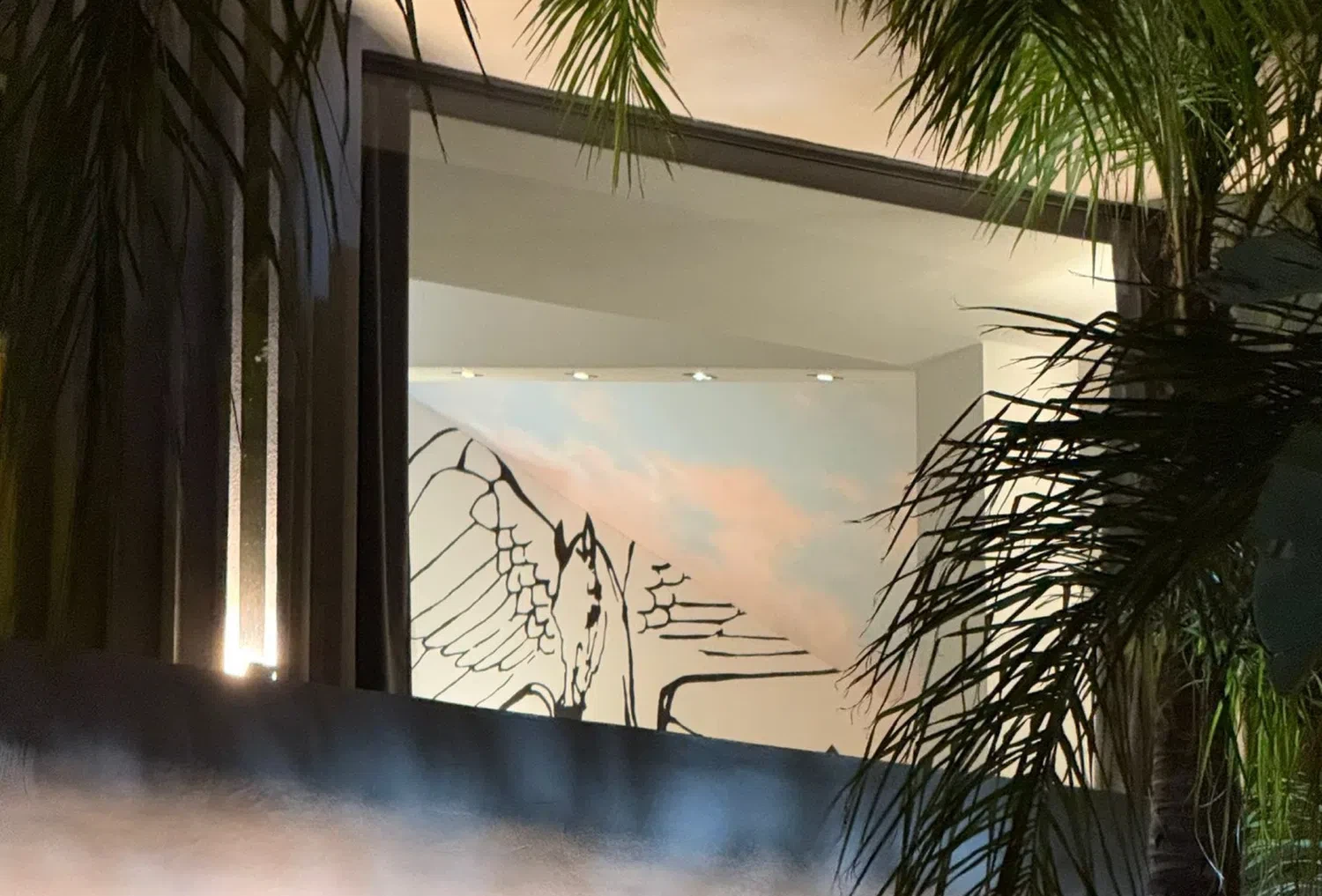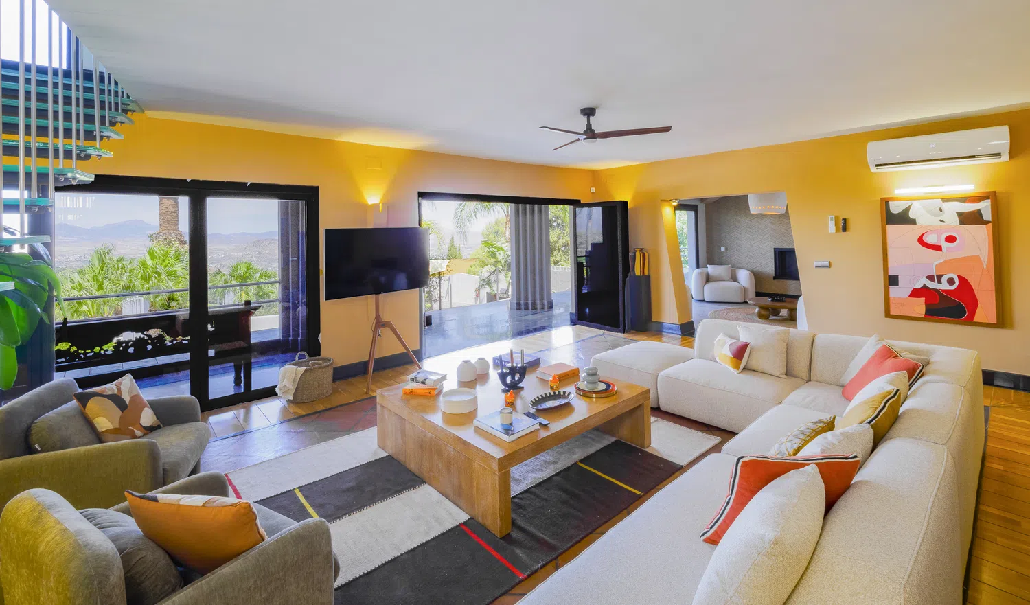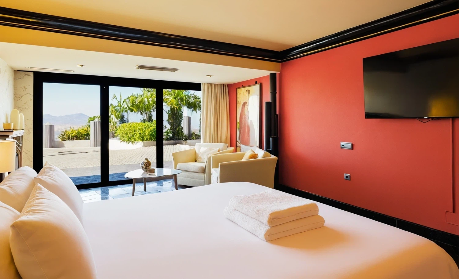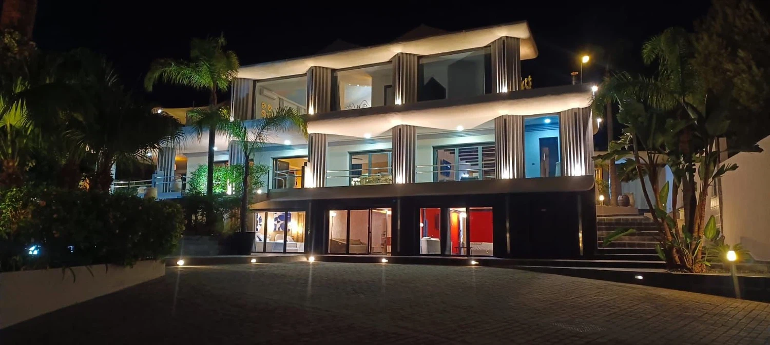 - Salón principal con TV Smart de gran formato y más de 2.000 canales internacionales, iluminación ambiental y fibra óptica