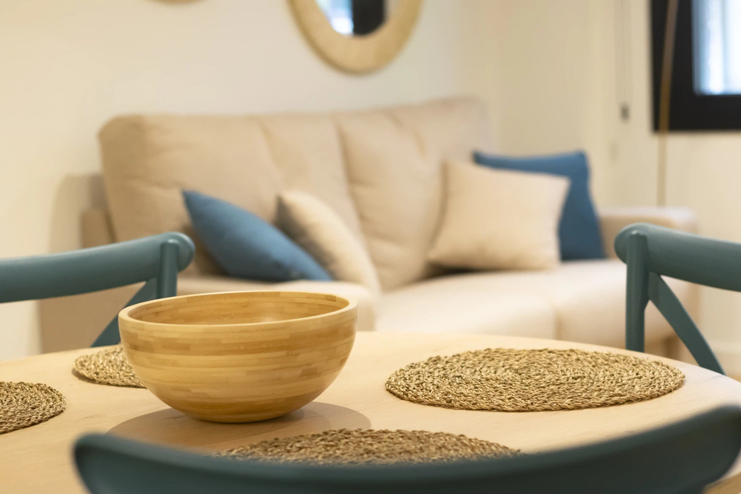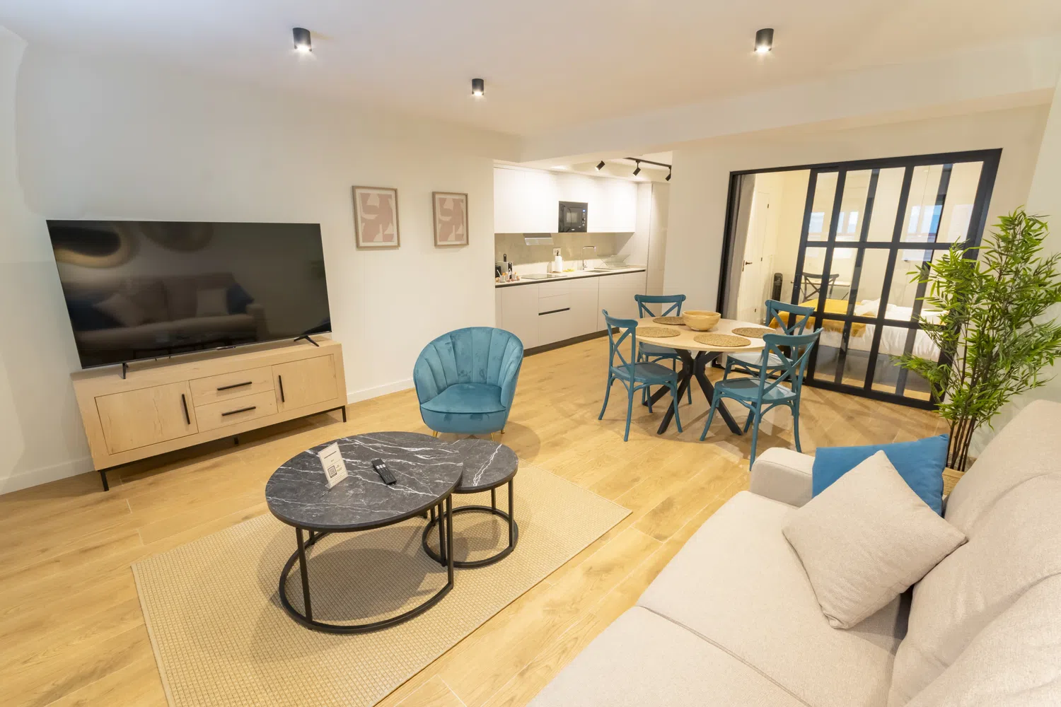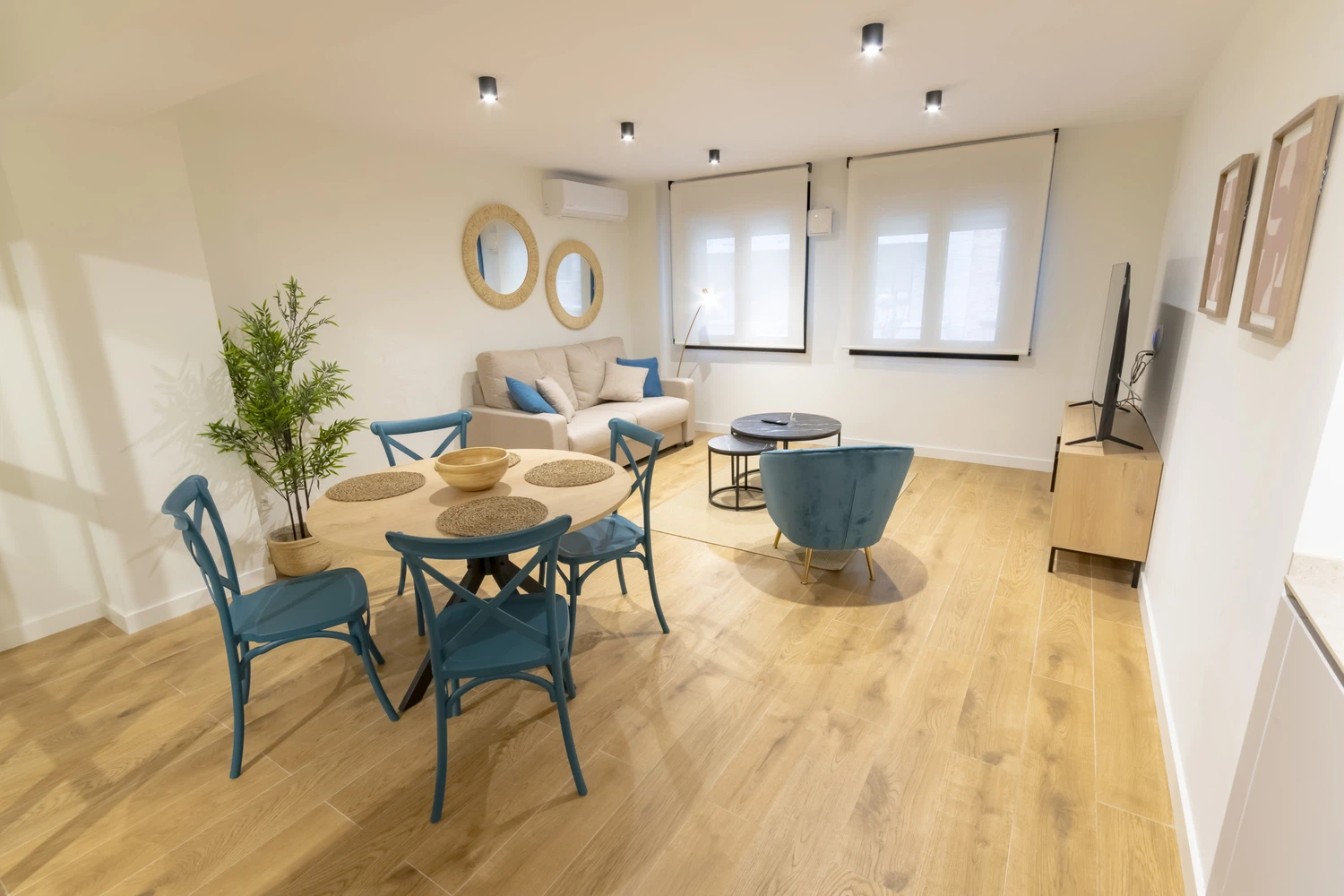 Salón-Comedor: Un salón elegante y funcional, perfecto para relajarse en el sofá cama (140cm) y disfrutar de la Smart TV.
