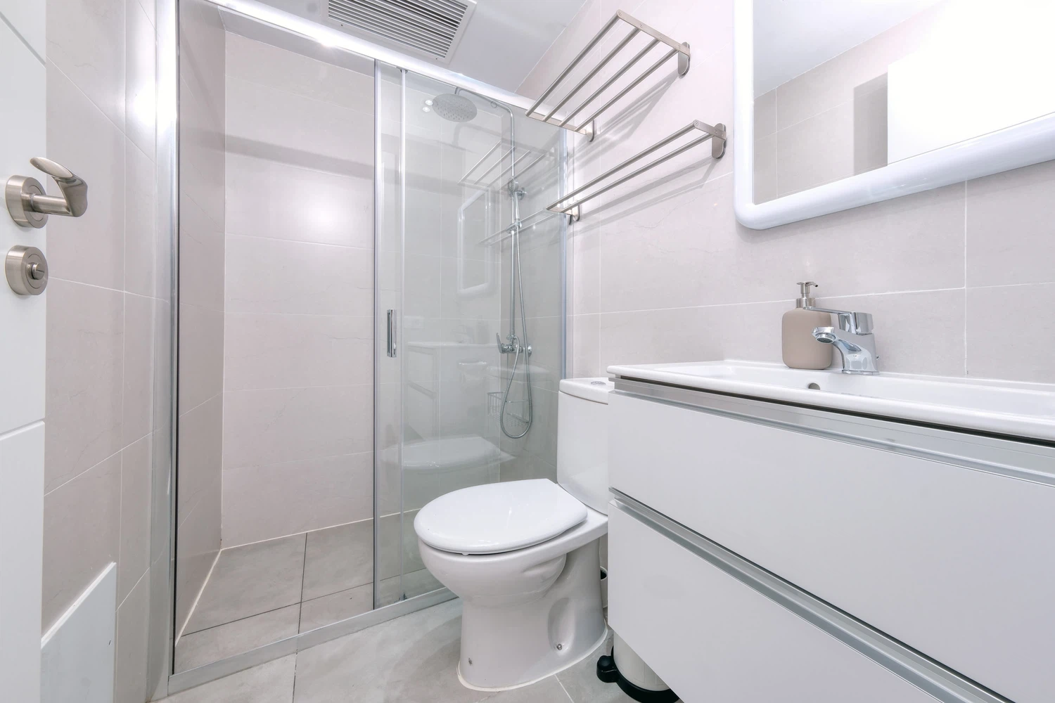 El baño sigue la misma línea de modernidad y funcionalidad, con una ducha amplia, lavabo con espejo iluminado y almacenamiento suficiente para los artículos de aseo y secador de pelo. Su diseño minimalista aporta una sensación de limpieza y frescura, complementando el estilo del resto de la vivienda.