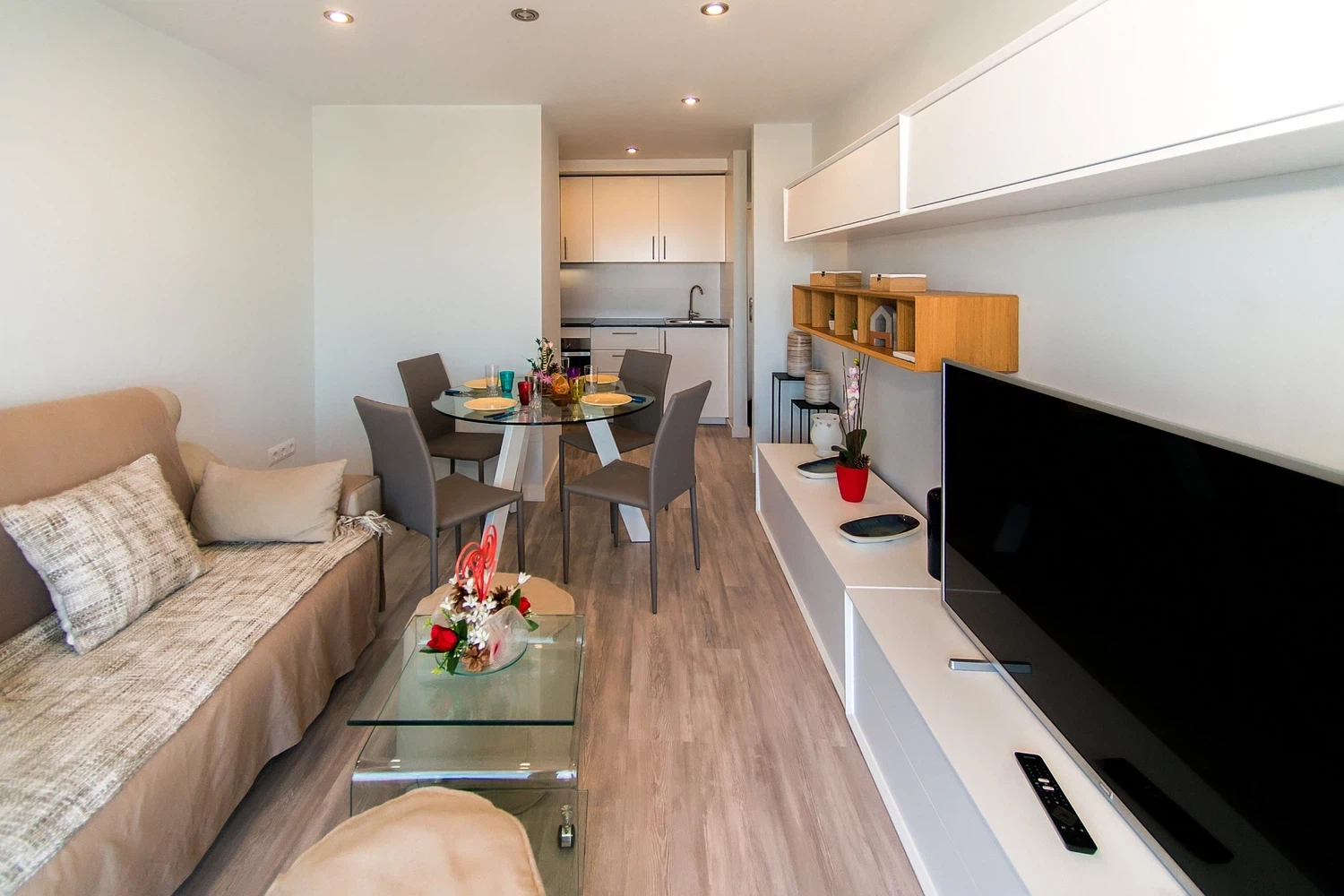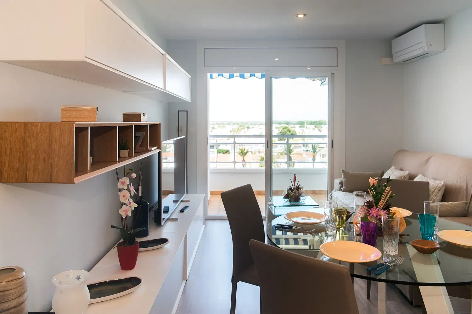 La sala de estar está equipada con un cómodo sofá de dos plazas y un televisor, lo que crea un lugar ideal para descansar. Aquí también se encuentra la zona de comedor, donde se pueden disfrutar deliciosos platos. Desde la sala de estar hay una salida a la terraza, desde donde se pueden admirar las pintorescas vistas del canal y los barcos que pasan.