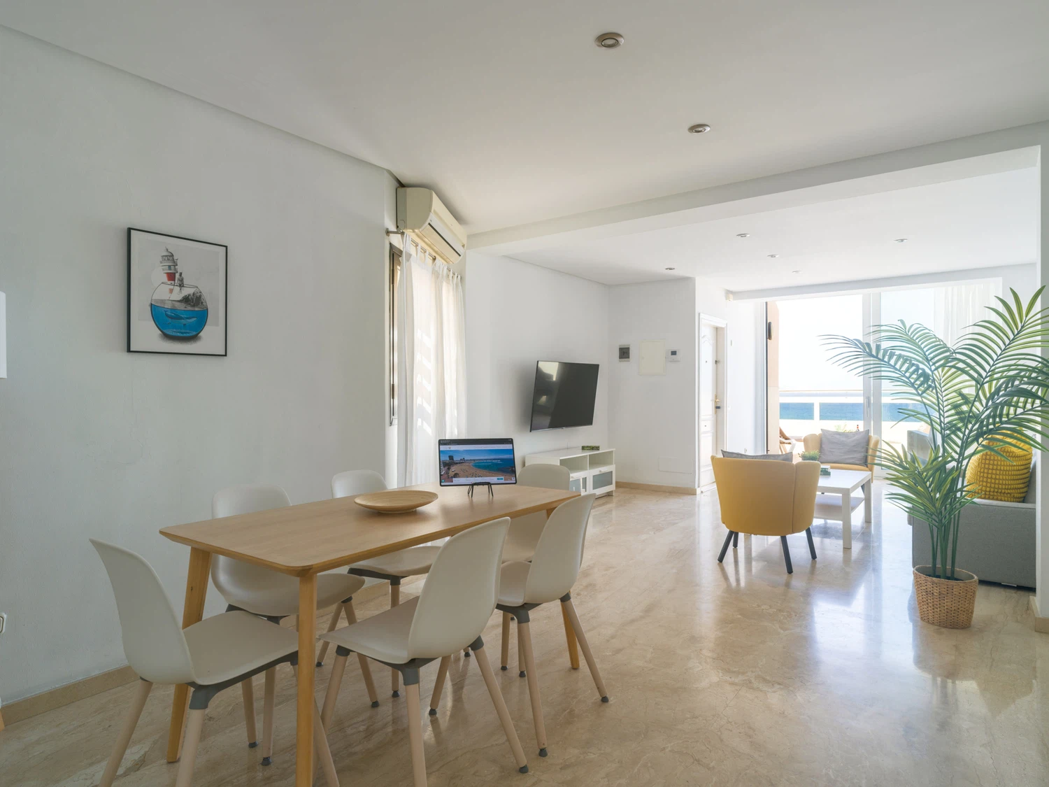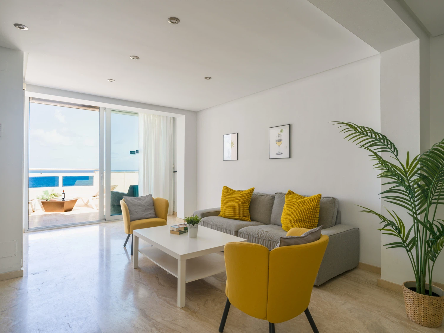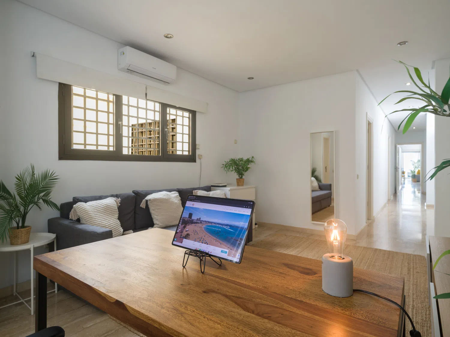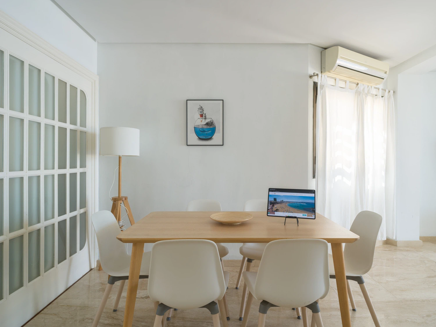 Al entrar al edificio, hay que subir seis peldaños hasta llegar al ascensor, al llegar a la última planta hay 14 peldaños hasta llegar al fabuloso ático. Al entrar, se aprecia una luminosa sala de estar con amplios ventanales que permiten la entrada de luz natural. Los tonos neutros y la decoración contemporánea crean un ambiente acogedor y relajante. El salón comedor dispone de una amplia mesa de comedor con seis cómodas sillas, además de cómodos sofás, un televisor Smart y aire acondicionado, perfecto para relajarse después de un día de explorando la isla.