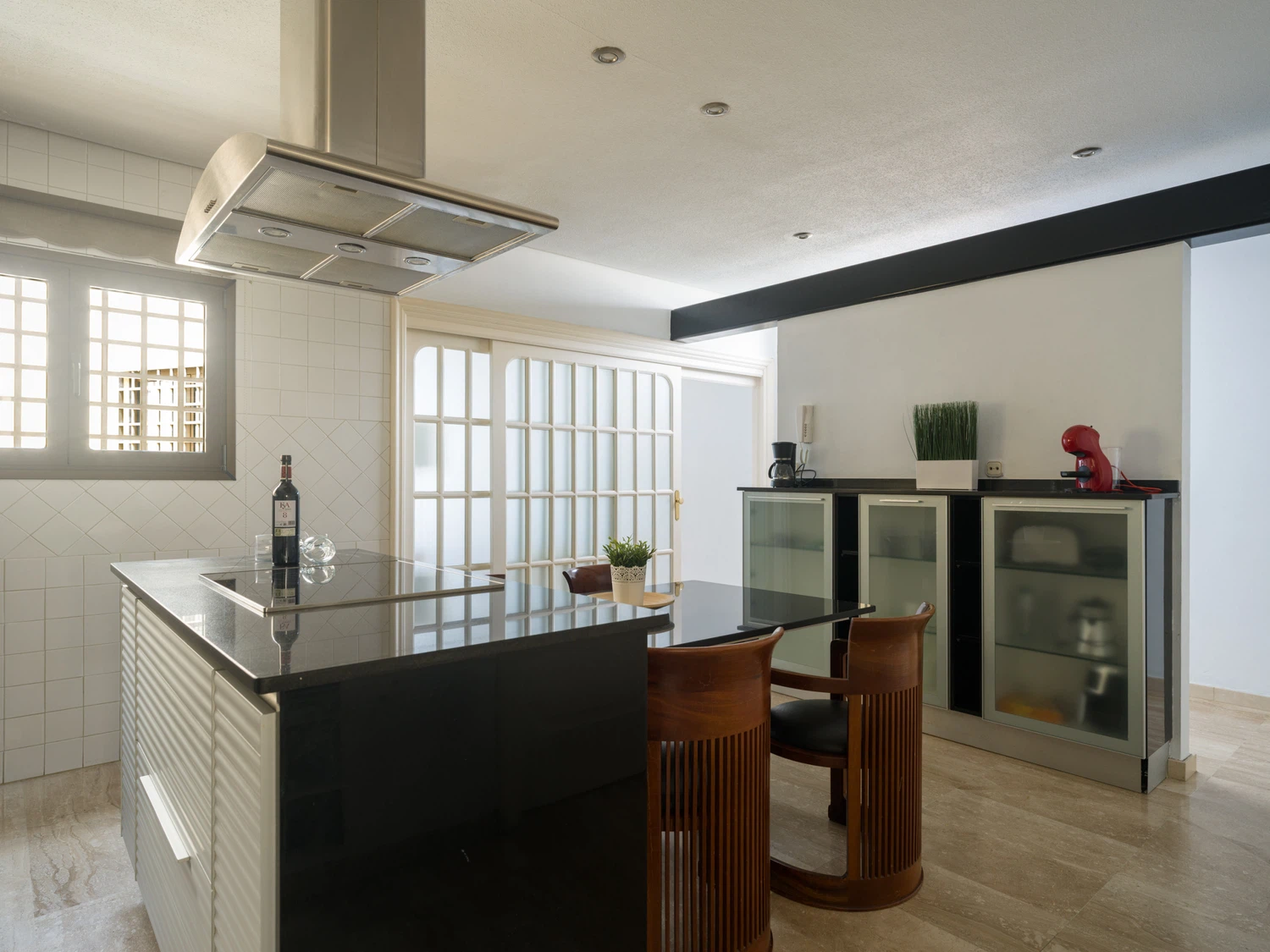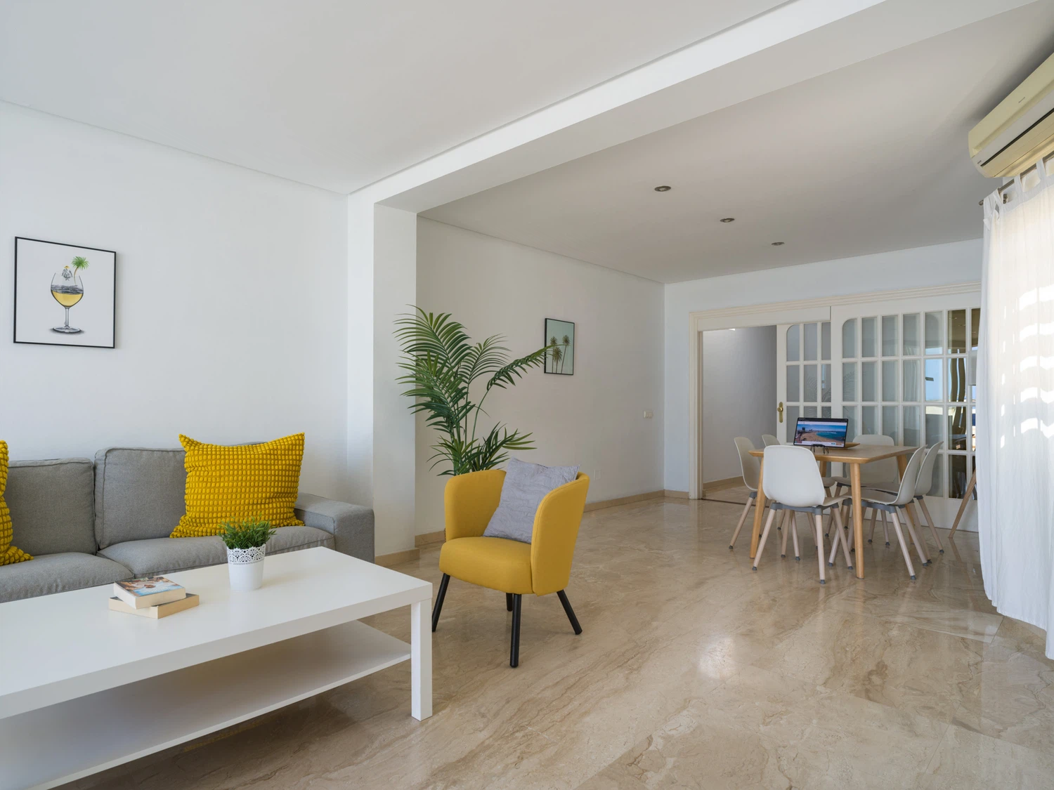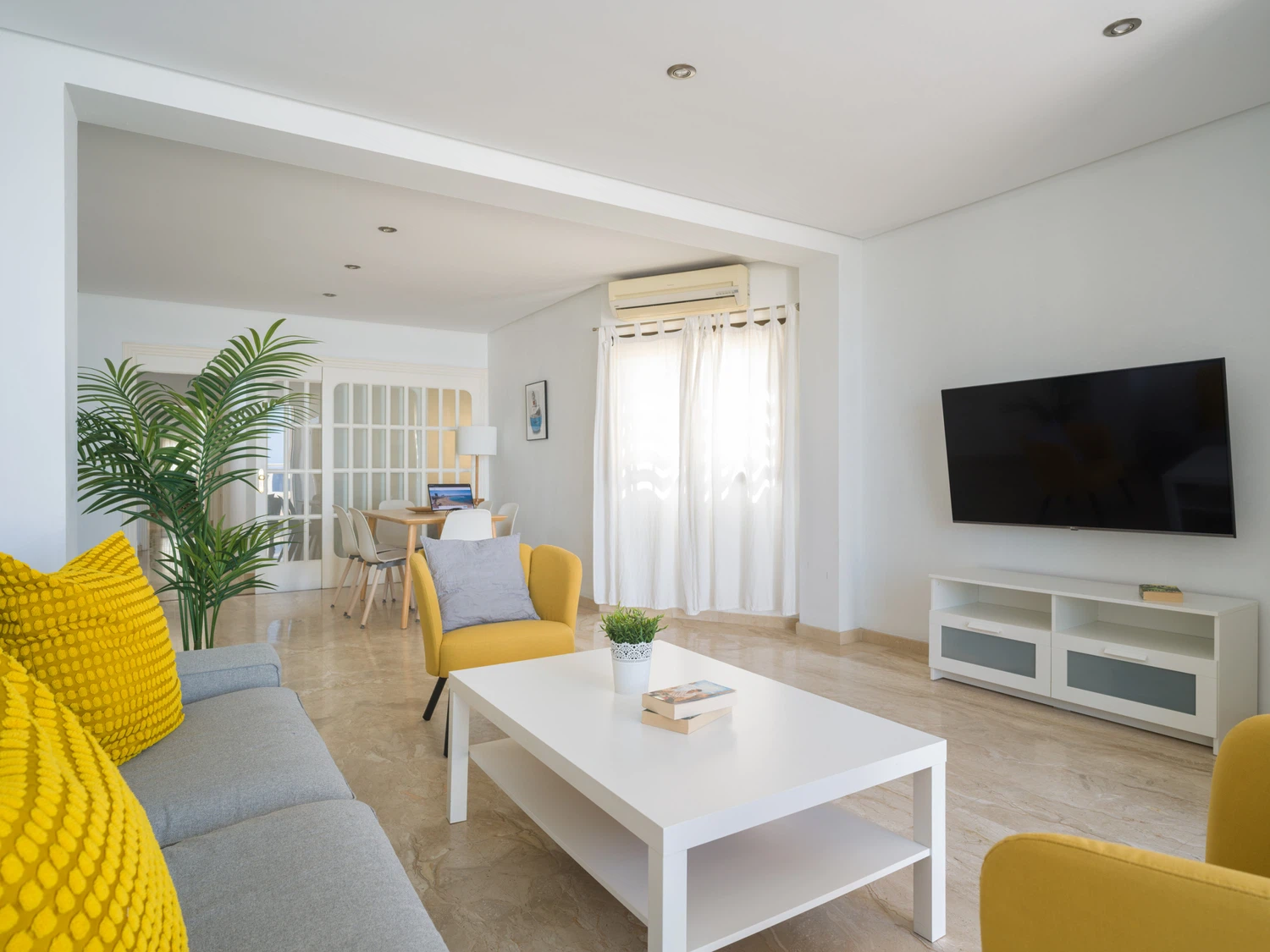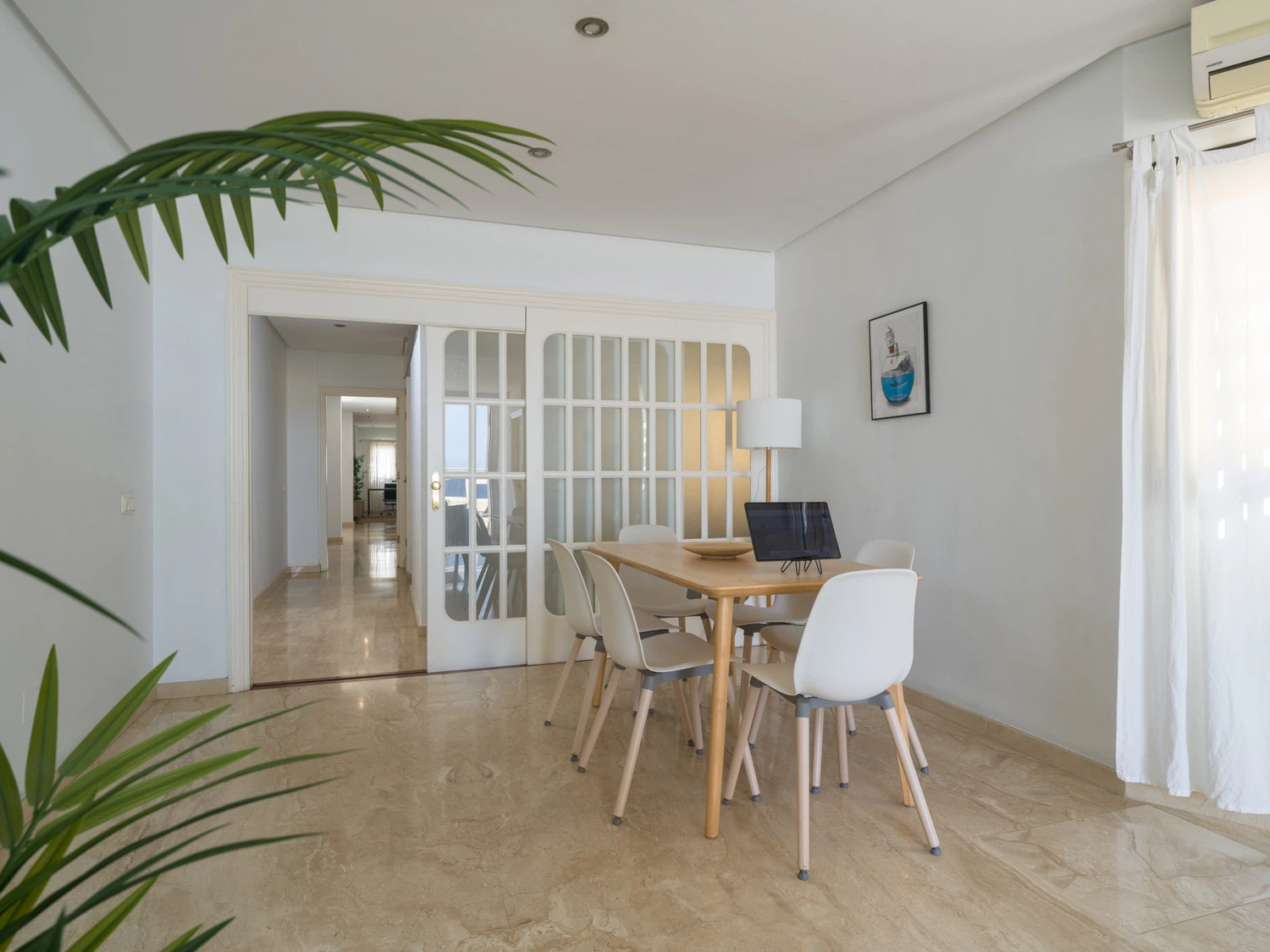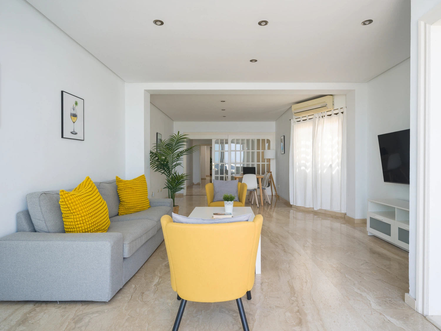 Al entrar al edificio, hay que subir seis peldaños hasta llegar al ascensor, al llegar a la última planta hay 14 peldaños hasta llegar al fabuloso ático. Al entrar, se aprecia una luminosa sala de estar con amplios ventanales que permiten la entrada de luz natural. Los tonos neutros y la decoración contemporánea crean un ambiente acogedor y relajante. El salón comedor dispone de una amplia mesa de comedor con seis cómodas sillas, además de cómodos sofás, un televisor Smart y aire acondicionado, perfecto para relajarse después de un día de explorando la isla.