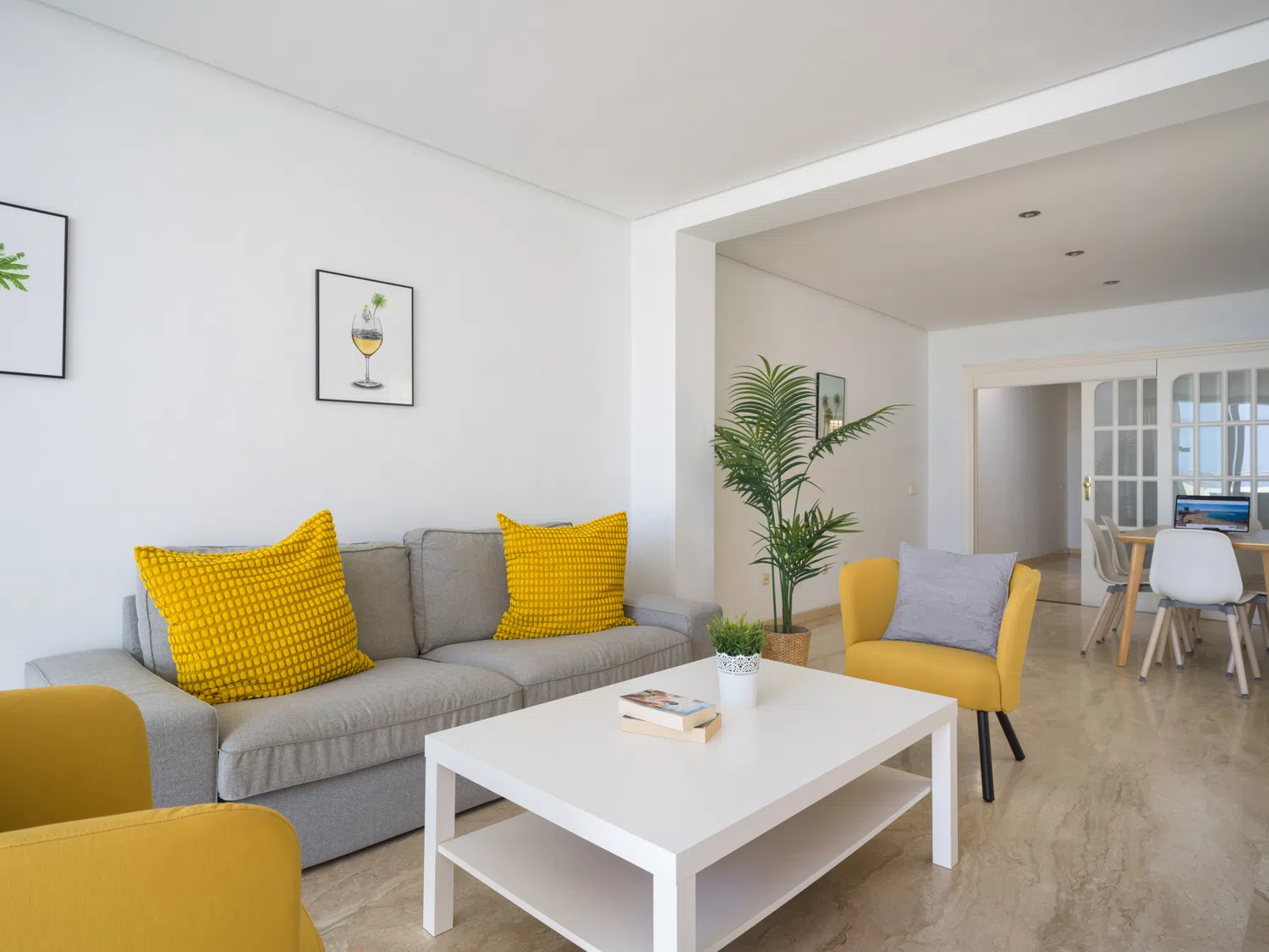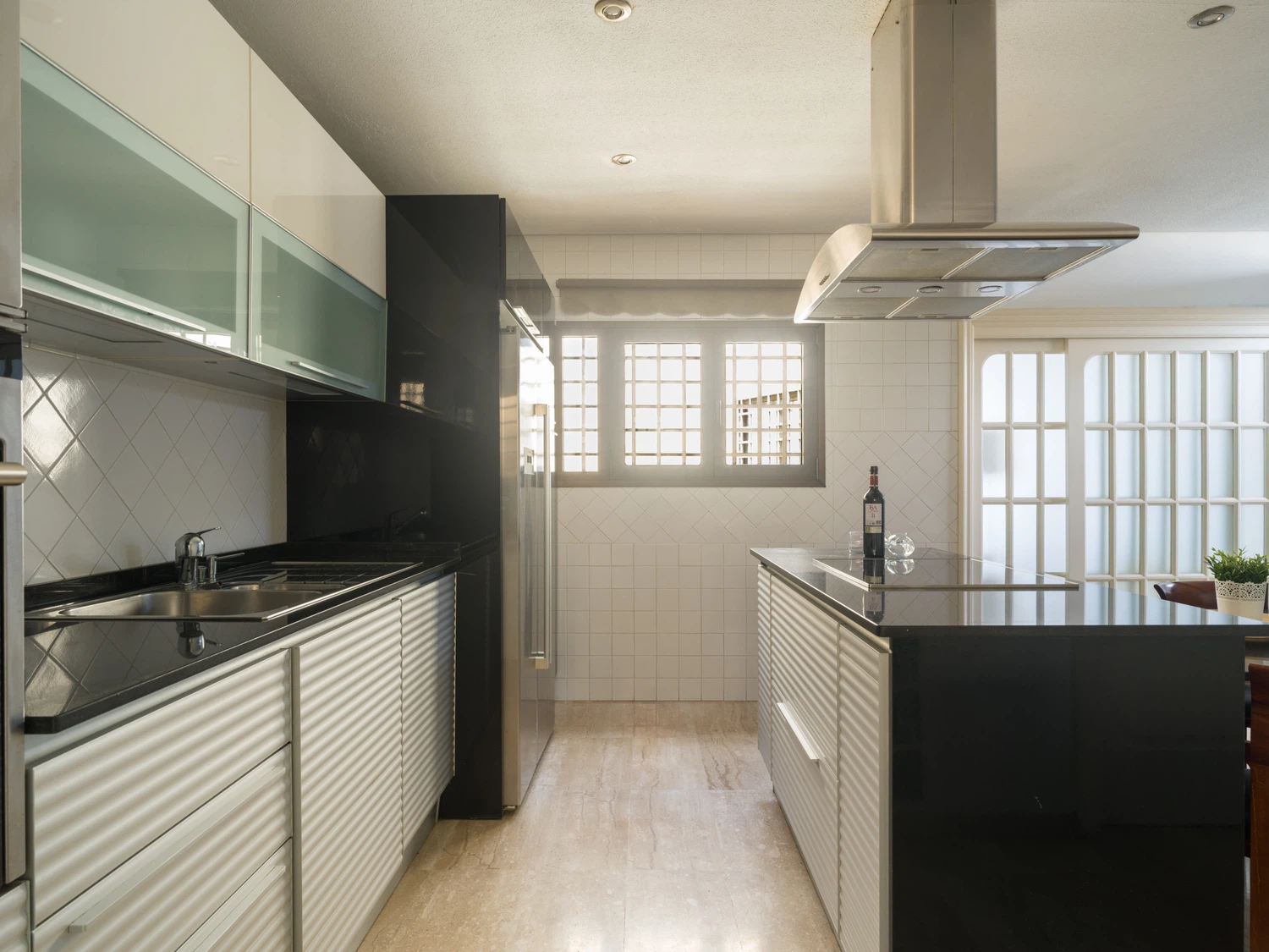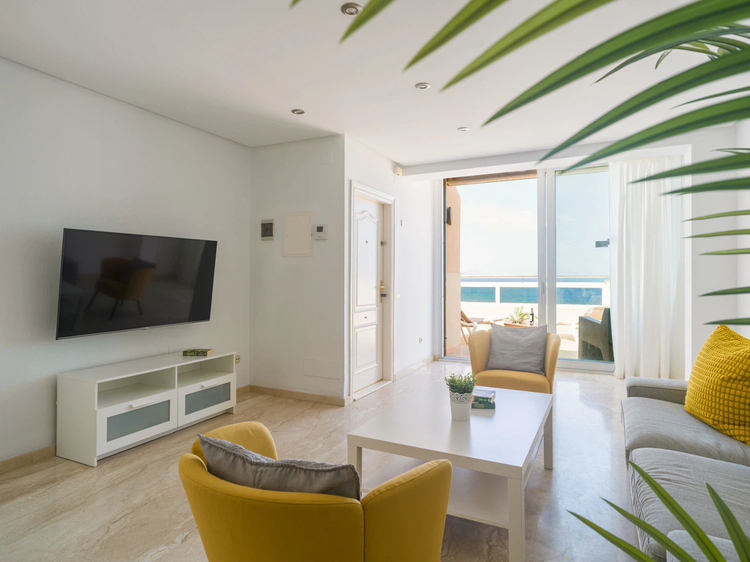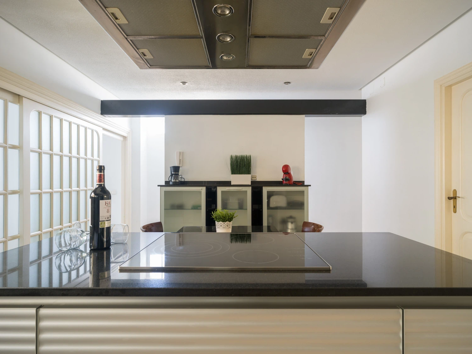 Al entrar al edificio, hay que subir seis peldaños hasta llegar al ascensor, al llegar a la última planta hay 14 peldaños hasta llegar al fabuloso ático. Al entrar, se aprecia una luminosa sala de estar con amplios ventanales que permiten la entrada de luz natural. Los tonos neutros y la decoración contemporánea crean un ambiente acogedor y relajante. El salón comedor dispone de una amplia mesa de comedor con seis cómodas sillas, además de cómodos sofás, un televisor Smart y aire acondicionado, perfecto para relajarse después de un día de explorando la isla.