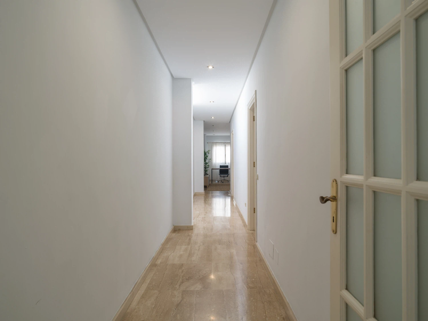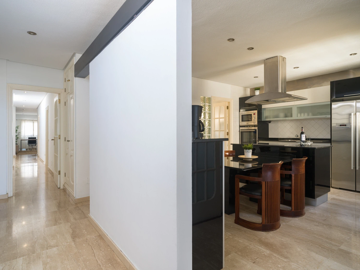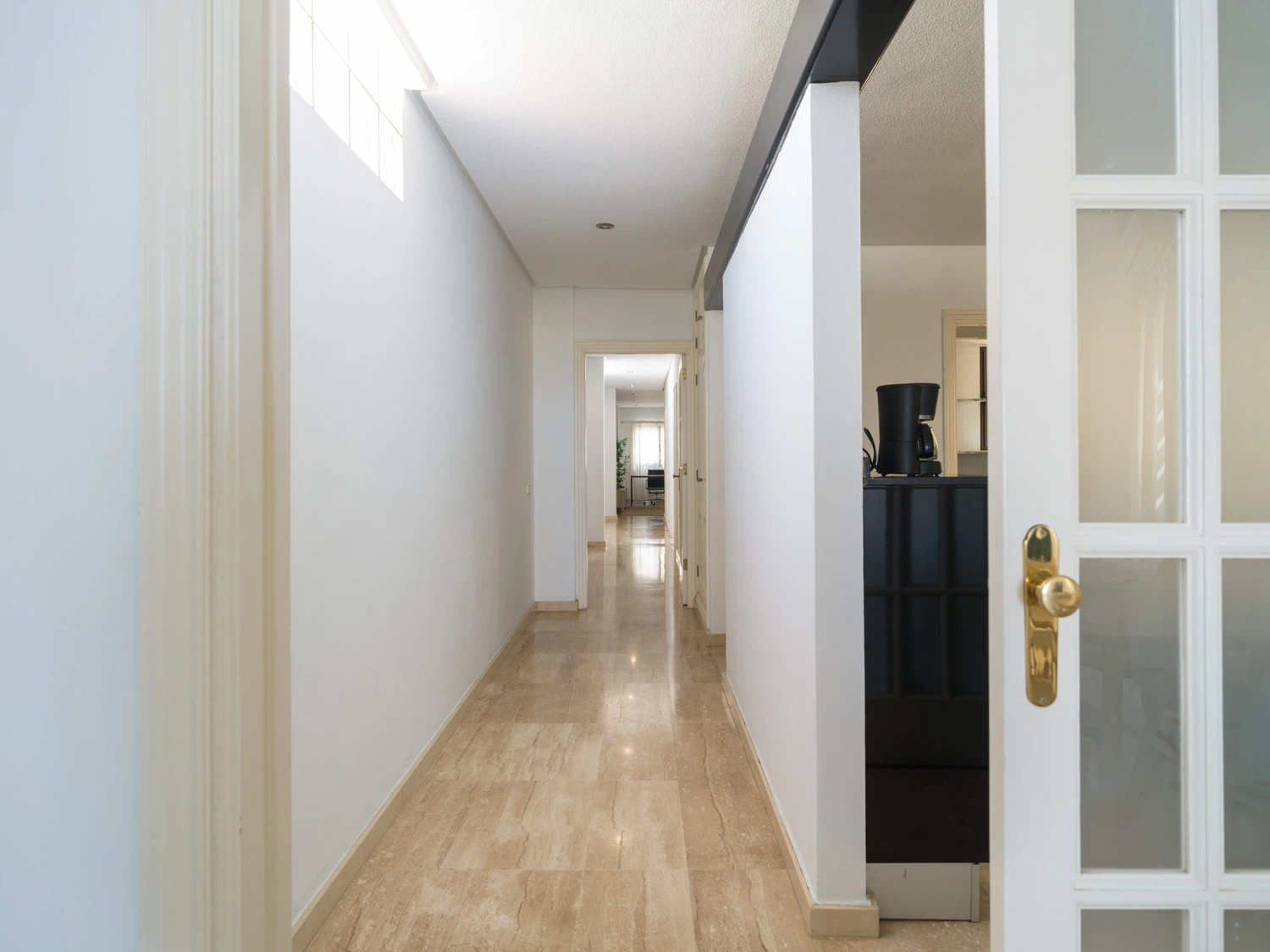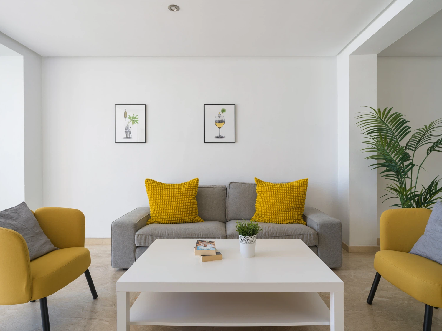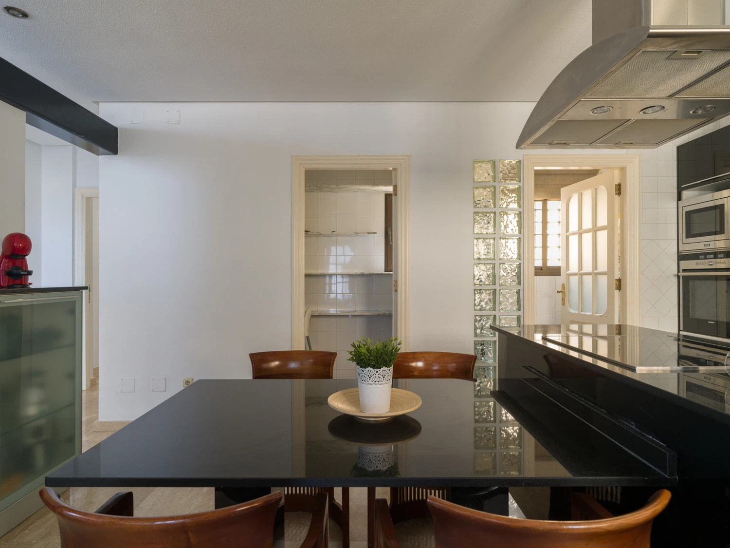 Al entrar al edificio, hay que subir seis peldaños hasta llegar al ascensor, al llegar a la última planta hay 14 peldaños hasta llegar al fabuloso ático. Al entrar, se aprecia una luminosa sala de estar con amplios ventanales que permiten la entrada de luz natural. Los tonos neutros y la decoración contemporánea crean un ambiente acogedor y relajante. El salón comedor dispone de una amplia mesa de comedor con seis cómodas sillas, además de cómodos sofás, un televisor Smart y aire acondicionado, perfecto para relajarse después de un día de explorando la isla.