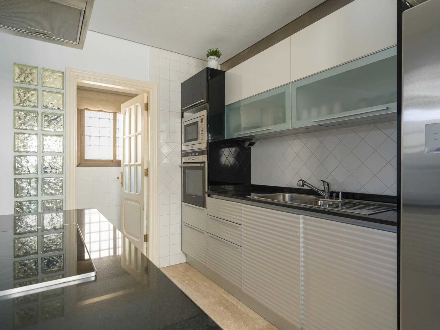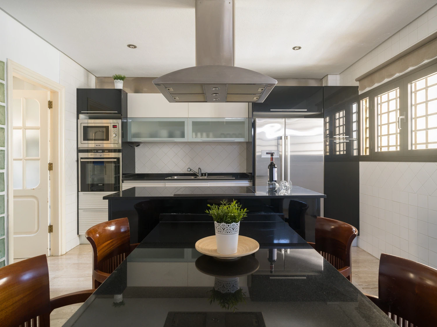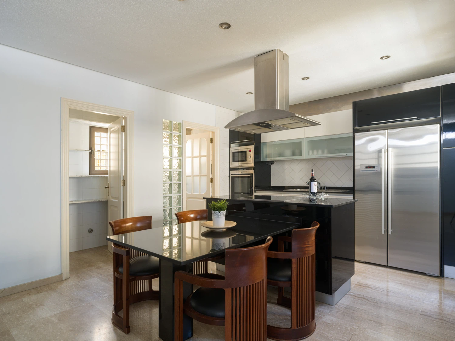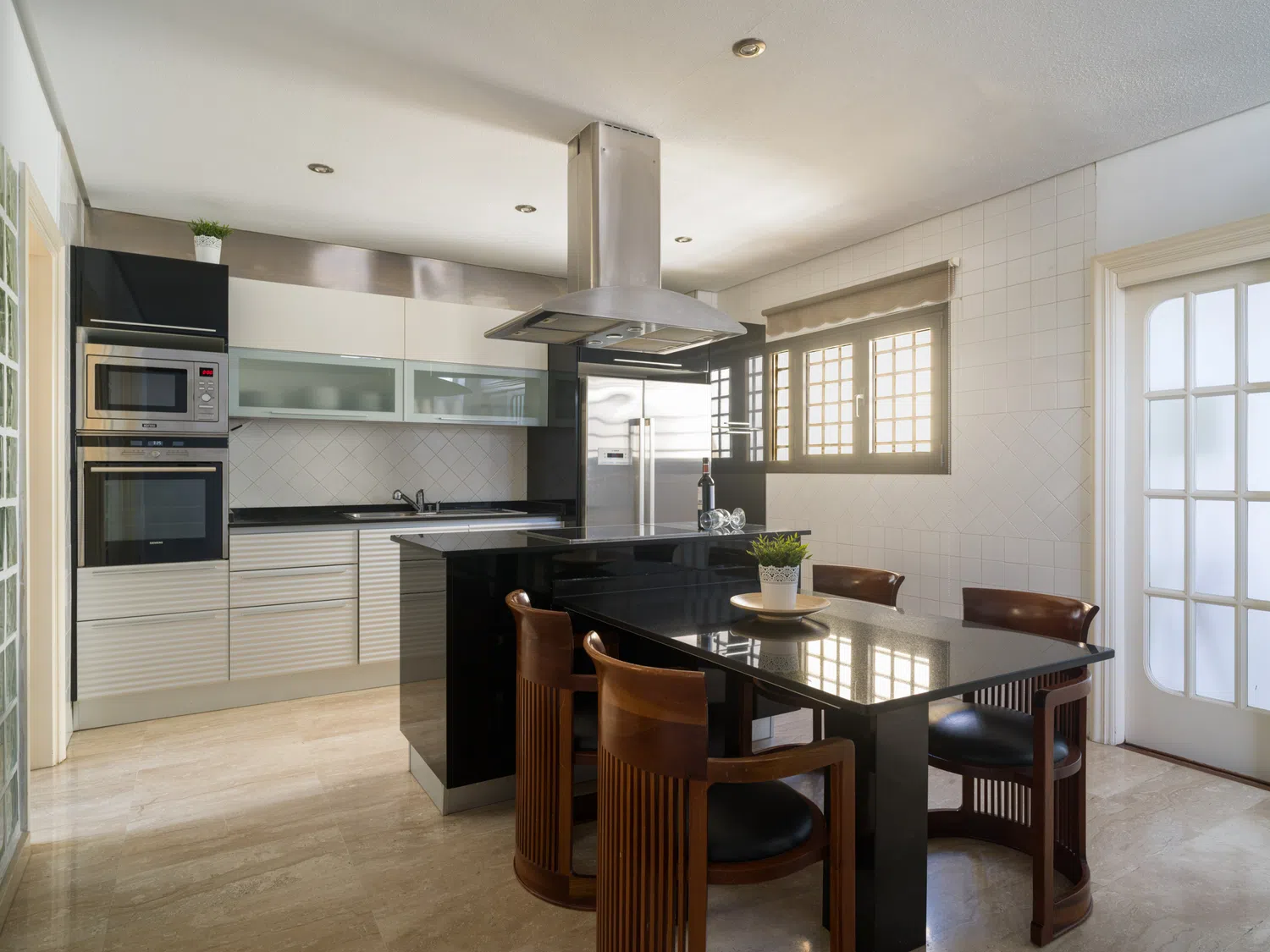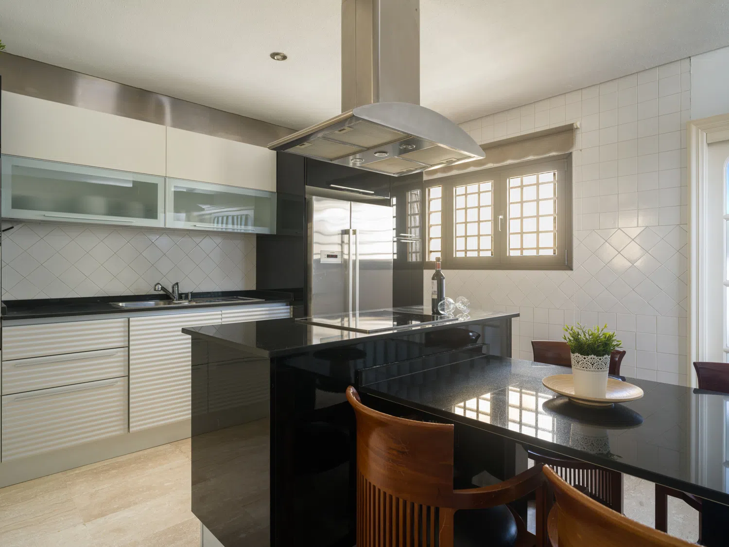 La cocina totalmente equipada está diseñada con elegancia y cuenta con electrodomésticos modernos, como una nevera, horno, microondas, lavavajillas y pequeños electrodomésticos. También cuenta con una isla y amplia barra con cuatro taburetes confortables. Los huéspedes tienen todo lo que necesitan para preparar cualquier tipo de comida y disfrutar de ellas en el comedor adyacente, que ofrece un espacio acogedor para reunirse alrededor de la mesa y con vistas al mar.