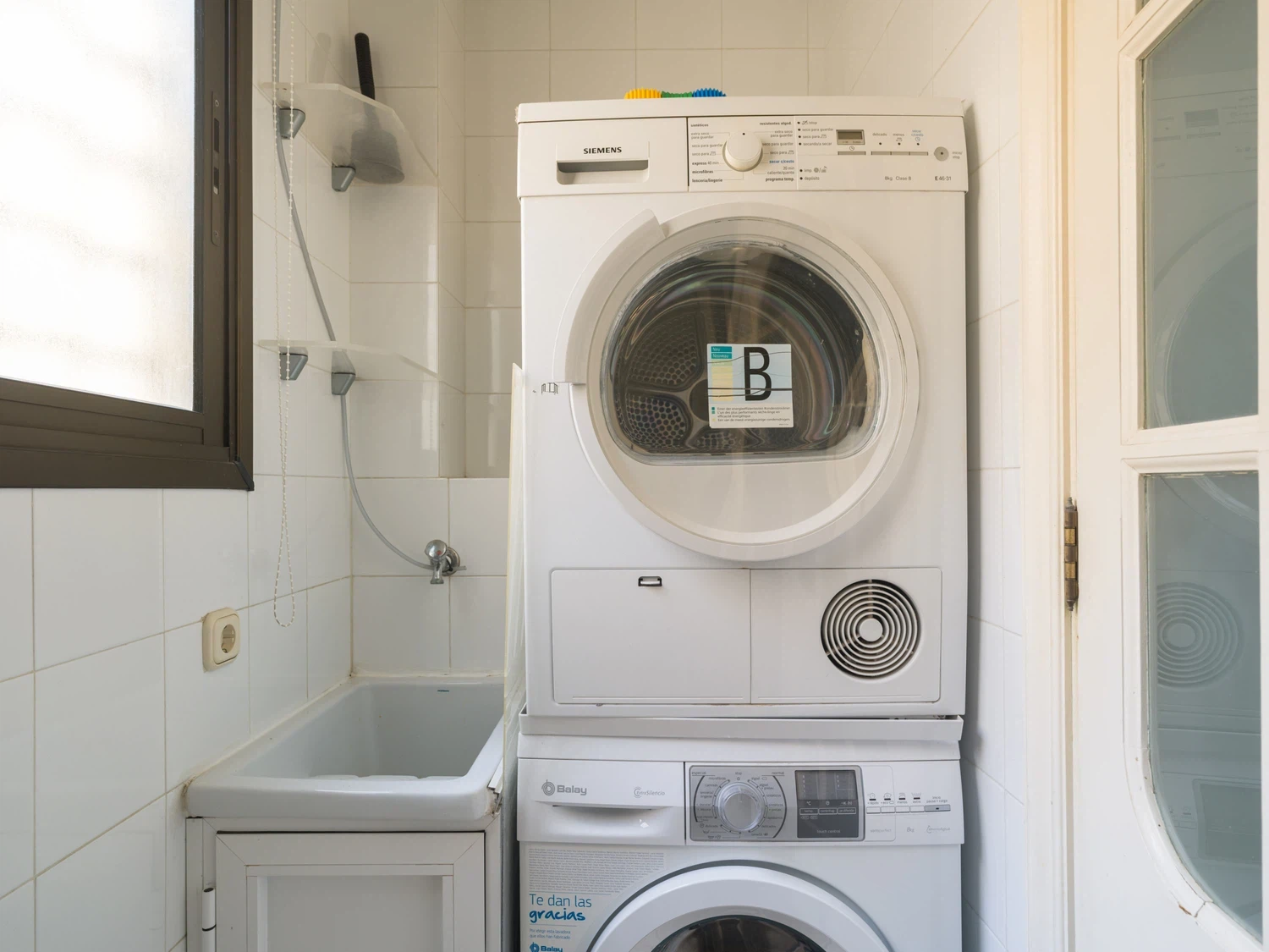 Junto a la cocina está el cuarto de lavado, con lavadora, secadora, tabla de planchar y planta, donde también se guardan los artículos y los productos para la limpieza.