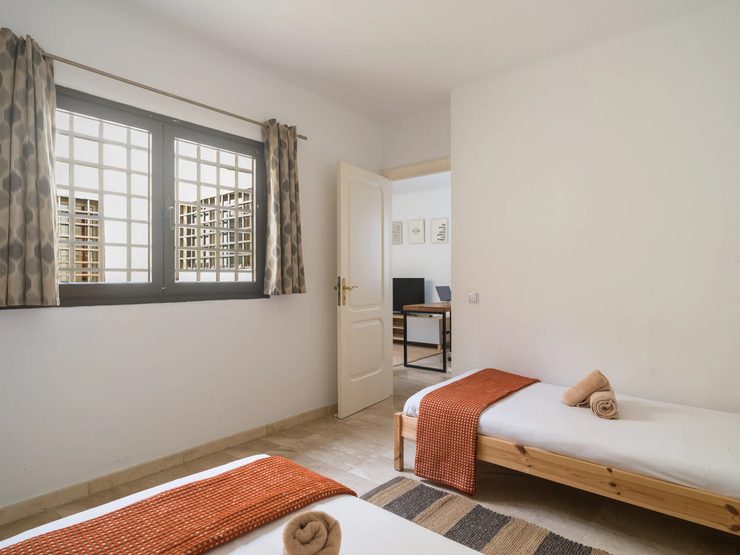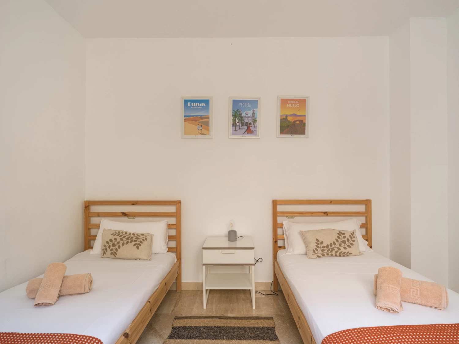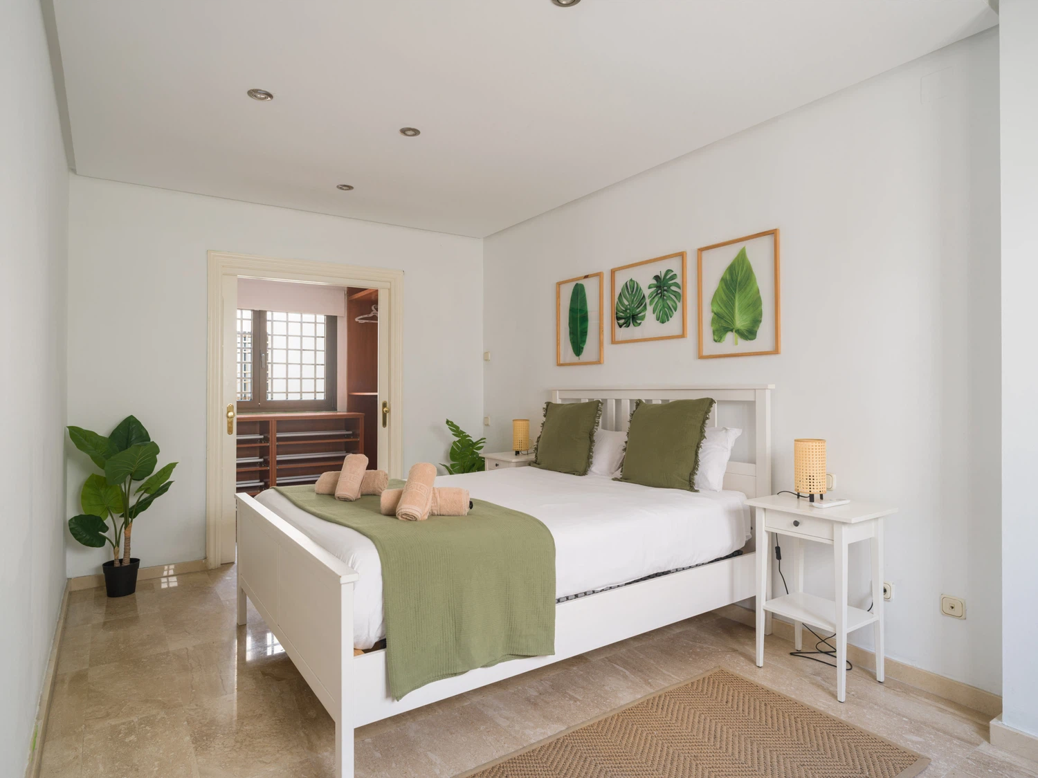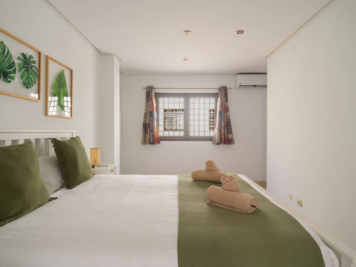 La vivienda cuenta con dos dormitorios con aire acondicionado, ambos presentados con un estilo moderno y cómodo. Las habitaciones están amuebladas una suite con cama doble (1.60 metros de ancho), vestidor y baño y el otro con dos camas individuales (0.9 metros de ancho cada una) con ropa de cama de calidad, asegurando una noche de descanso reparador a los huéspedes. Además, hay armarios empotrados que brindan amplio espacio de almacenamiento.