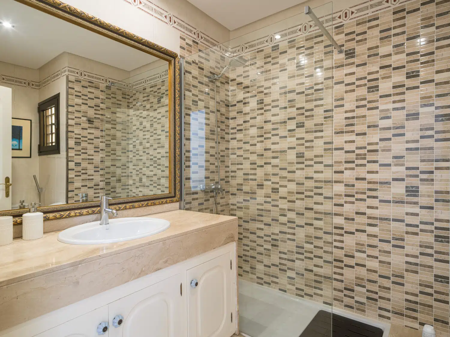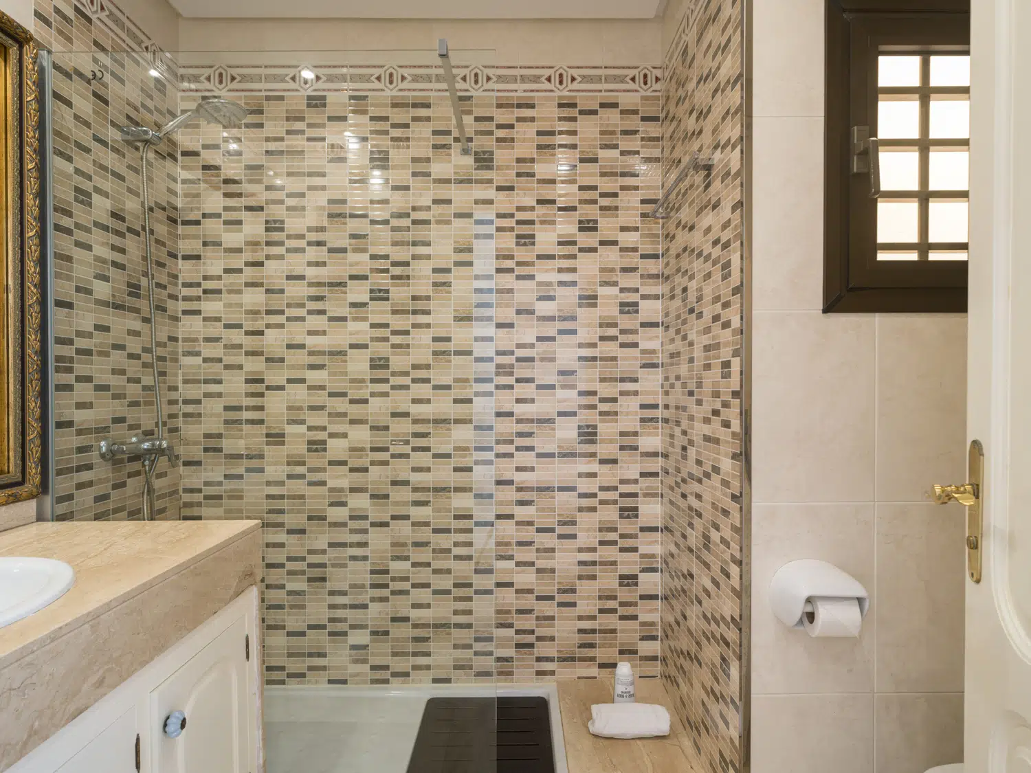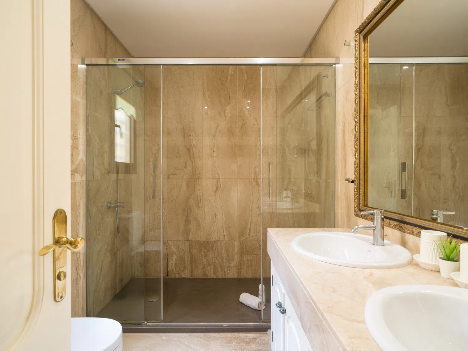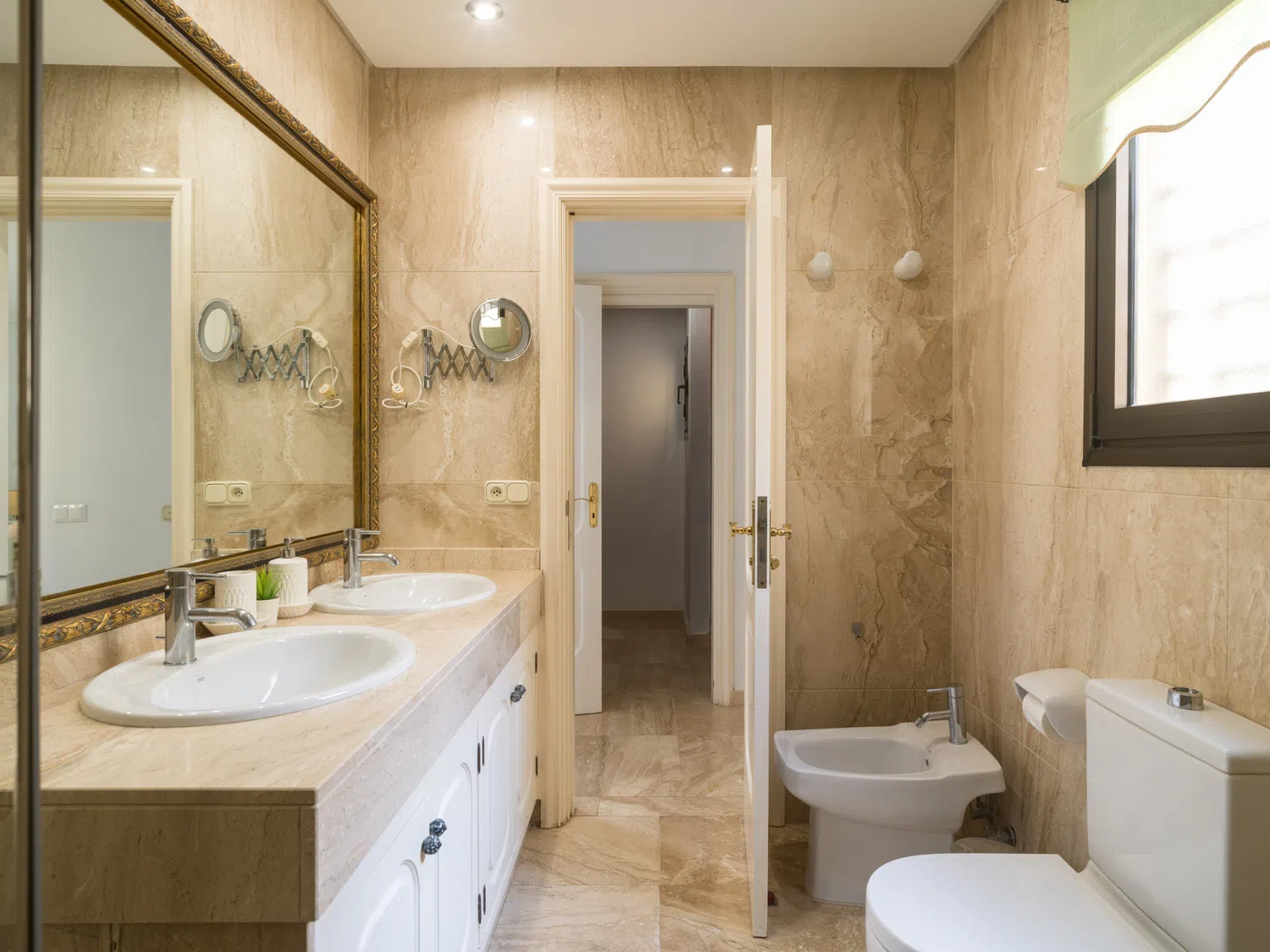 Tiene dos elegantes baños de mármol, equipados con platos de duchas, WC, bidé y doble lavamanos, amplios espejos, secador de pelo y un juego completo de toallas suaves y esponjosas.