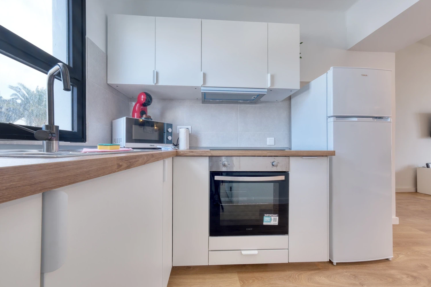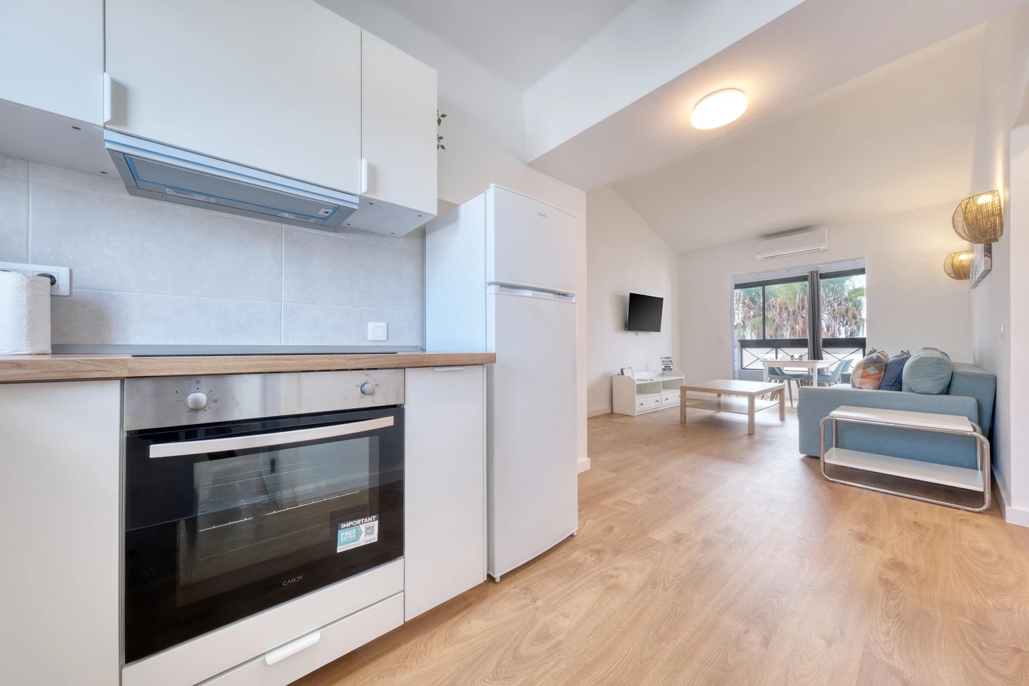 La cocina está totalmente equipada con nevera, microondas, cafetera/tetera, exprimidor, utensilios de cocina y todo lo necesario para preparar y disfrutar de tus comidas con comodidad.