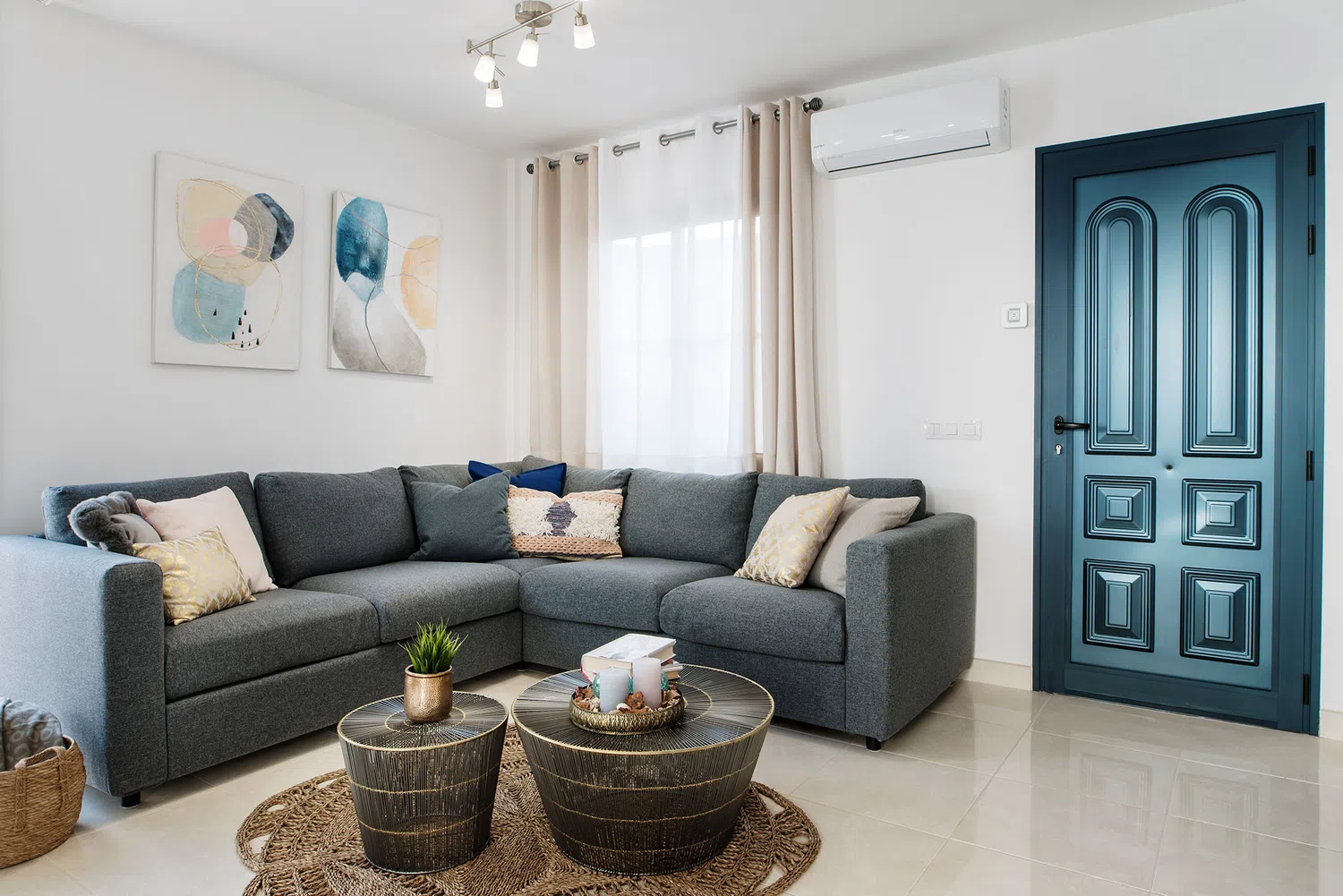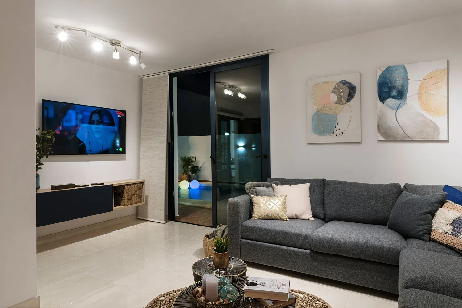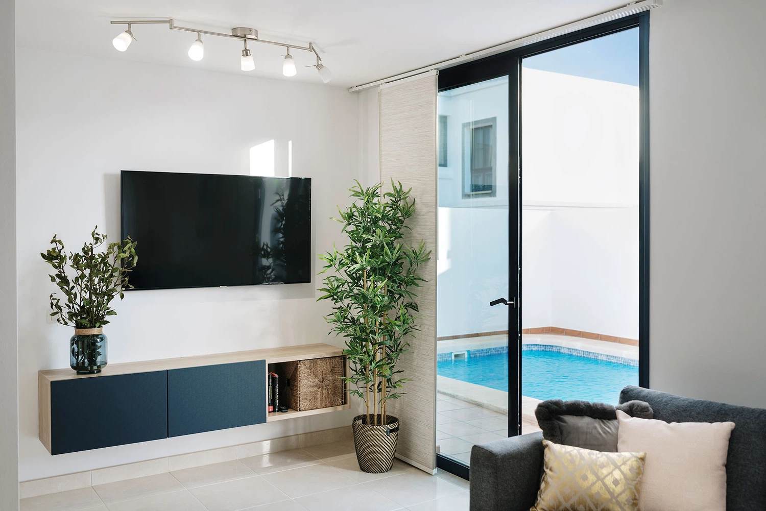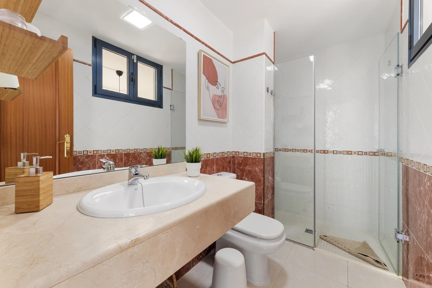 Salón con aire acondicionado con acceso exterior con un ventanal, wifi, smart tv. Baño