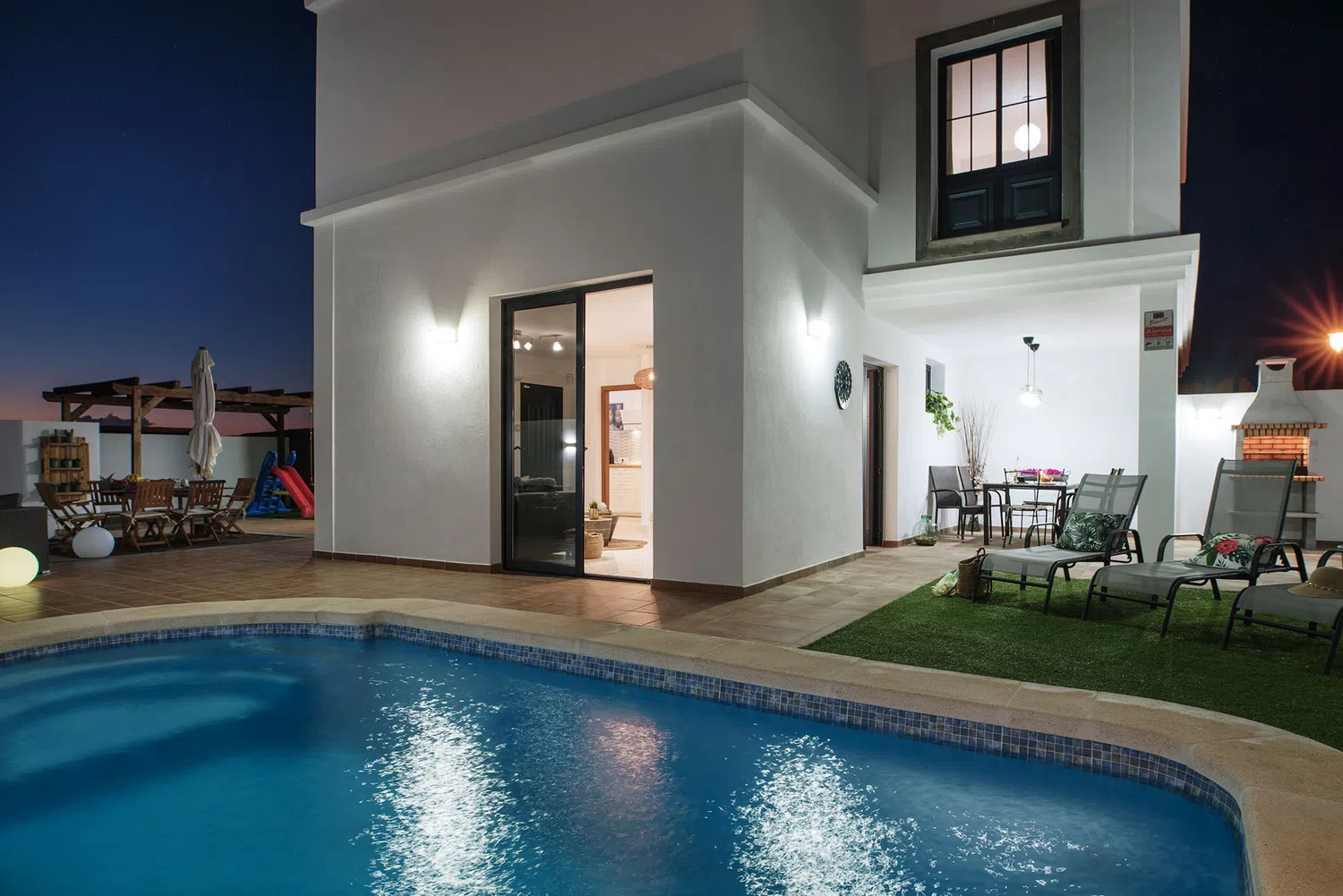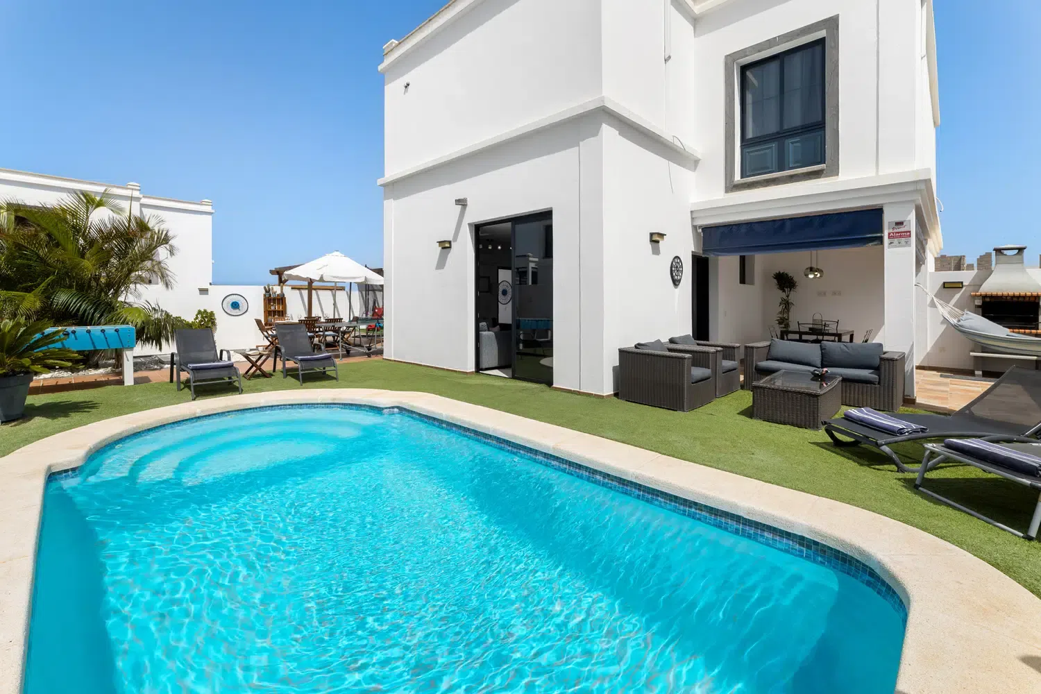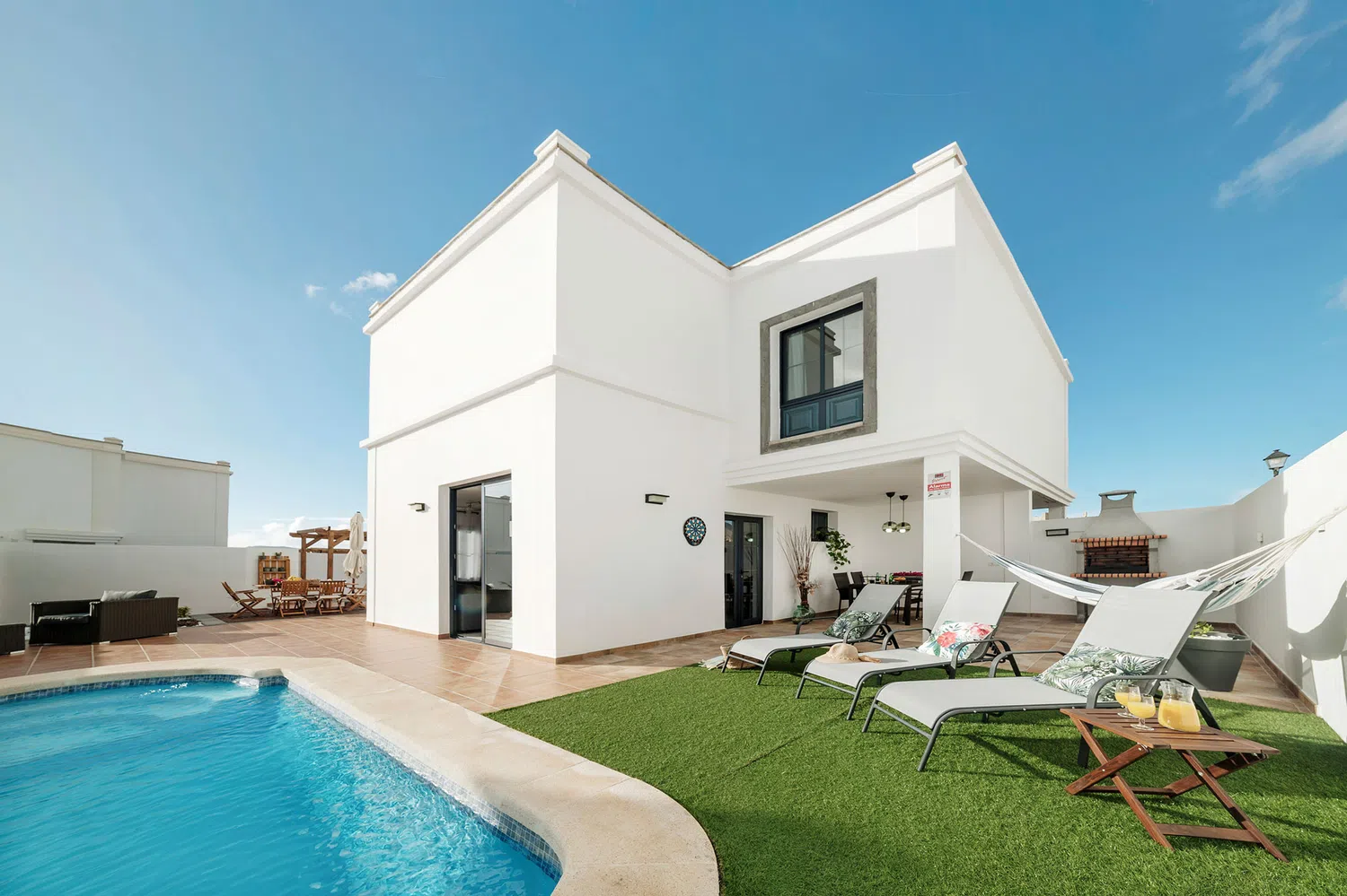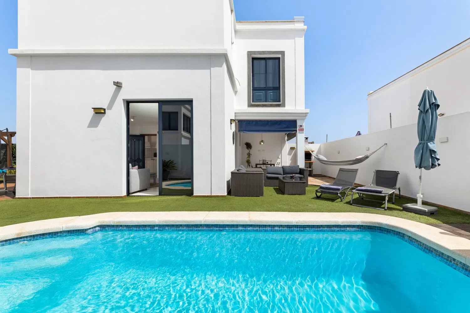 mesa y sillas zona de barbacoa y piscina privada rodeada de césped artificial. Además de