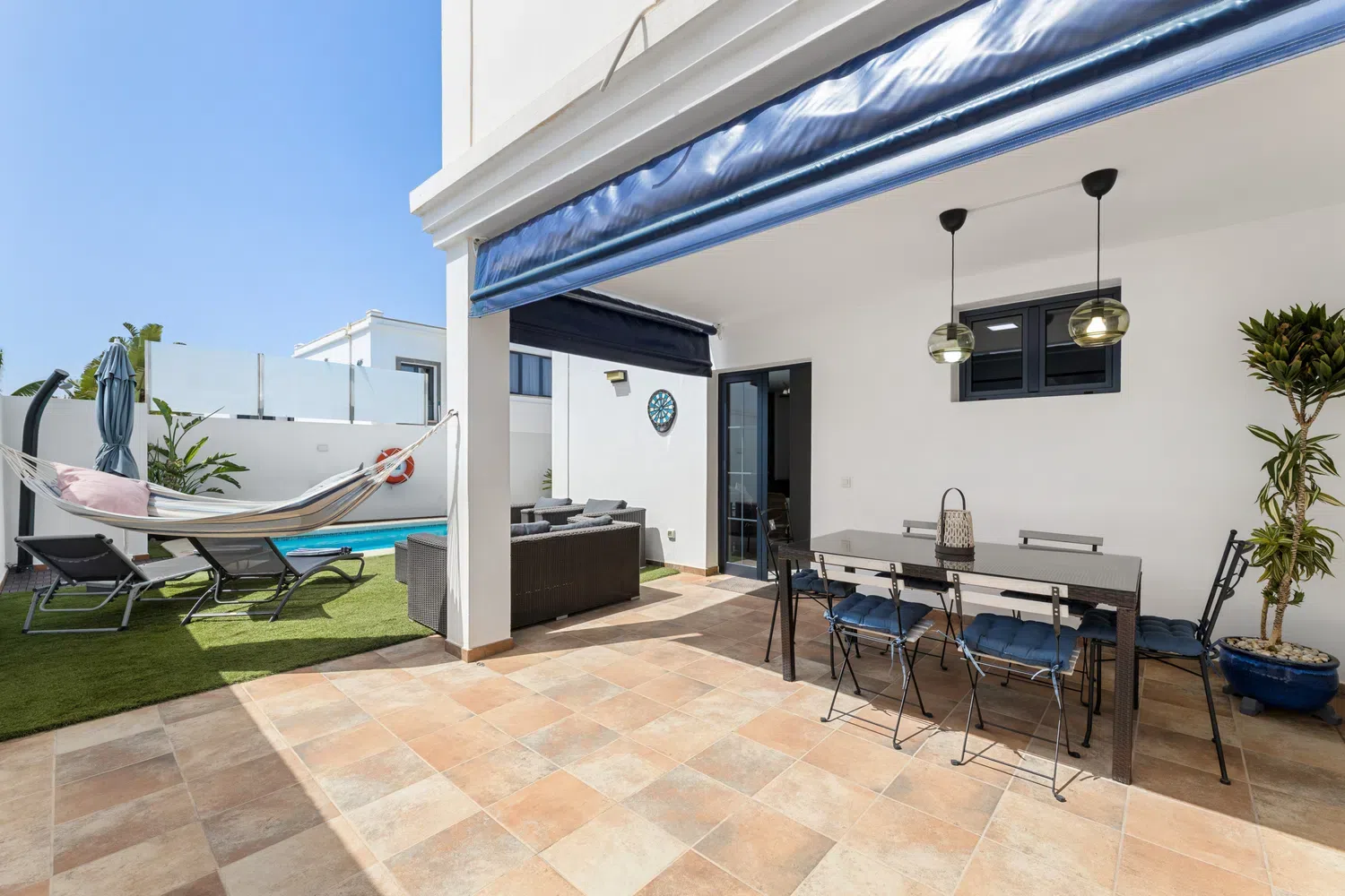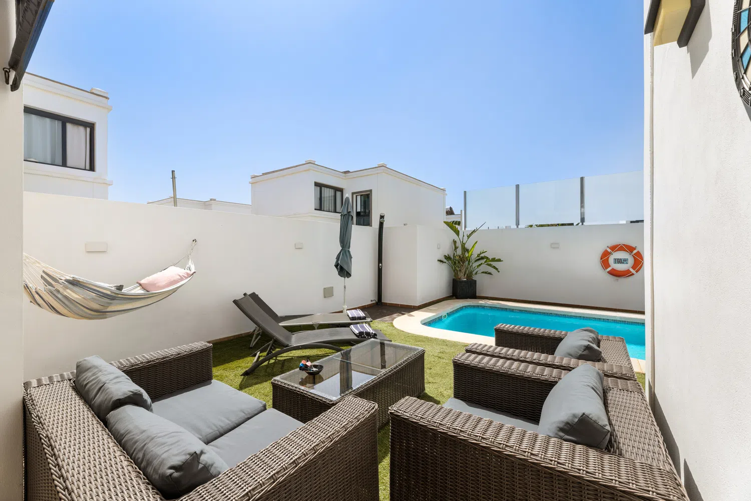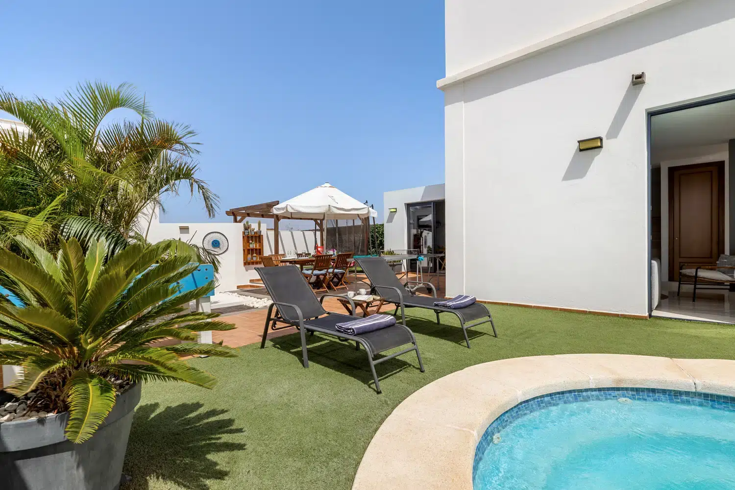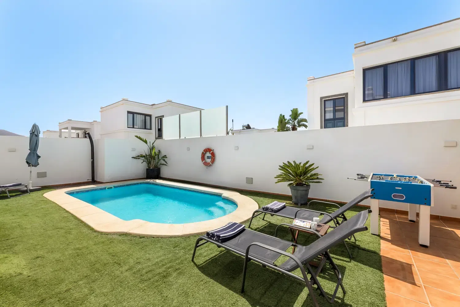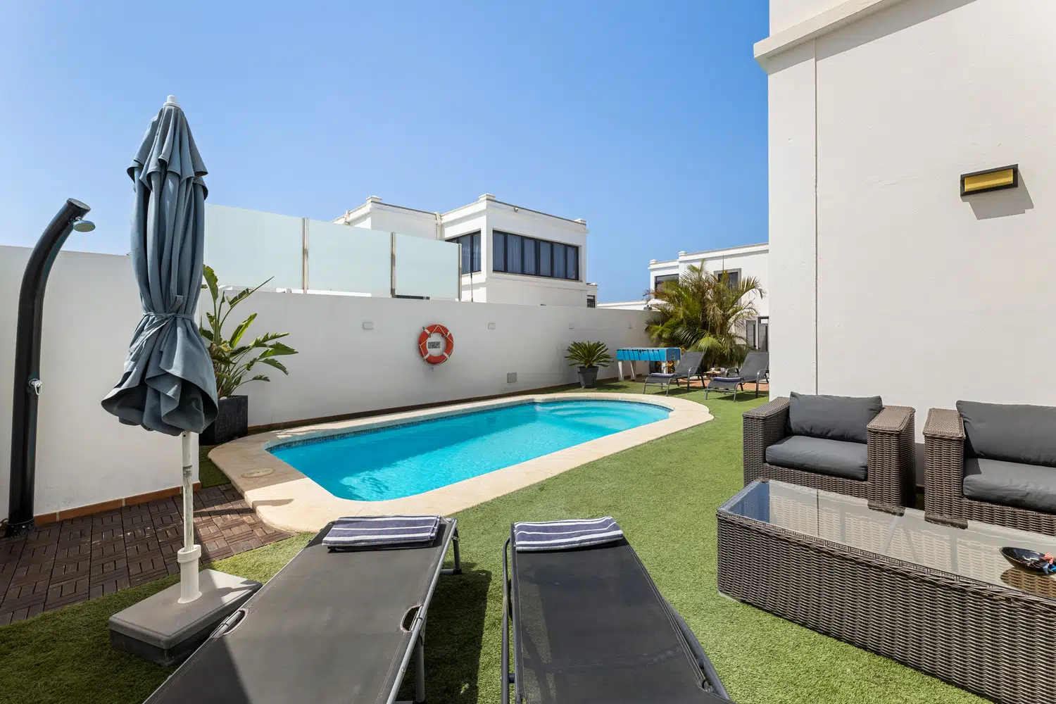 mesa y sillas zona de barbacoa y piscina privada rodeada de césped artificial. Además de