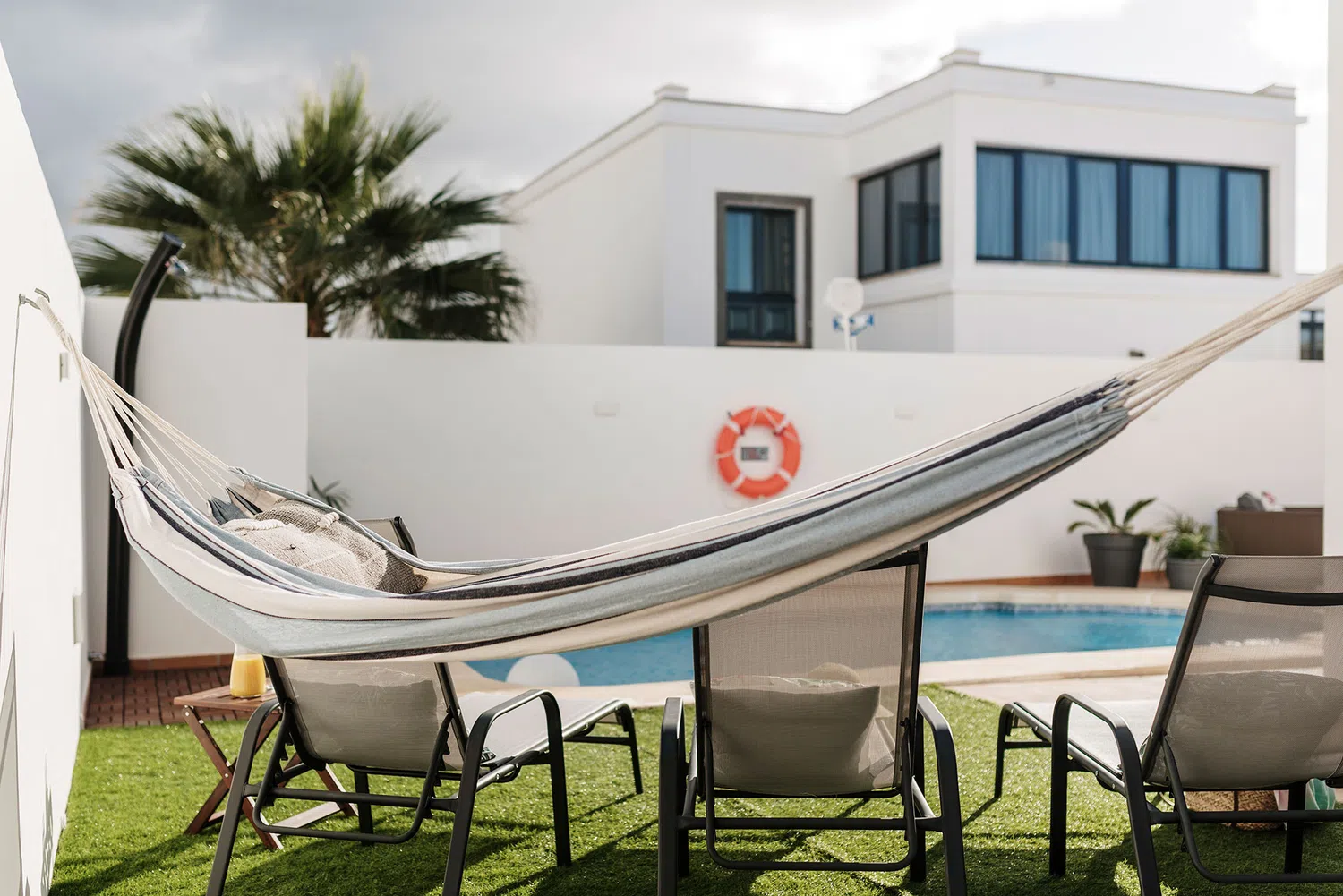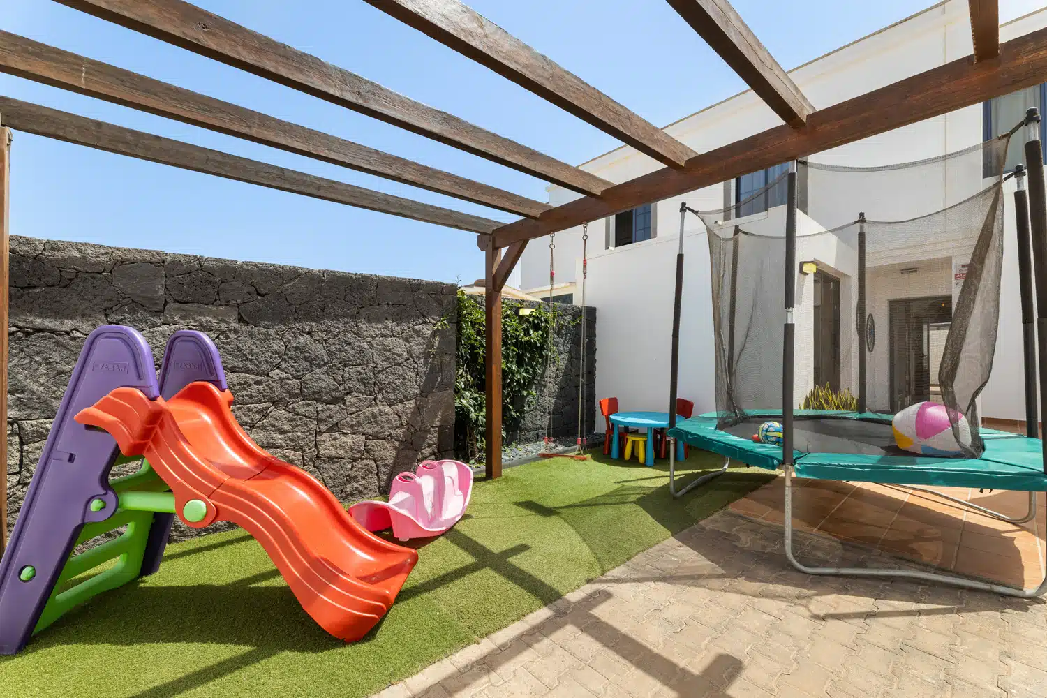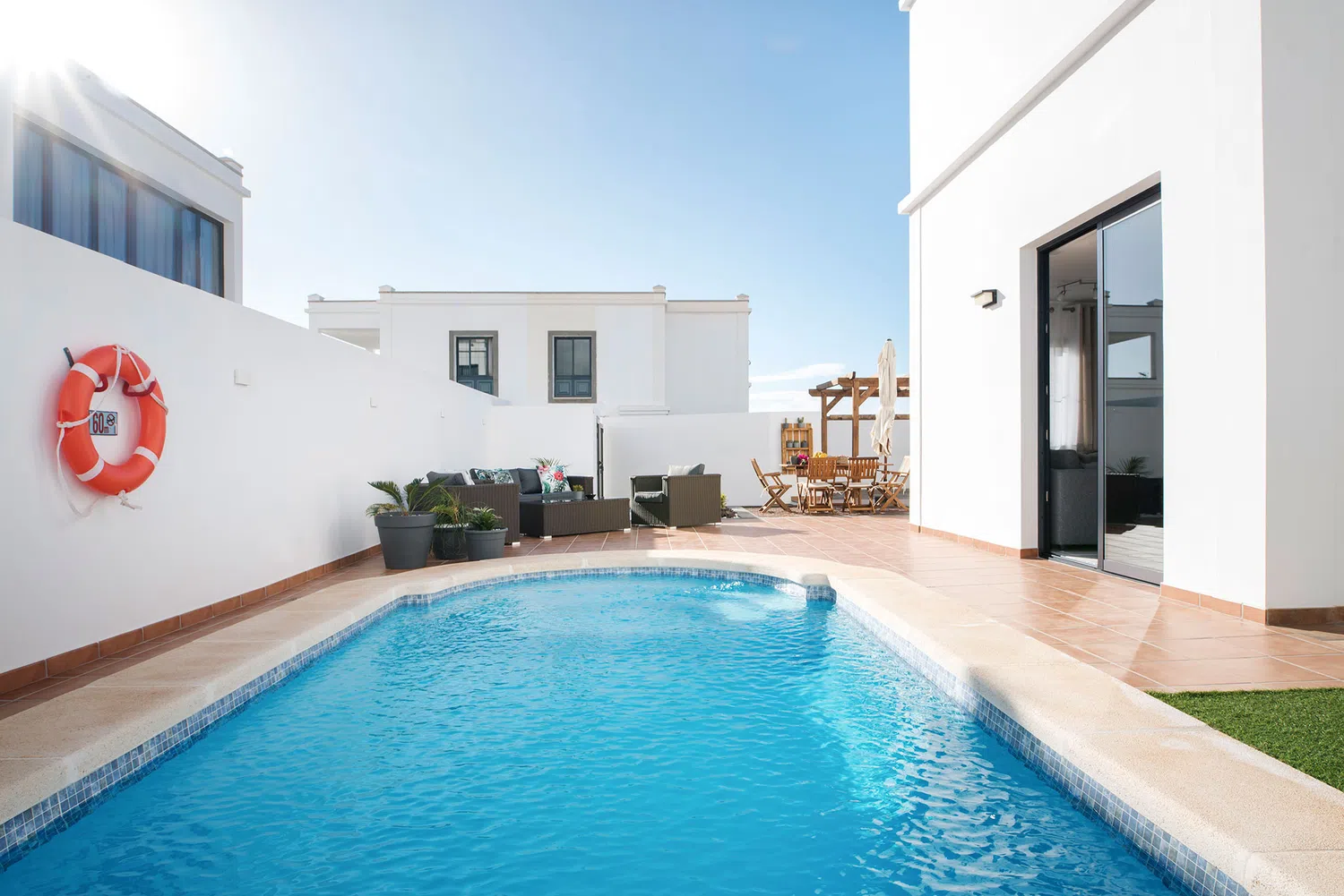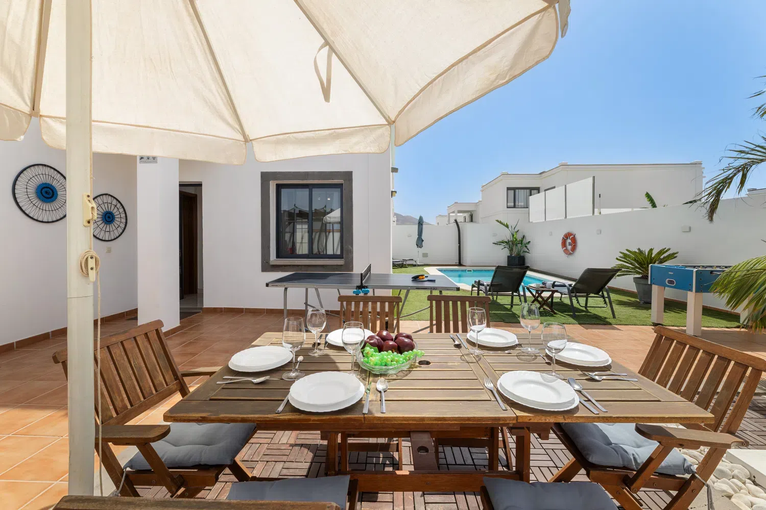 mesa y sillas zona de barbacoa y piscina privada rodeada de césped artificial. Además de