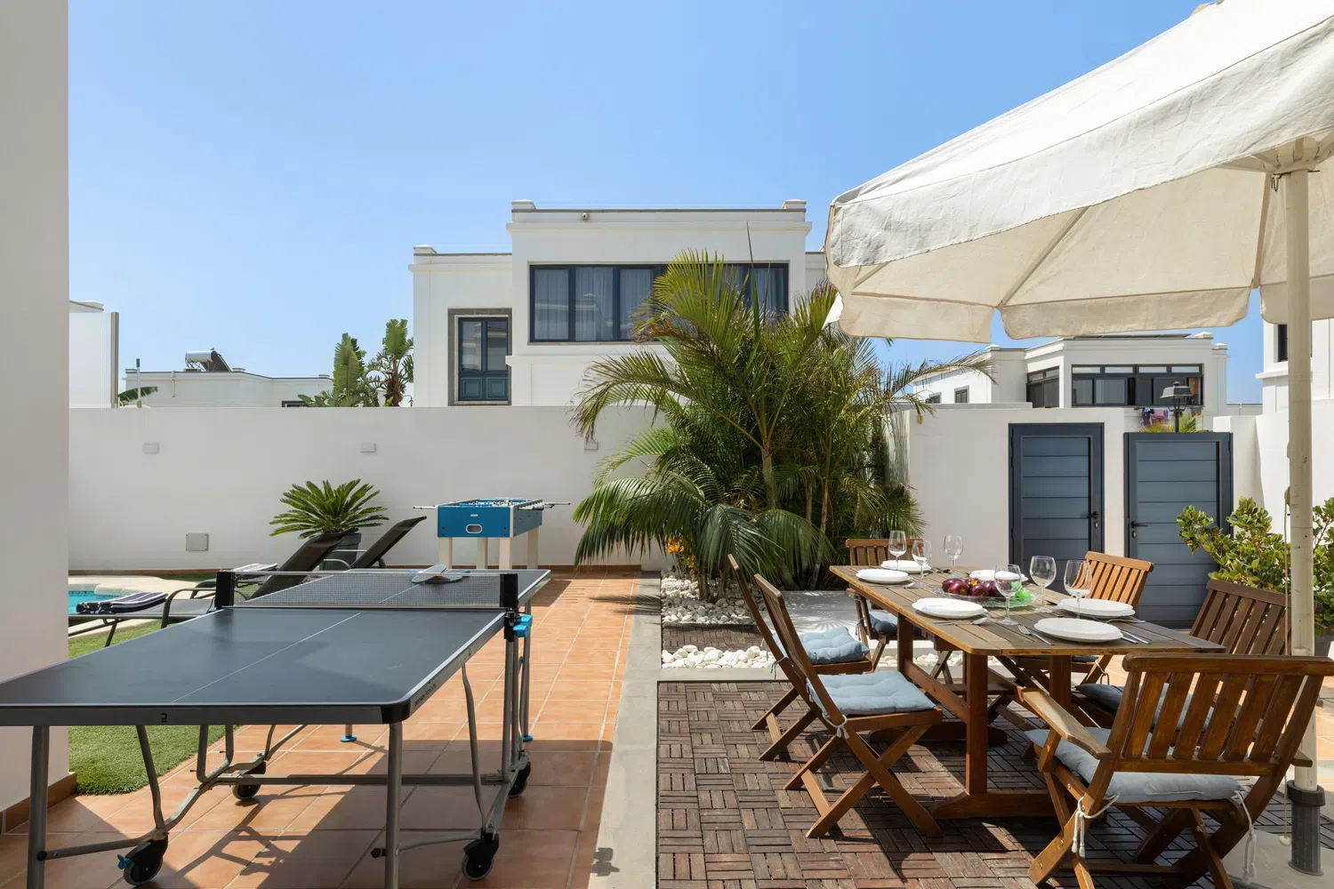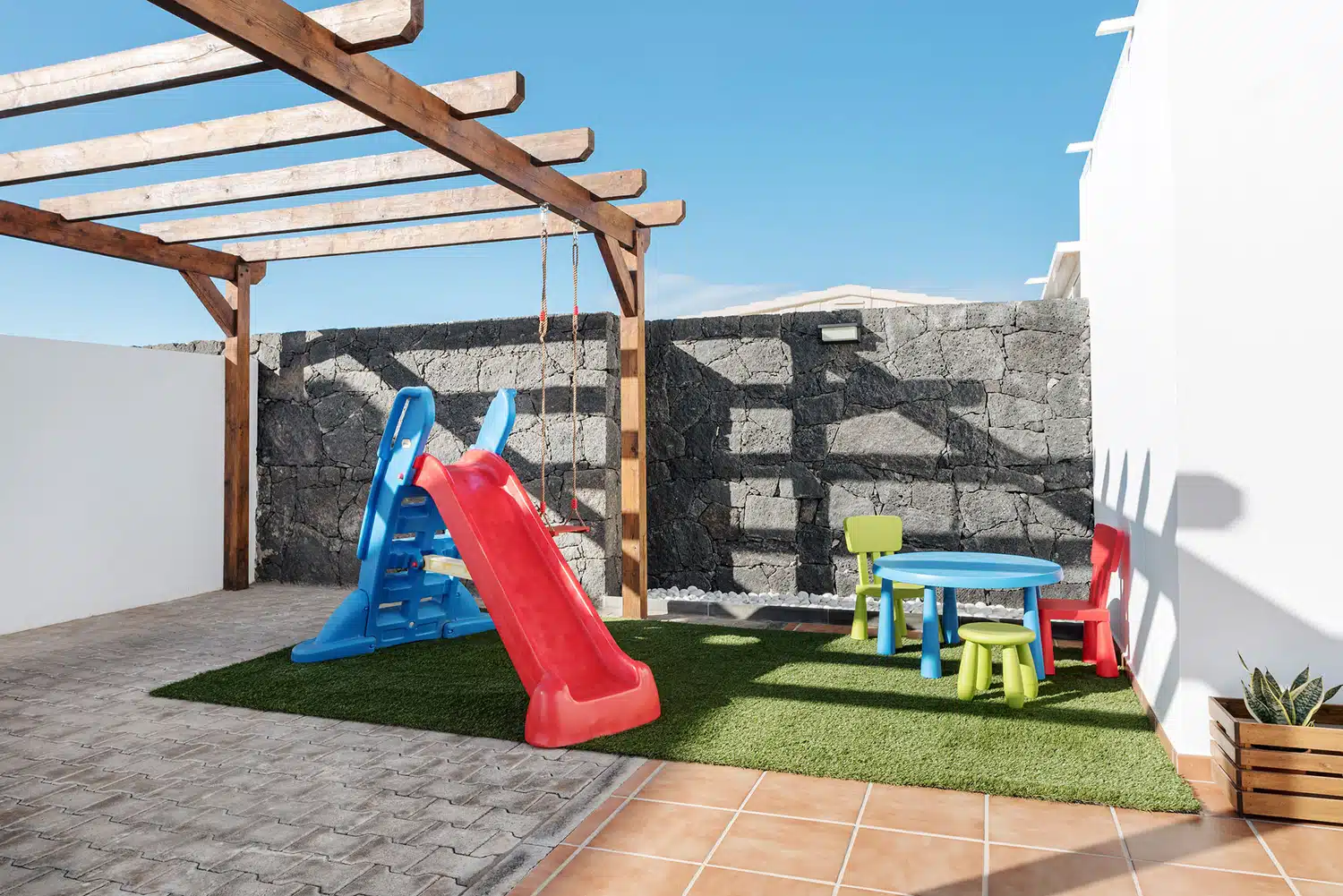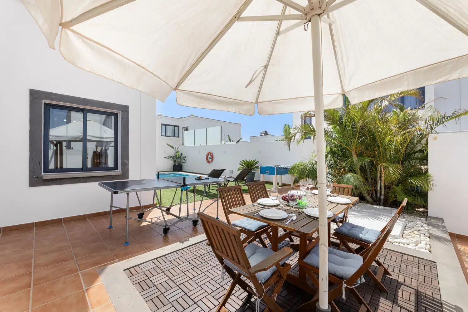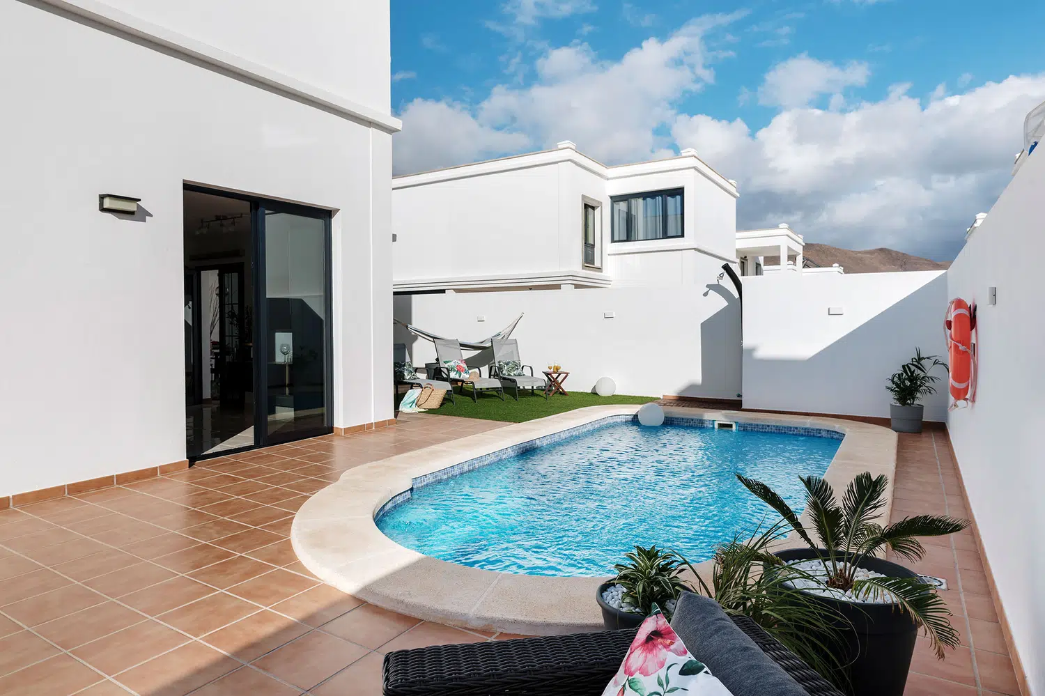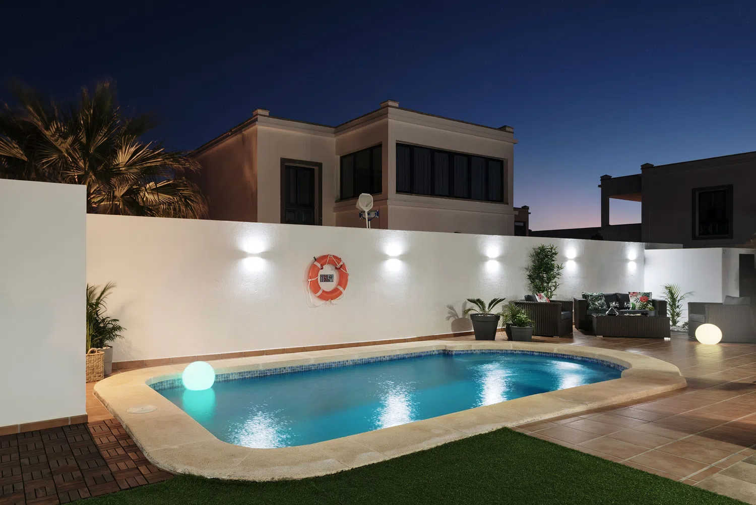 mesa y sillas zona de barbacoa y piscina privada rodeada de césped artificial. Además de