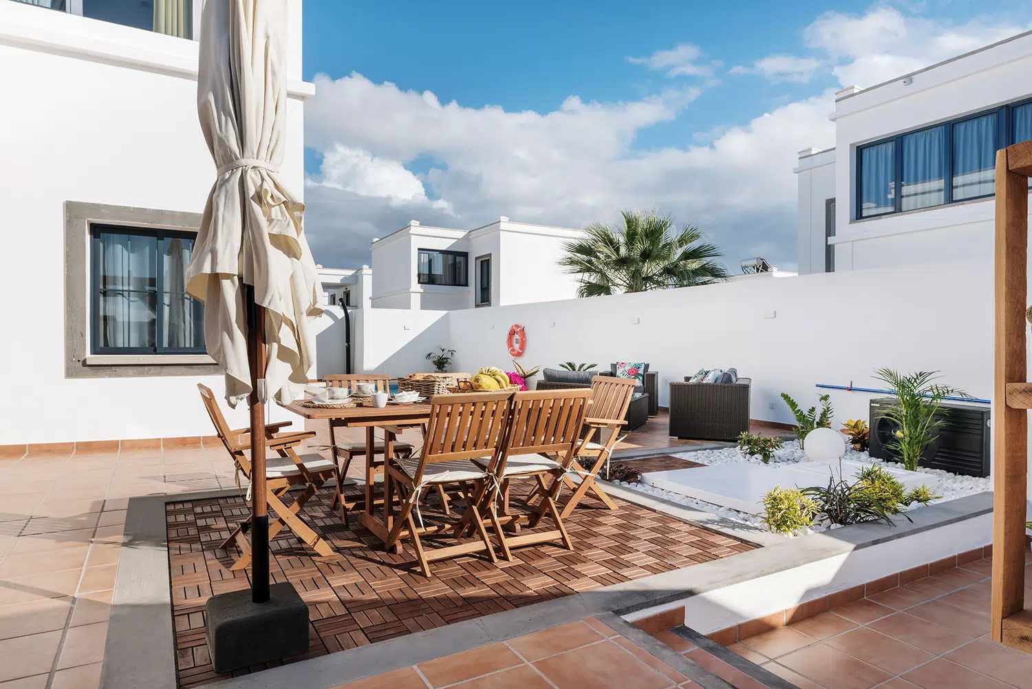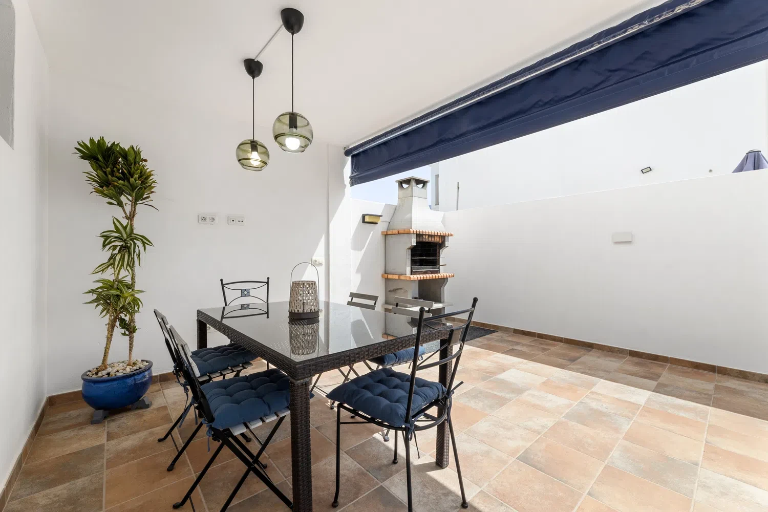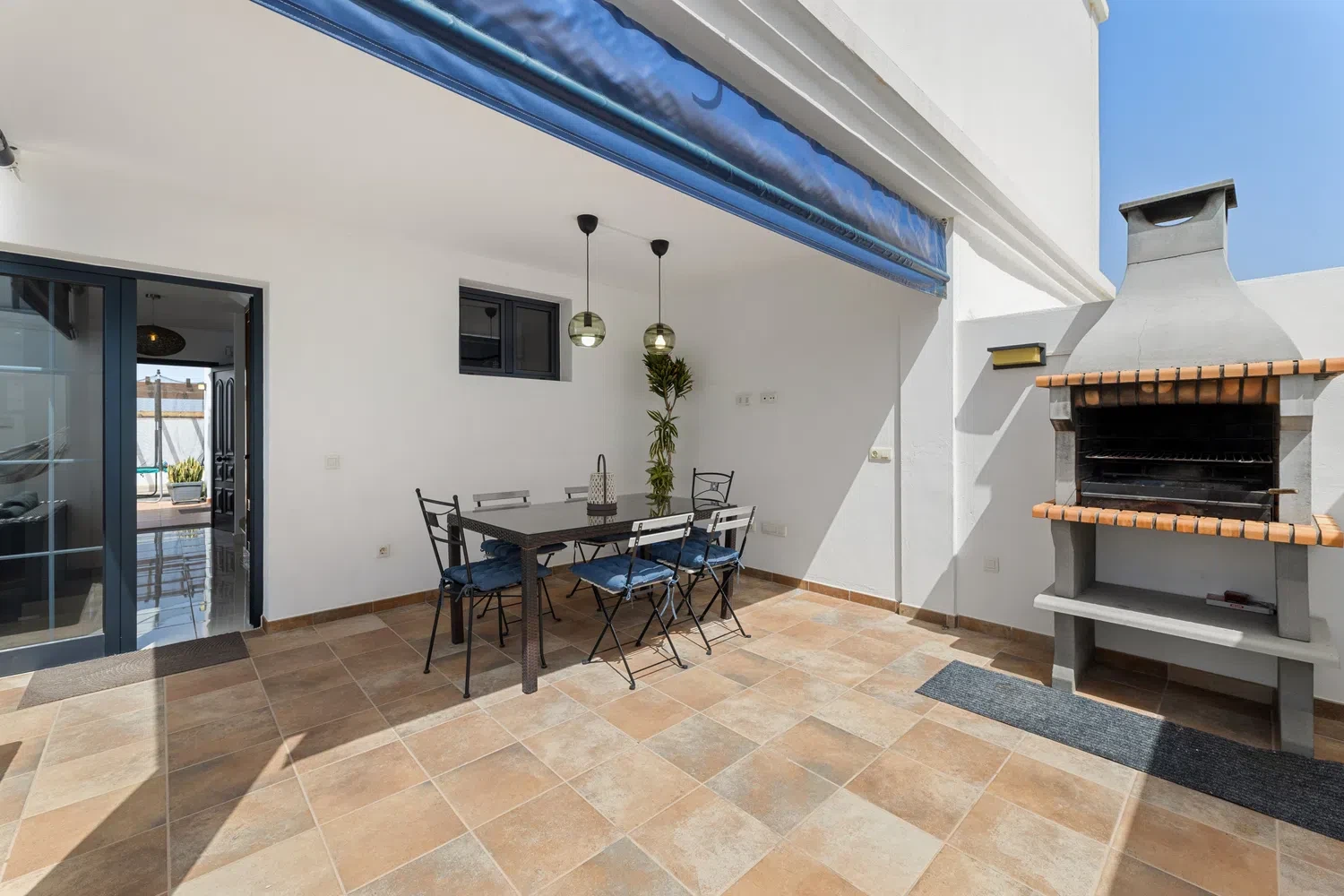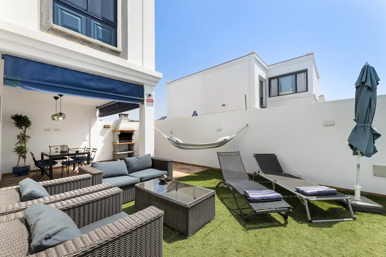 disfrutar en varios ambientes. Zona de relax con hamacas y sombrilla, terraza cubierta con