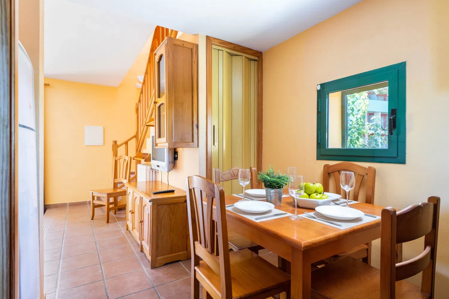 Cada apartamento dispone de salón comedor con cocina integrada. El salón dispone de TV y wifi gratuito para los clientes. La cocina es pequeña pero encontramos todo lo necesario para pasar unos días fuera de casa, vitrocerámica, lavadora, lavaplatos, horno eléctrico, microondas, nevera con congelador, cafetera de capsulas, cafetera de filtro, tostadora y kettle. En la planta baja al lado de la cocina hay un pequeño aseo , en su exterior una pequeña terraza privada con ducha exterior y zona para tender.