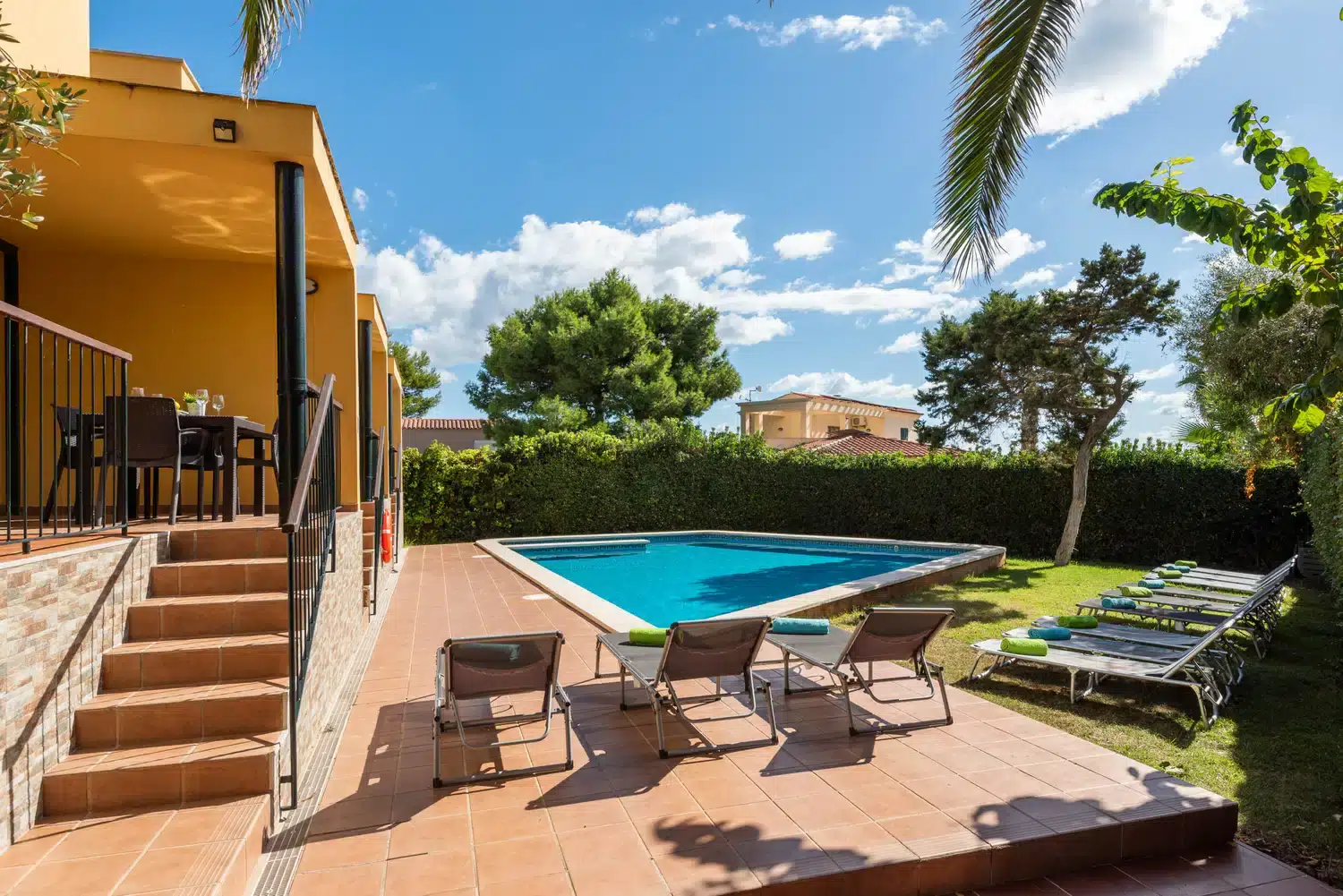 Se accede al interior de la vivienda desde una terraza, con mobiliario de mesa y sillas y BBQ de obra con vistas a la piscina y jardín donde podréis preparar sabrosas barbacoas y disfrutar de largos días de verano en familia.