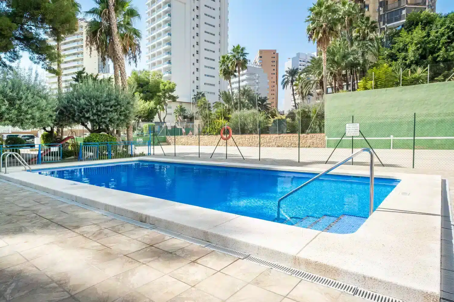 Dispone de ascensor, acceso a internet de alta velocidad por fibra (wifi), aire acondicionado, calefacción por bomba de calor, ventiladores de techo, 1 Televisor, plancha, piscina comunitaria + infantil abierta de temporada (01/06 al 30/09), jardín, parking al aire libre en mismo edificio sujeto a disponibilidad a la llegada, zona infantil.