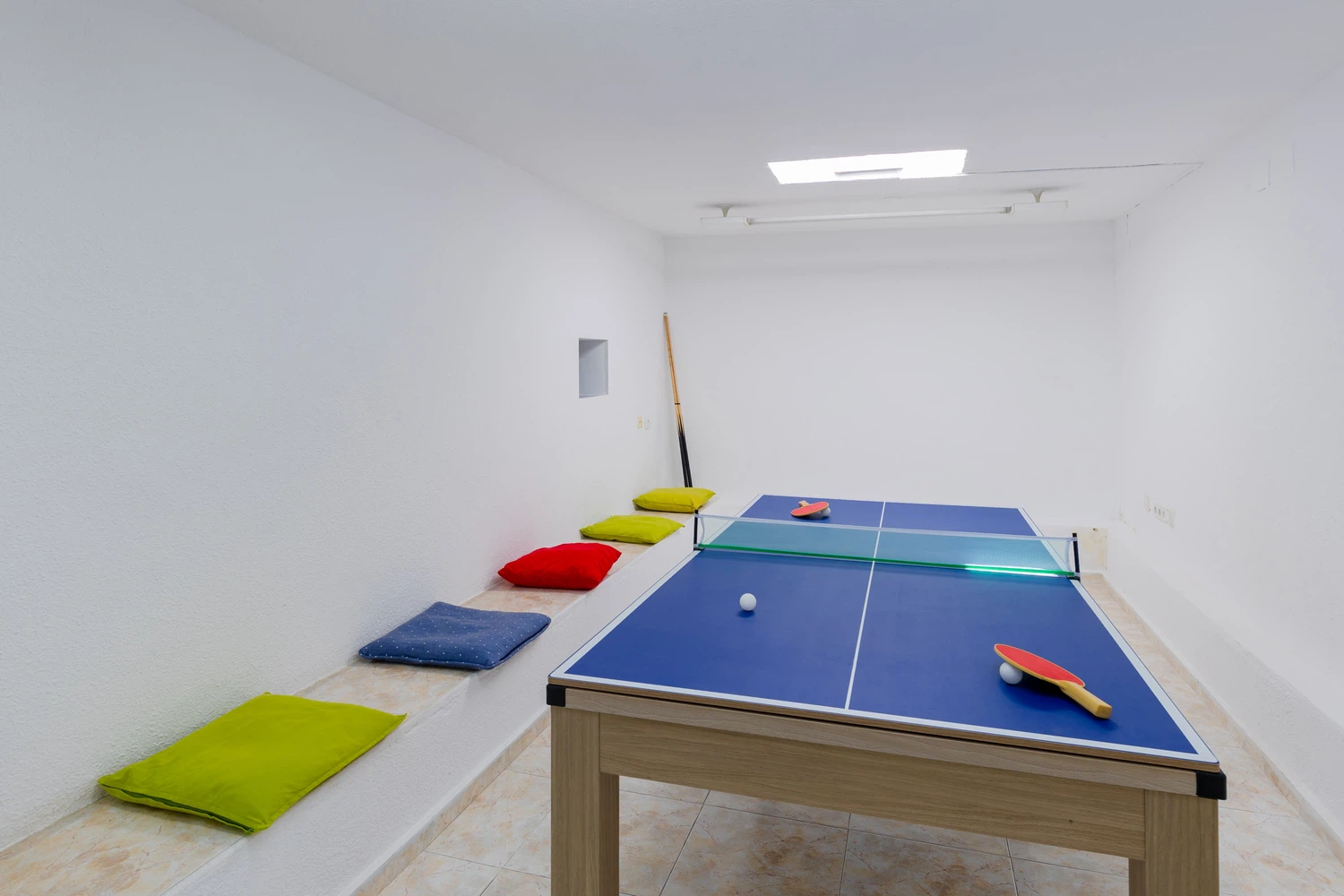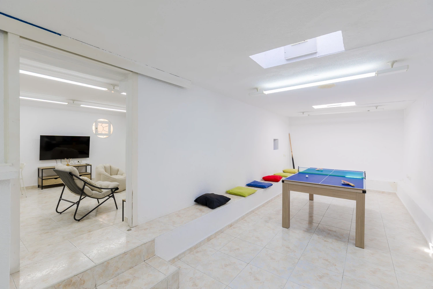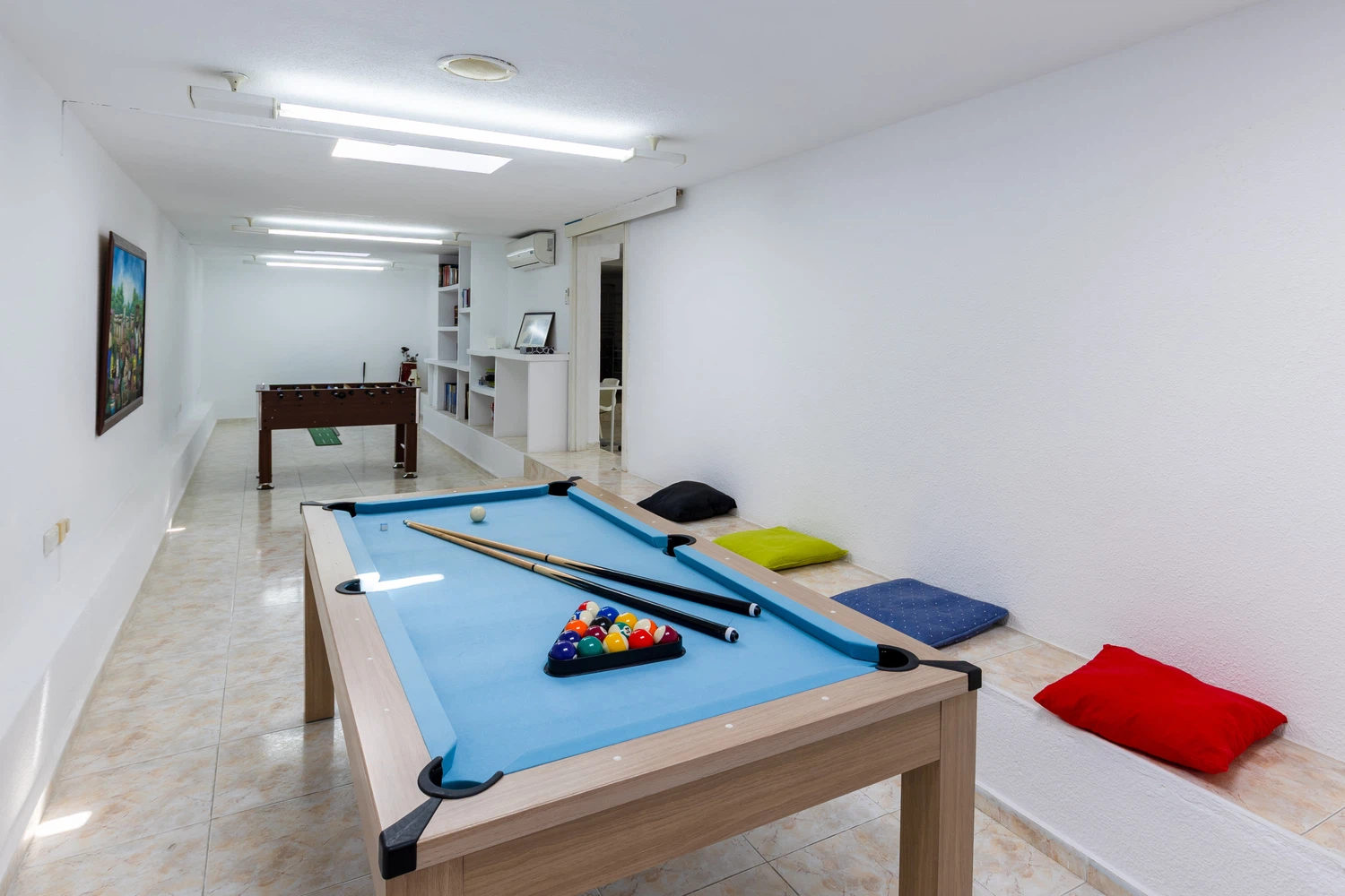 En la parte inferior , sala de juegos de mesa de ping pong y mesa de billar , futbolín y pati green para relajarte compartiendo juegos.