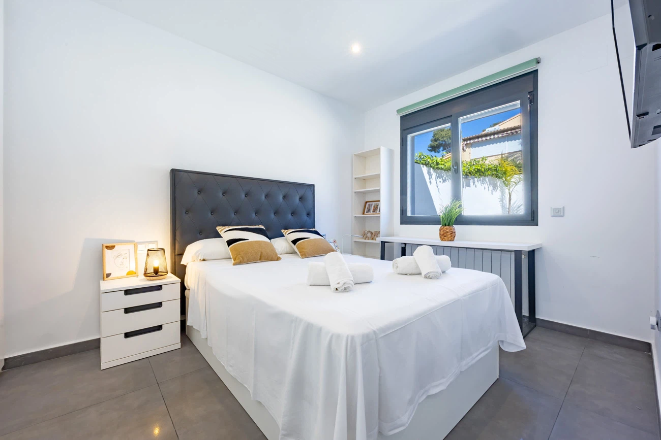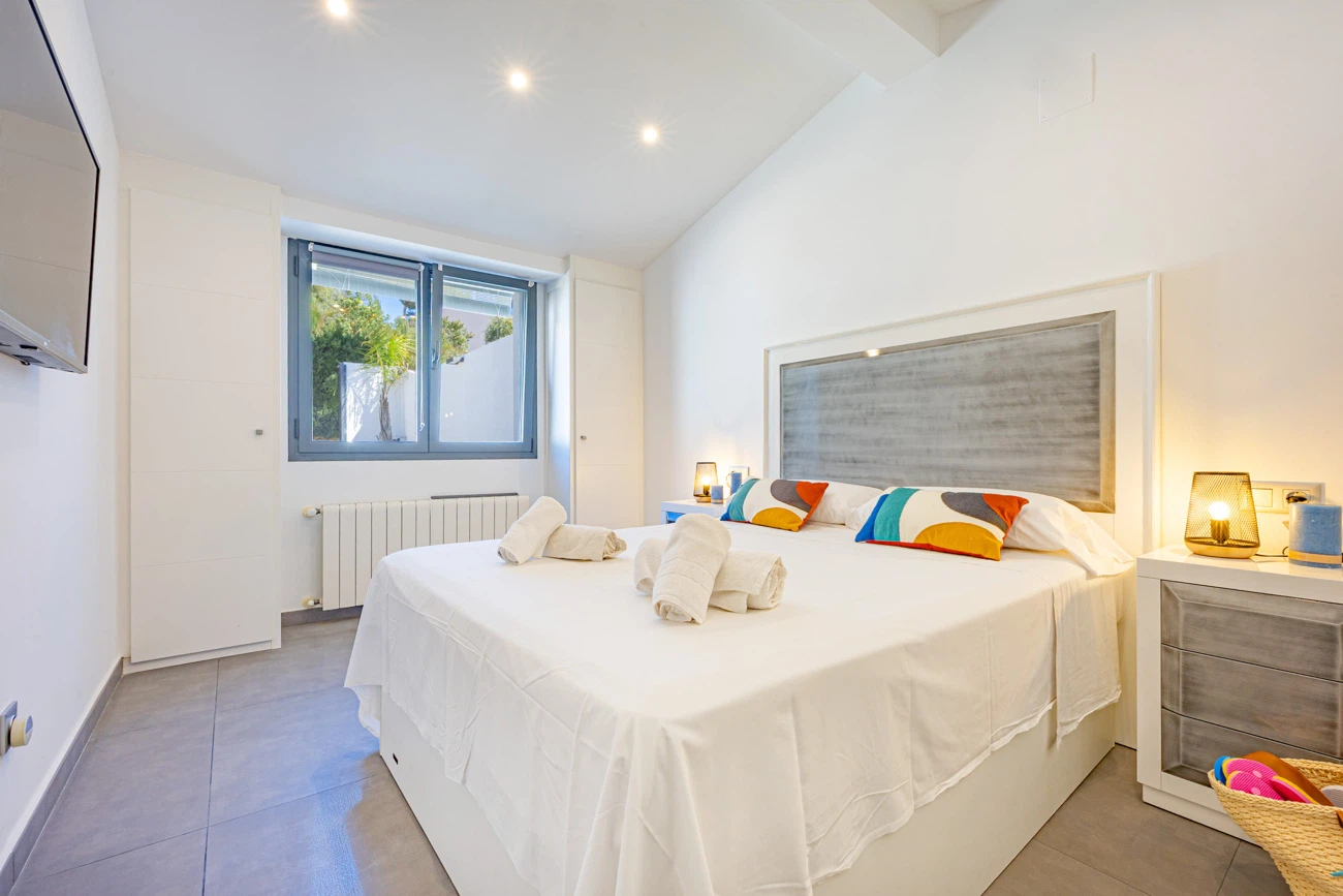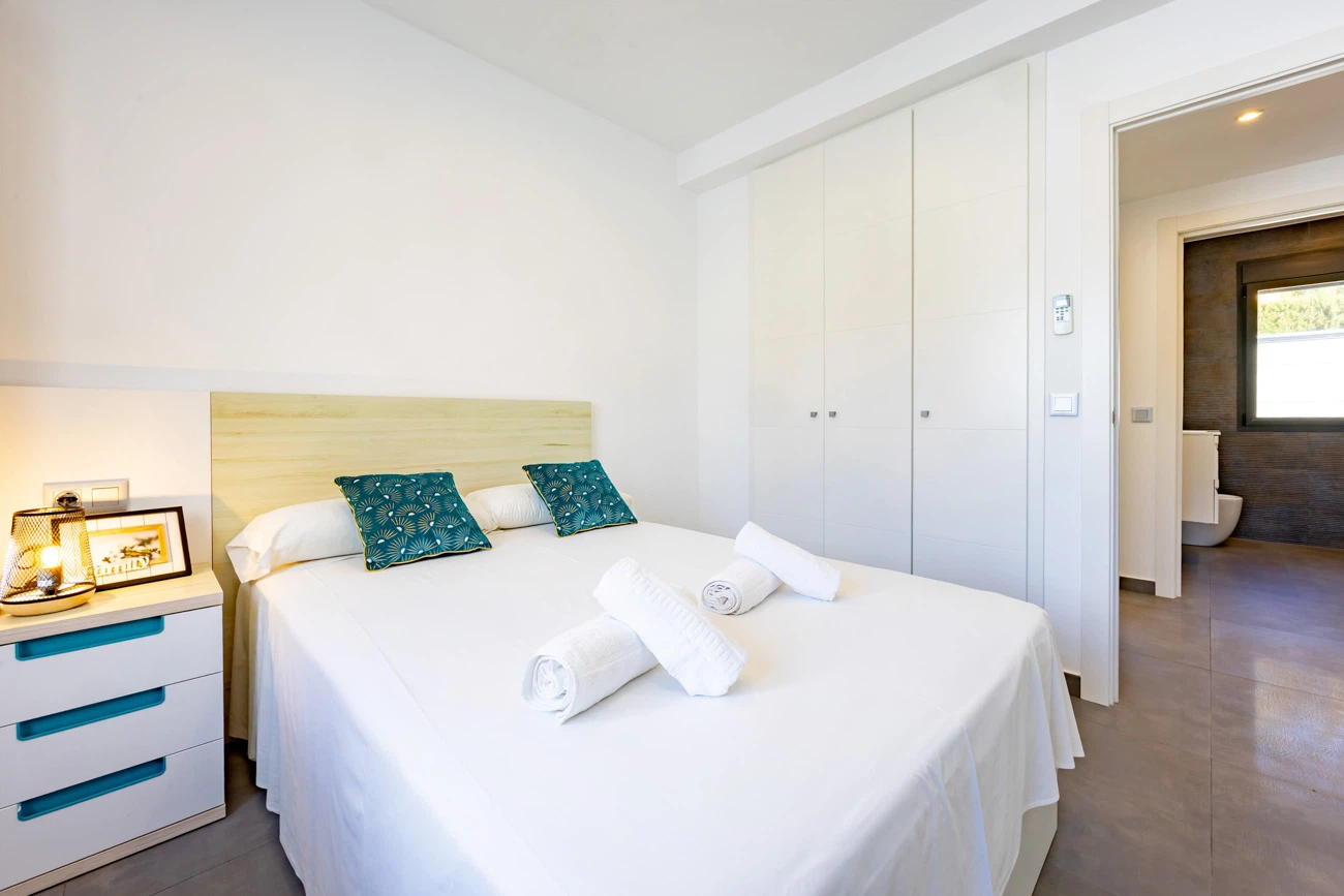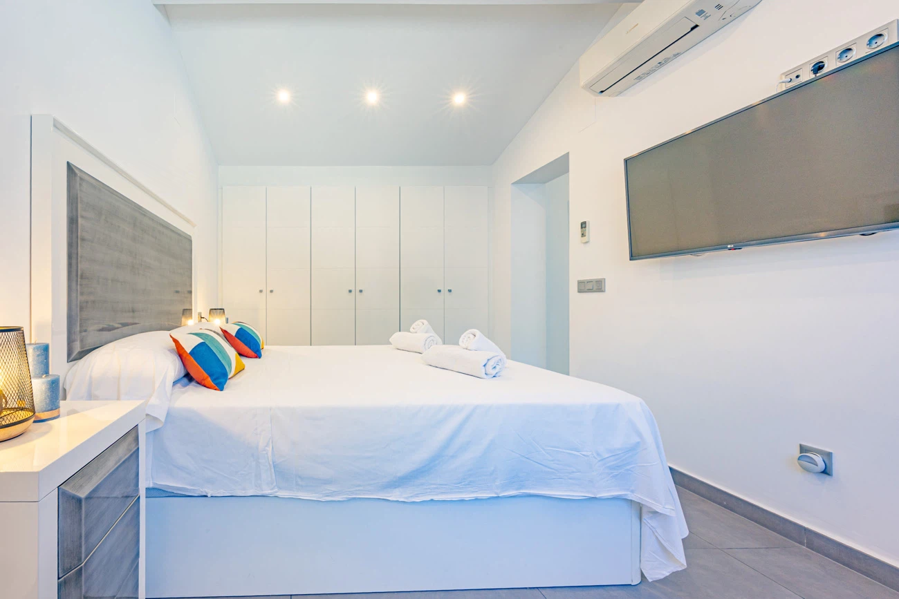 La villa cuenta con 3 amplios dormitorios, todos equipados con camas dobles de alta calidad para un descanso. Televisión individual en cada habitación. El dormitorio principal dispone de un exclusivo baño en suite equipado con ducha y bañera independiente. La casa ofrece un segundo baño completo con ducha para el resto de los invitados.