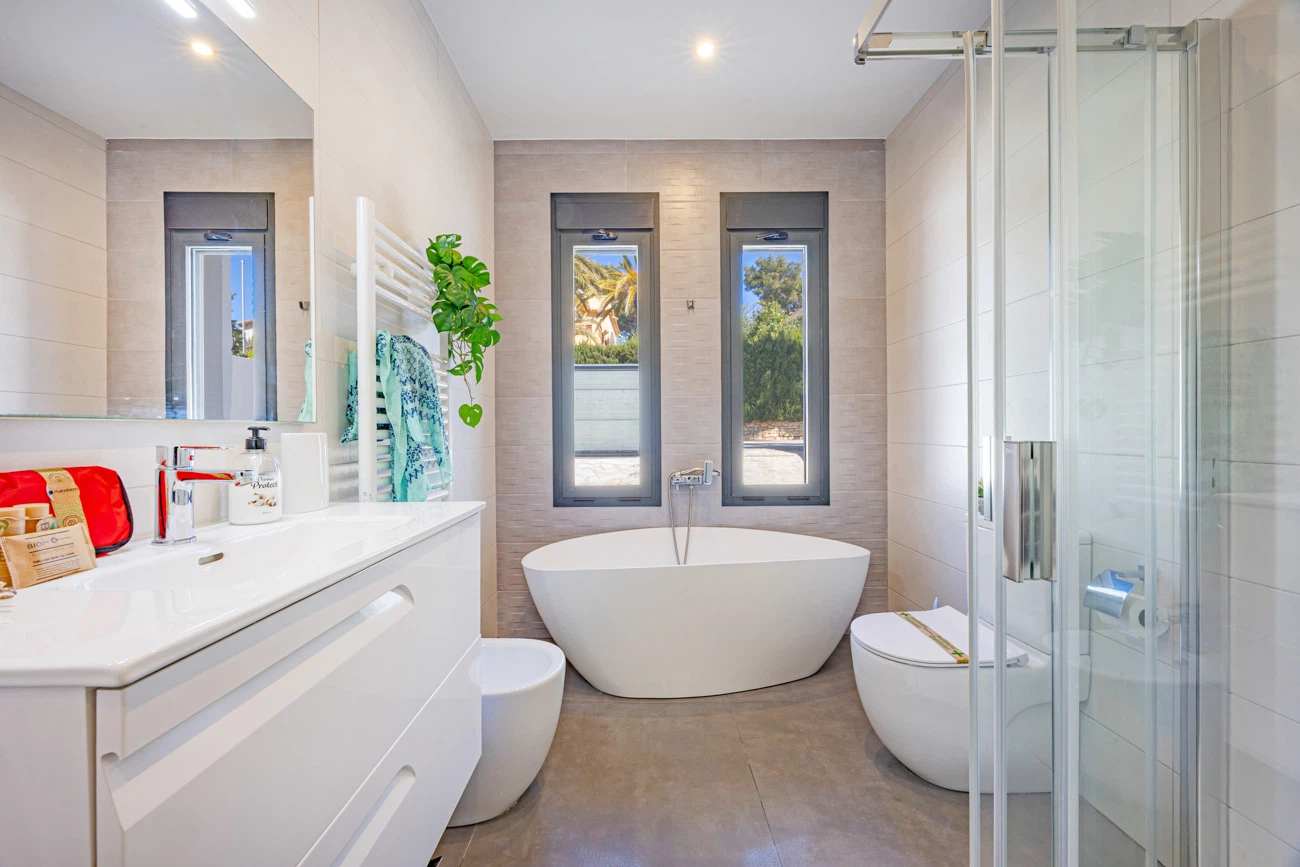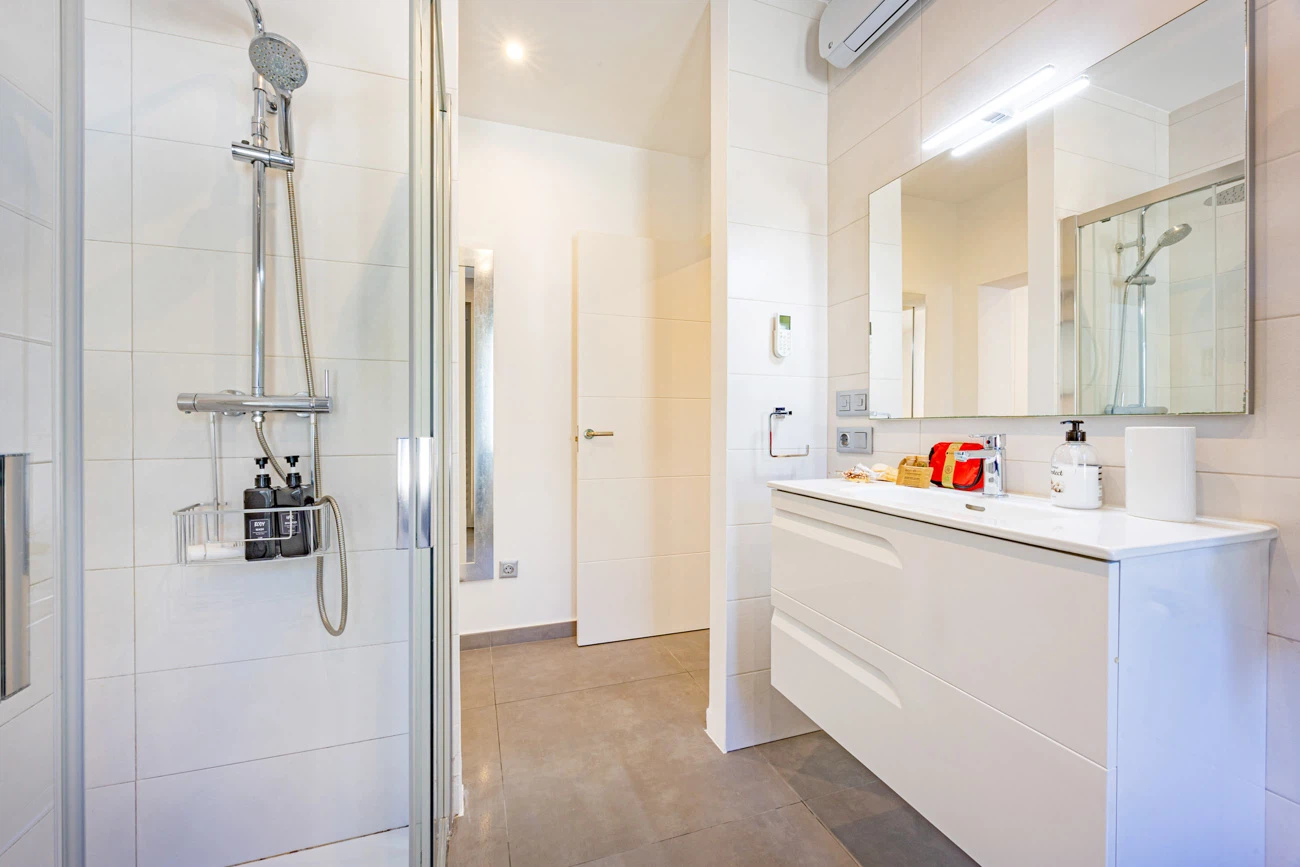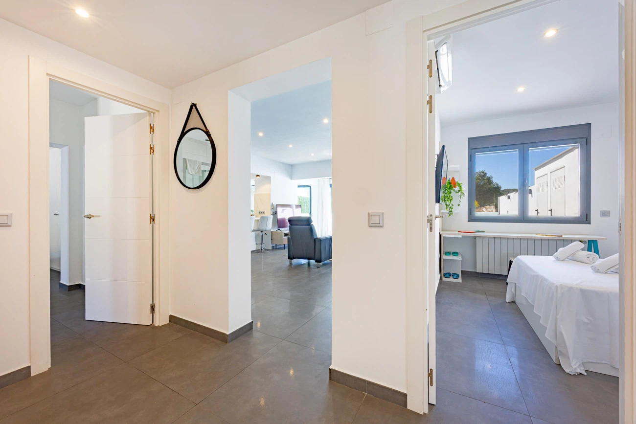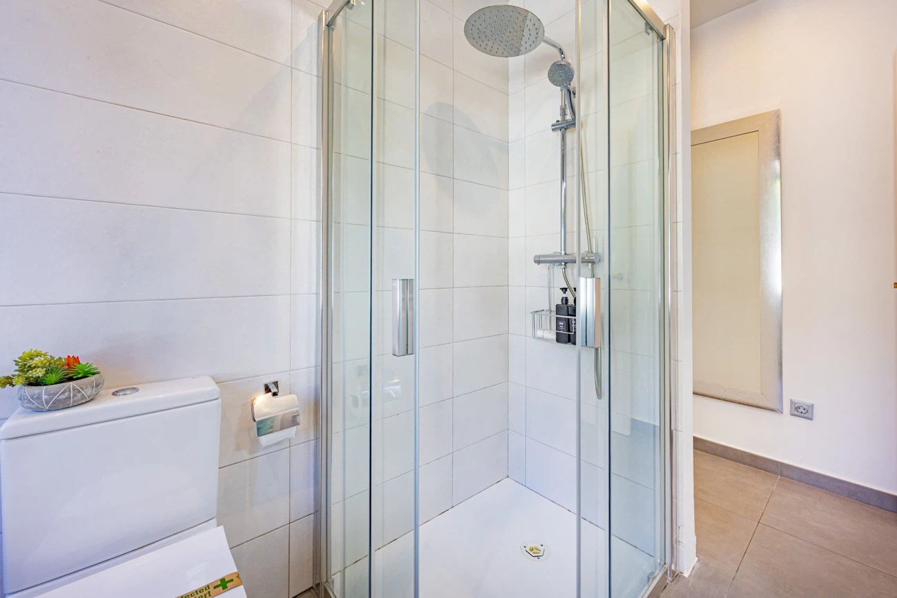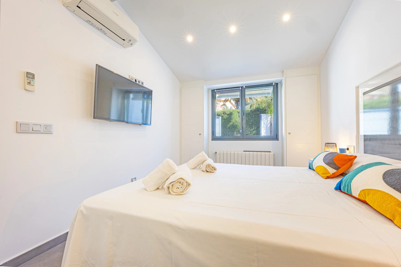 La villa cuenta con 3 amplios dormitorios, todos equipados con camas dobles de alta calidad para un descanso. Televisión individual en cada habitación. El dormitorio principal dispone de un exclusivo baño en suite equipado con ducha y bañera independiente. La casa ofrece un segundo baño completo con ducha para el resto de los invitados.