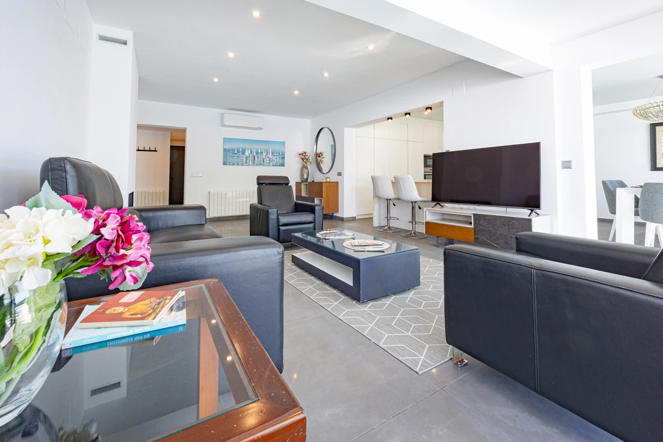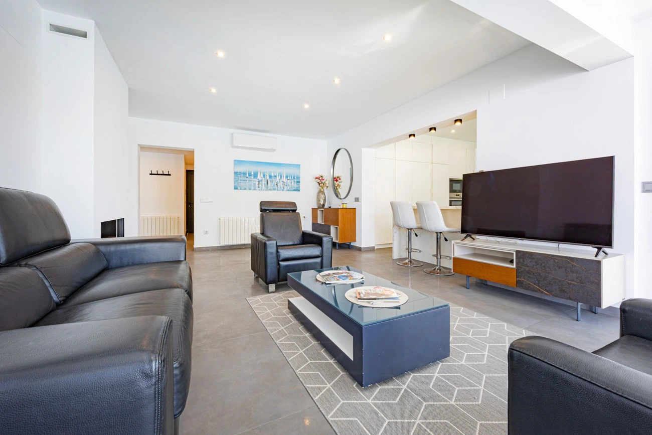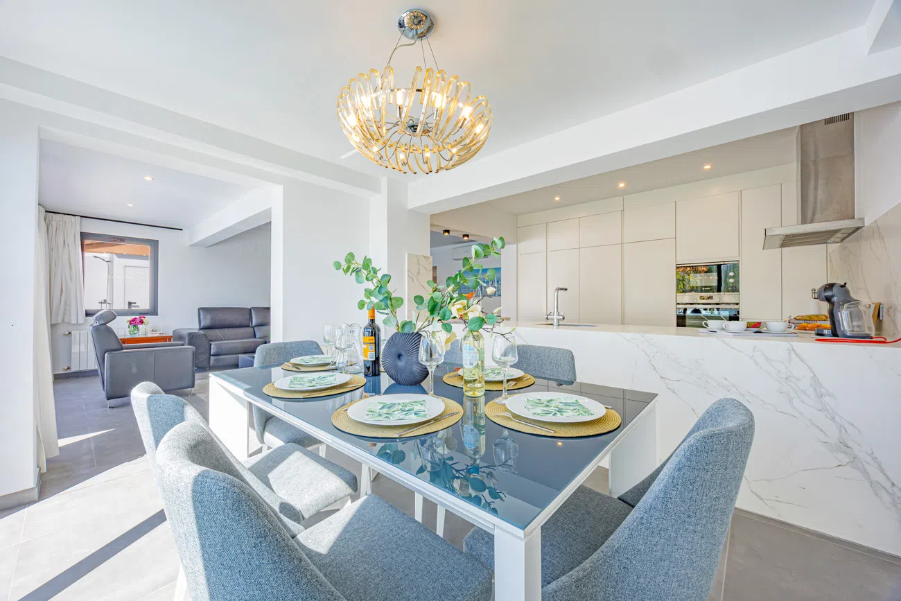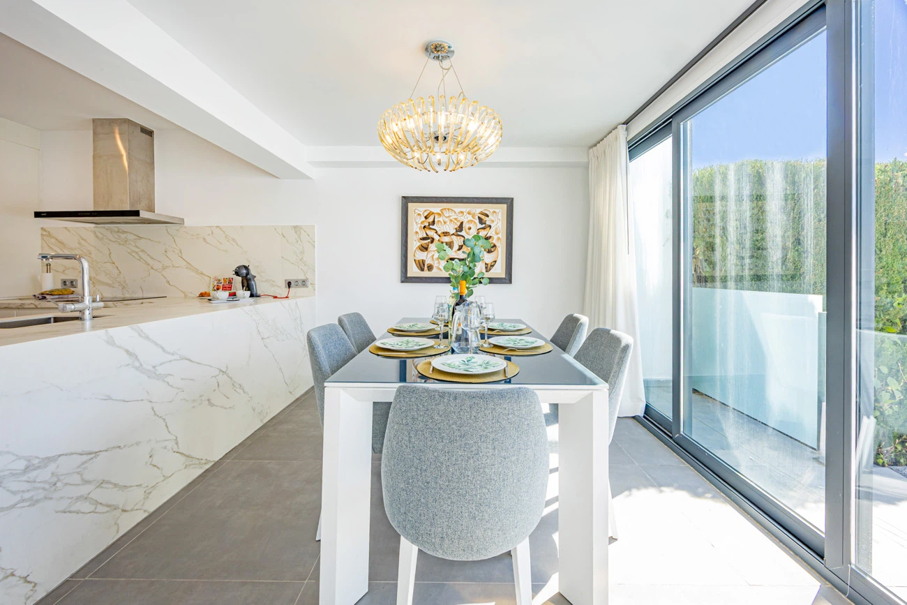 El corazón de la casa es su salón-comedor de diseño contemporáneo. Gracias a sus grandes ventanales, el espacio se inunda de luz natural y ofrece una transición directa a la terraza principal. La cocina americana totalmente equipada cuenta con una moderna barra/banco, el rincón ideal para disfrutar de los desayunos o compartir una copa de vino mientras se cocina.