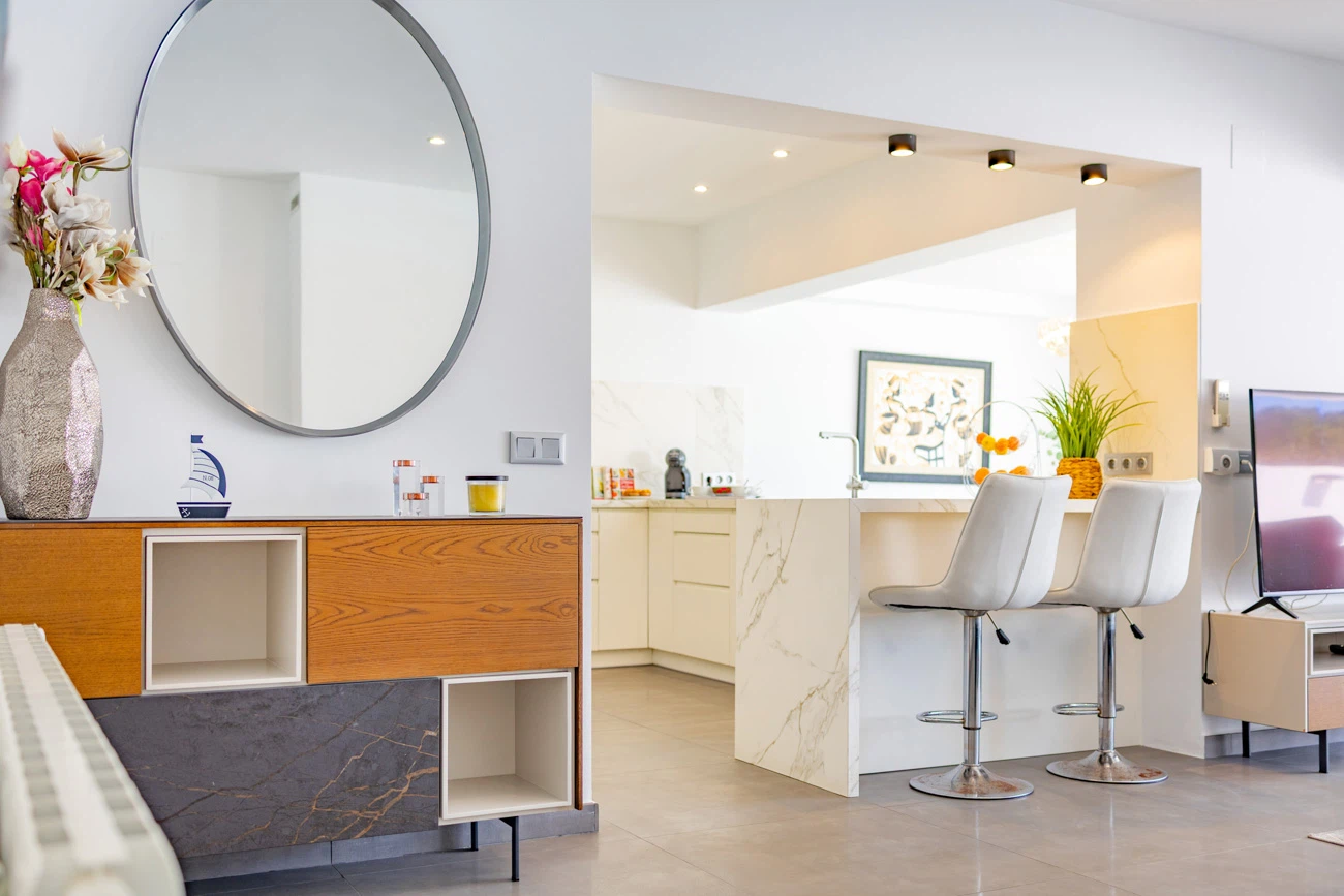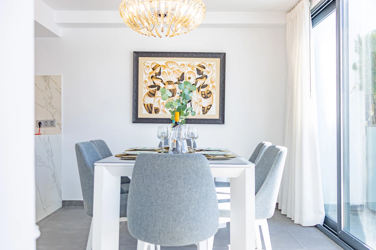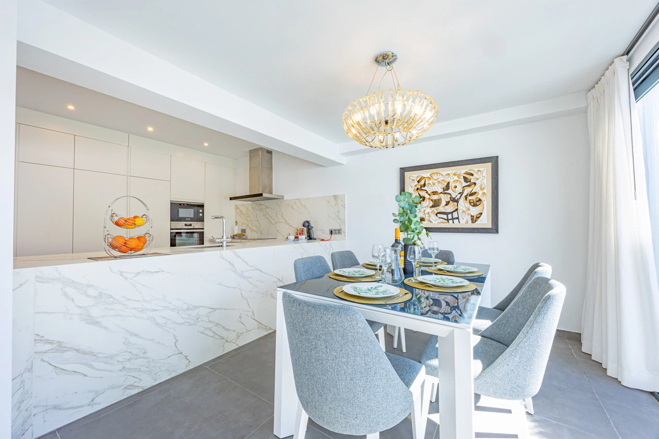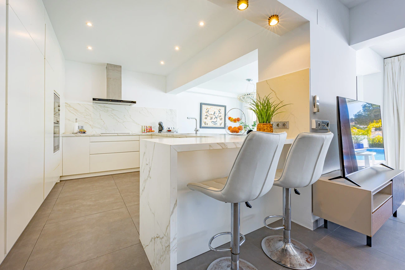 El corazón de la casa es su salón-comedor de diseño contemporáneo. Gracias a sus grandes ventanales, el espacio se inunda de luz natural y ofrece una transición directa a la terraza principal. La cocina americana totalmente equipada cuenta con una moderna barra/banco, el rincón ideal para disfrutar de los desayunos o compartir una copa de vino mientras se cocina.