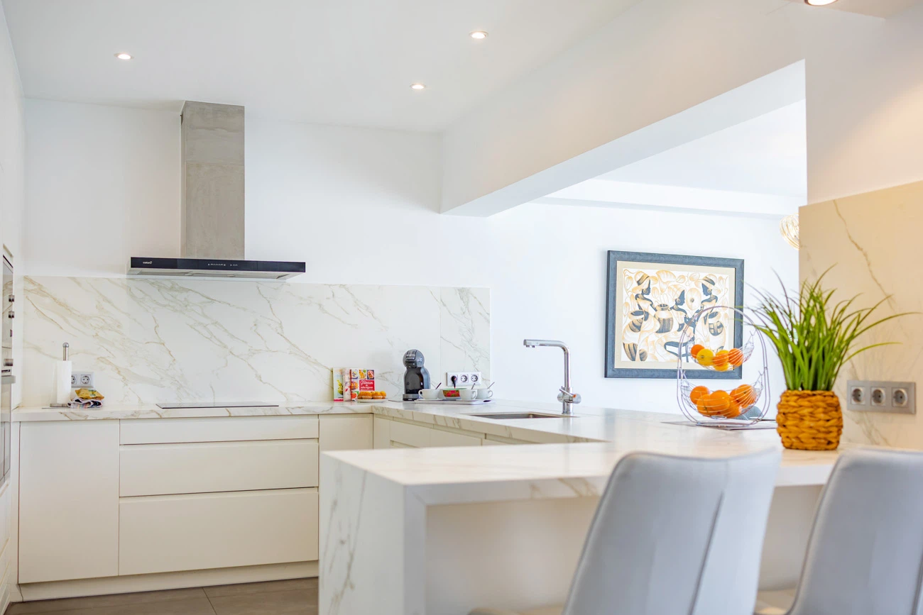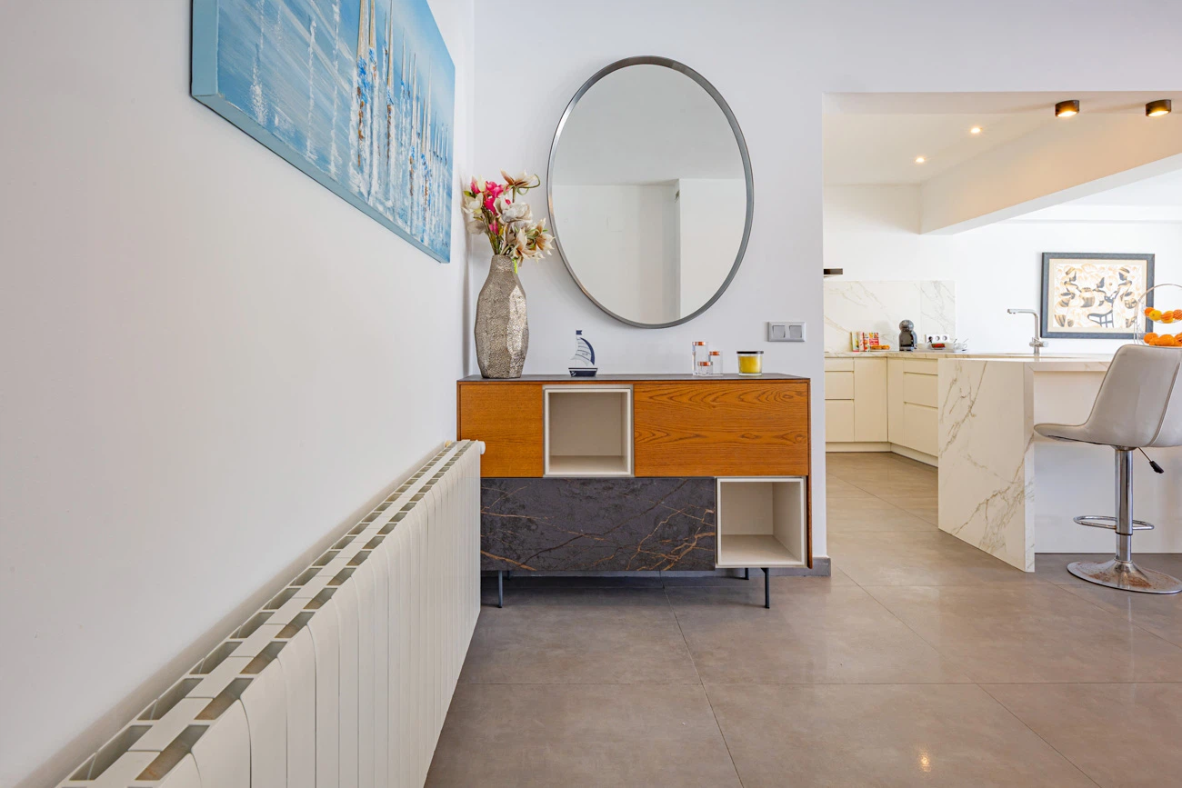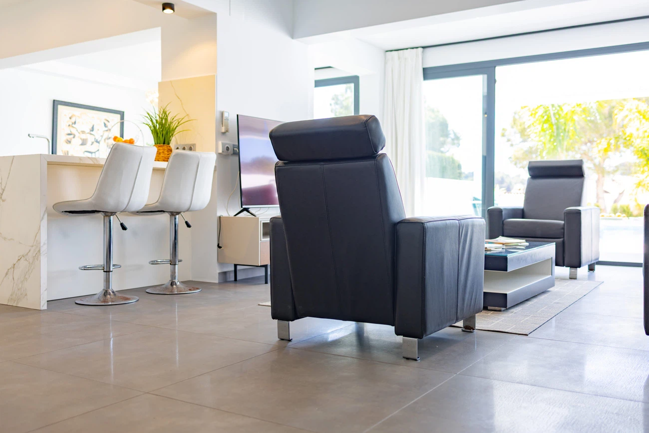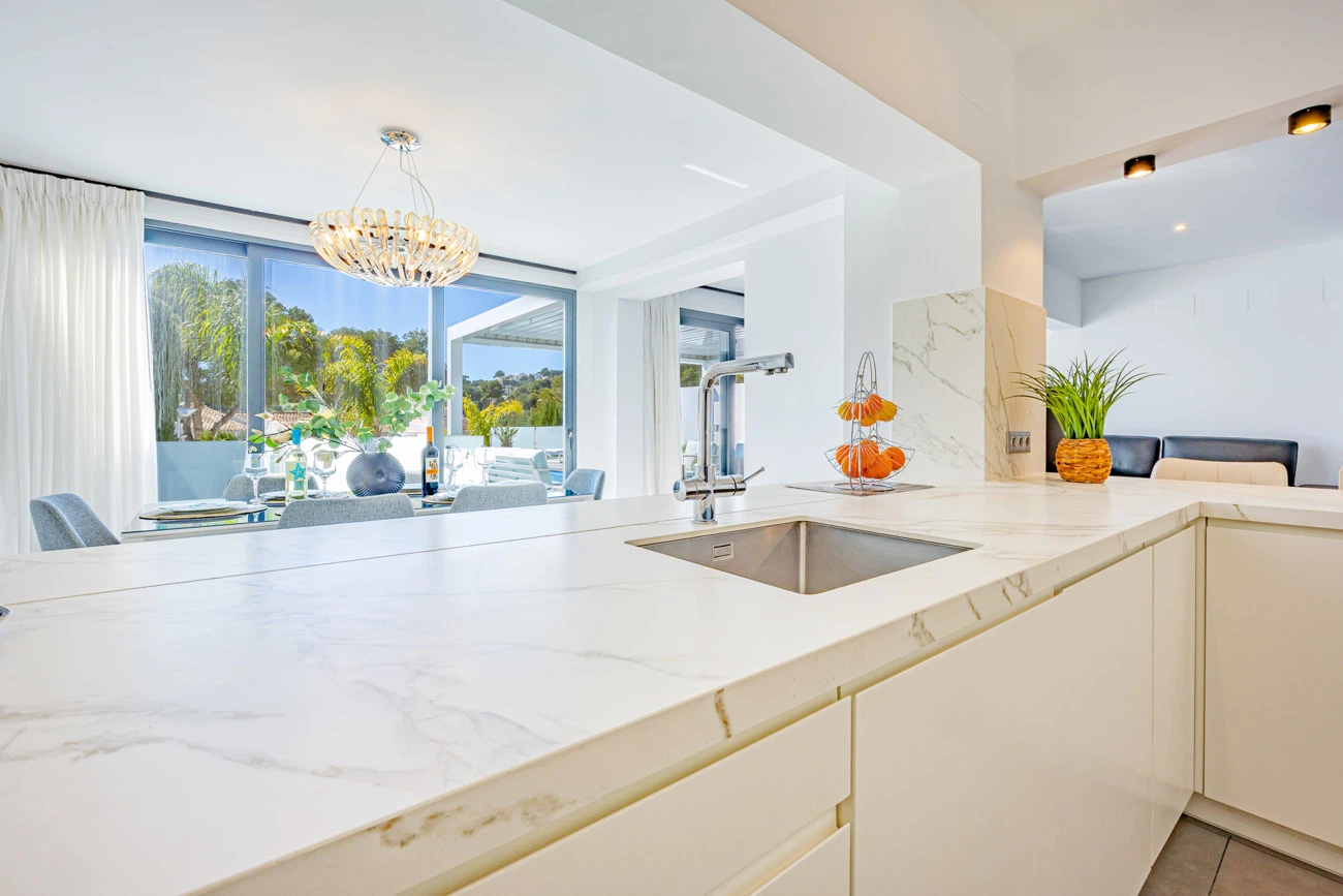 El corazón de la casa es su salón-comedor de diseño contemporáneo. Gracias a sus grandes ventanales, el espacio se inunda de luz natural y ofrece una transición directa a la terraza principal. La cocina americana totalmente equipada cuenta con una moderna barra/banco, el rincón ideal para disfrutar de los desayunos o compartir una copa de vino mientras se cocina.