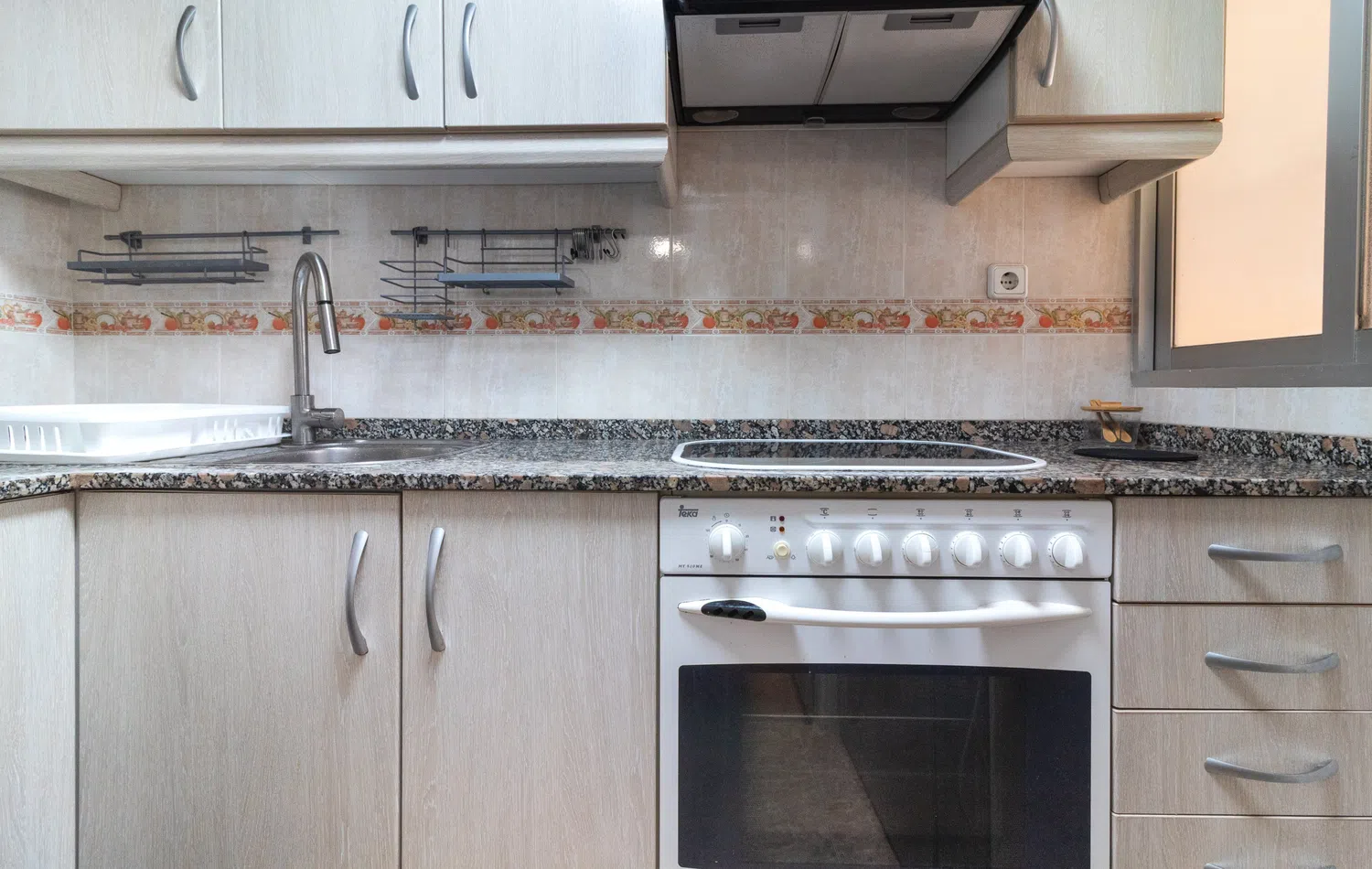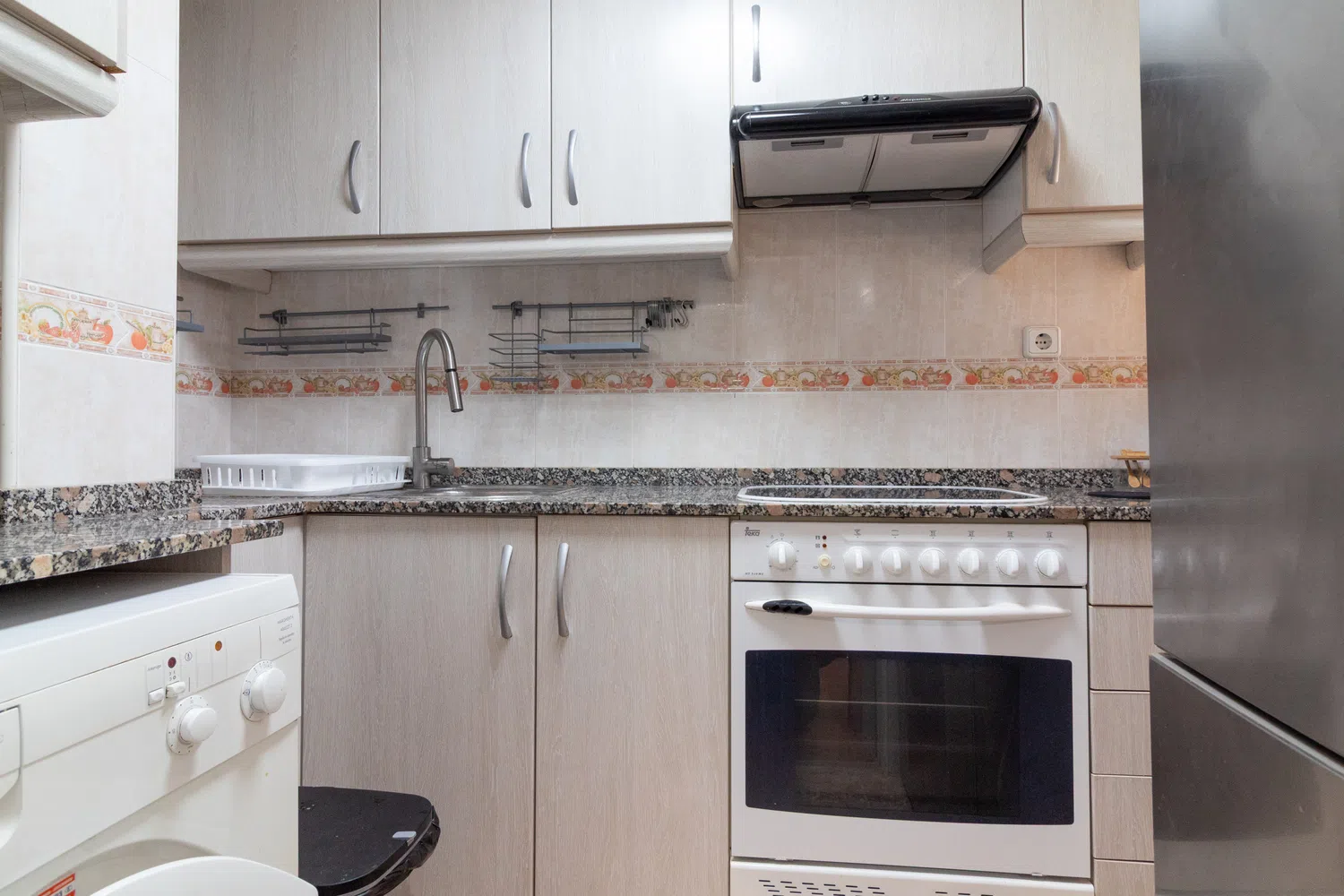 La cocina independiente está totalmente equipada con electrodomésticos modernos como nevera, congelador, horno, microondas, tostadora, exprimidor y menaje completo. Esto permite preparar comidas caseras con total comodidad.