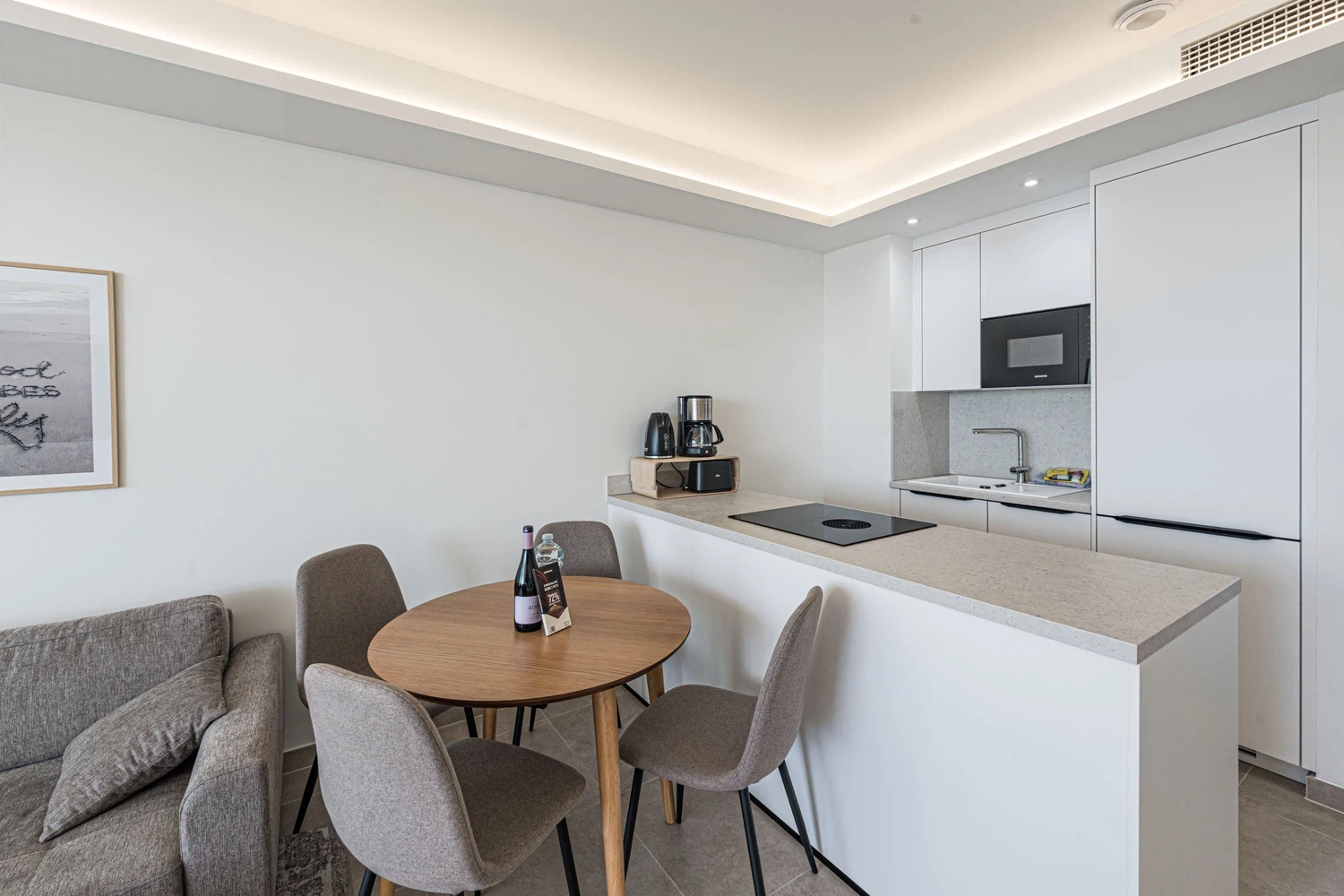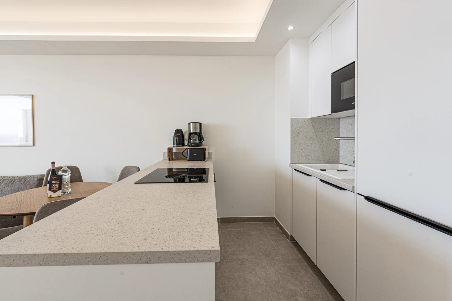 La moderna cocina abierta está equipada con electrodomésticos de alta gama, incluyendo lavavajillas, horno, microondas y una exclusiva placa de cocción con sistema de extracción Bora integrado, que combina diseño y funcionalidad al más alto nivel.
