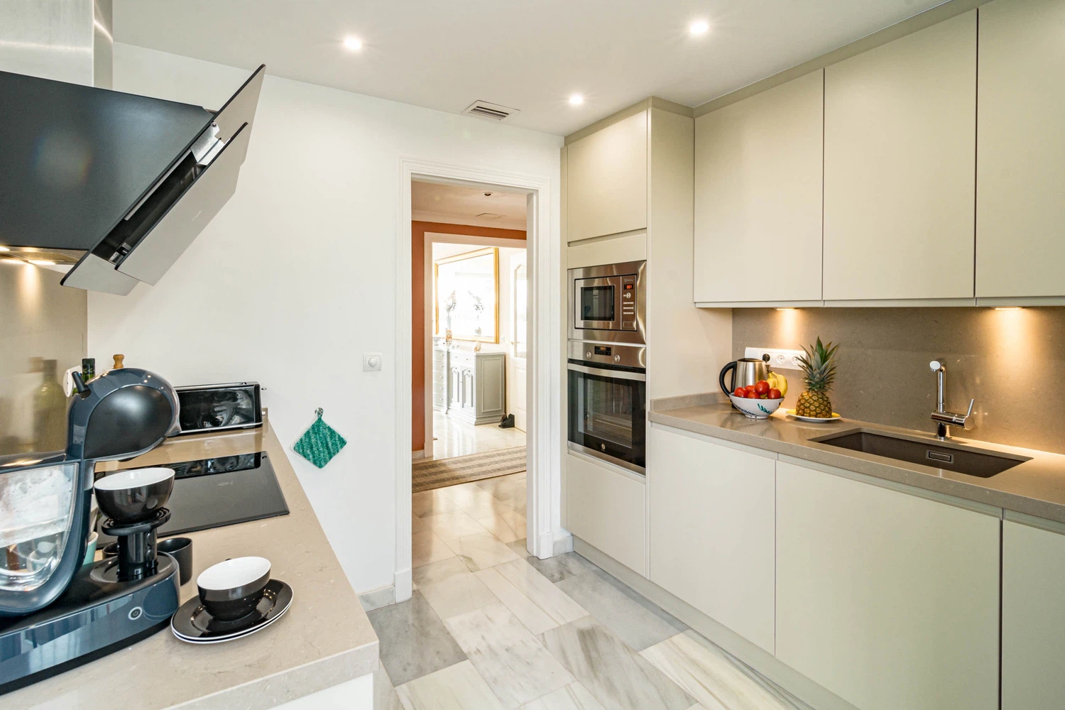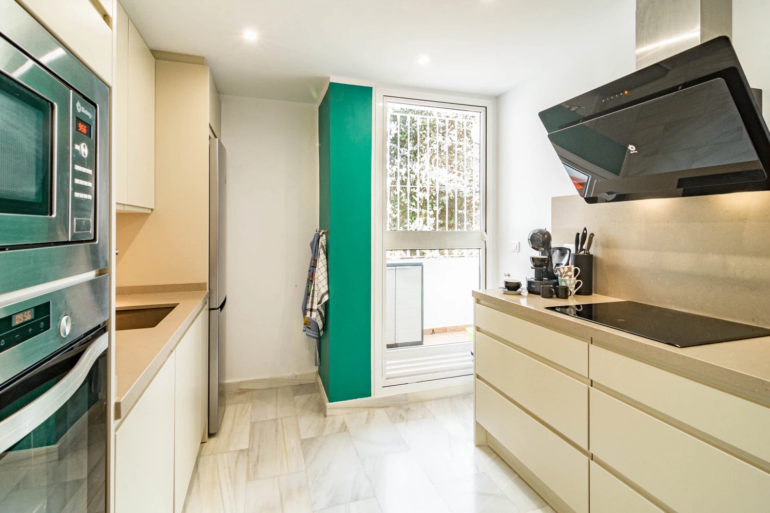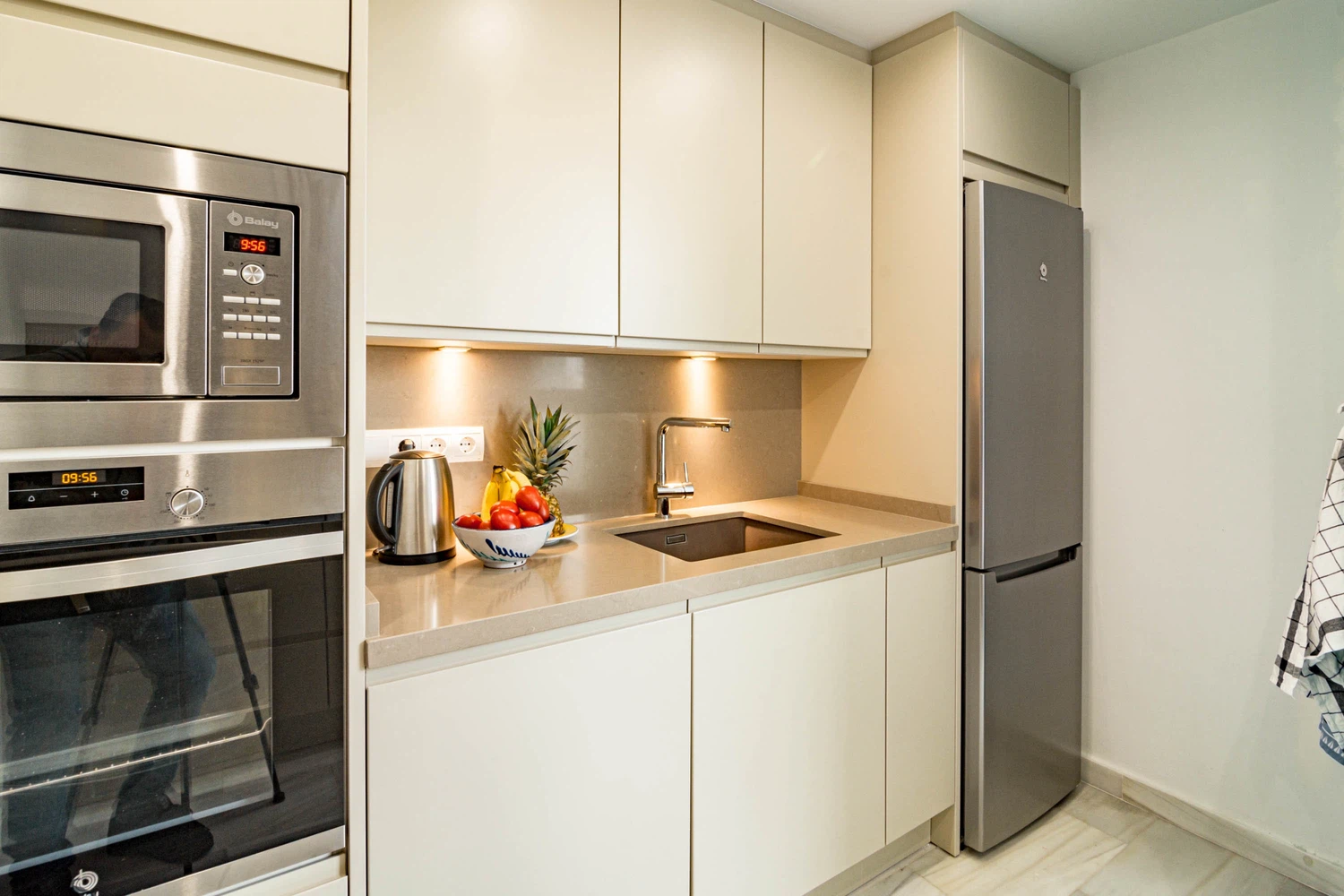 La cocina independiente, de inducción, está equipada con nevera, microondas, horno, congelador, lavavajillas, vajilla/cubertería, utensilios/cocina, cafetera, tostadora, hervidor de agua y exprimidor.