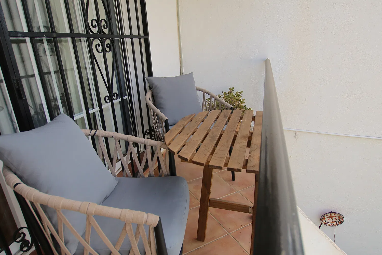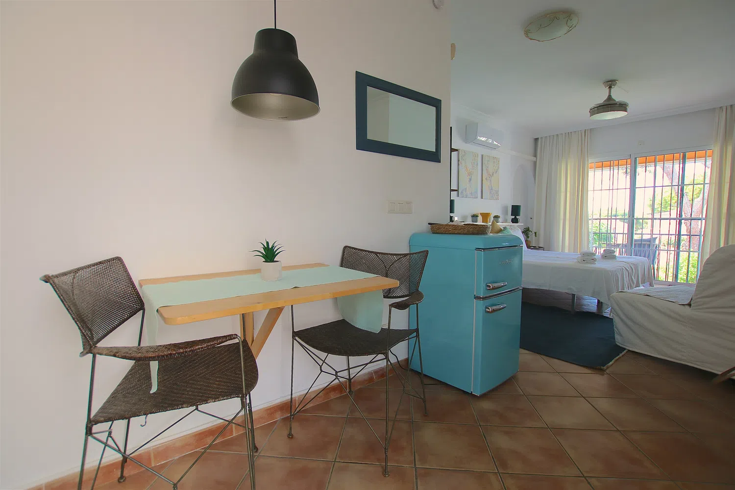 Departamento tipo estudio en primer piso. Situado en la parte baja de Calahonda en medio de un entorno tranquilo pero a 10 minutos a pie de la playa, tiendas, bares, restaurantes y todos los servicios. El estudio Los Rosales es la propiedad de vacaciones ideal para parejas o solteros. Situación en pequeña urbanización tranquila con piscina abierta todo el año desde el amanecer hasta el anochecer.