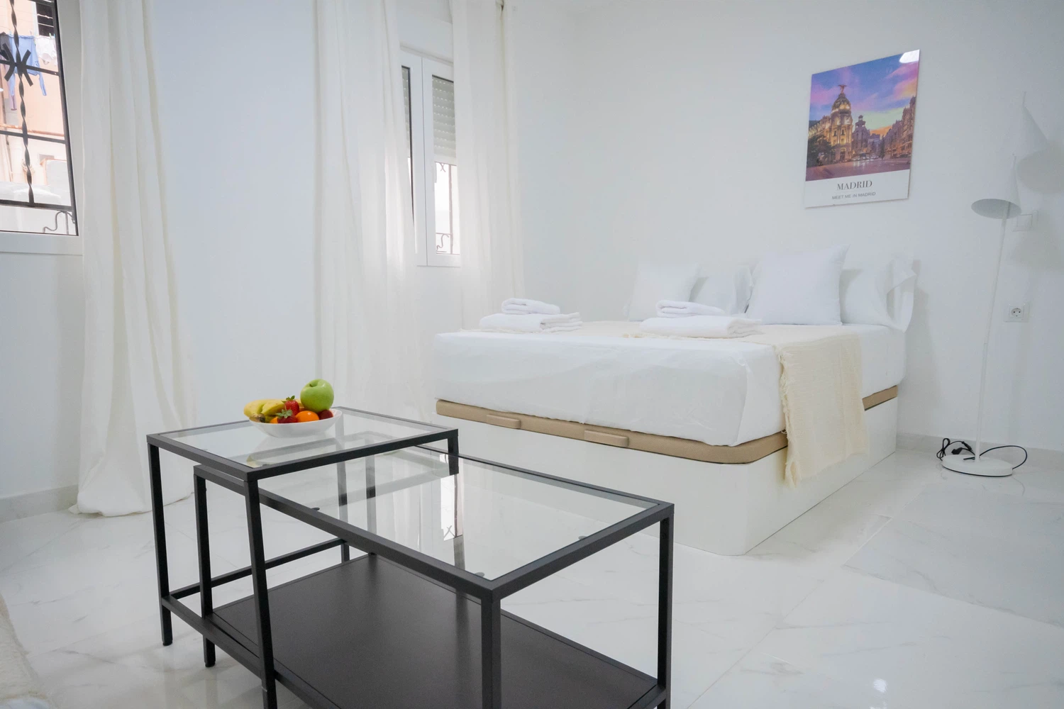 El apartamento ha sido pensado desde su diseño en recrear iconos representativos del Centro de Madrid, en su mobiliario y decoración, escondemos nexos de la arquitectura moderna y clásica que podrás disfrutar al visitar el centro de Madrid, el juego de colores de sus sillas, mesas y decoración desean representar la vida nocturna de la Gran Vía de Madrid por este motivo si está buscando un apartamento con carácter, ¡no busque más este estudio es la elección perfecta!