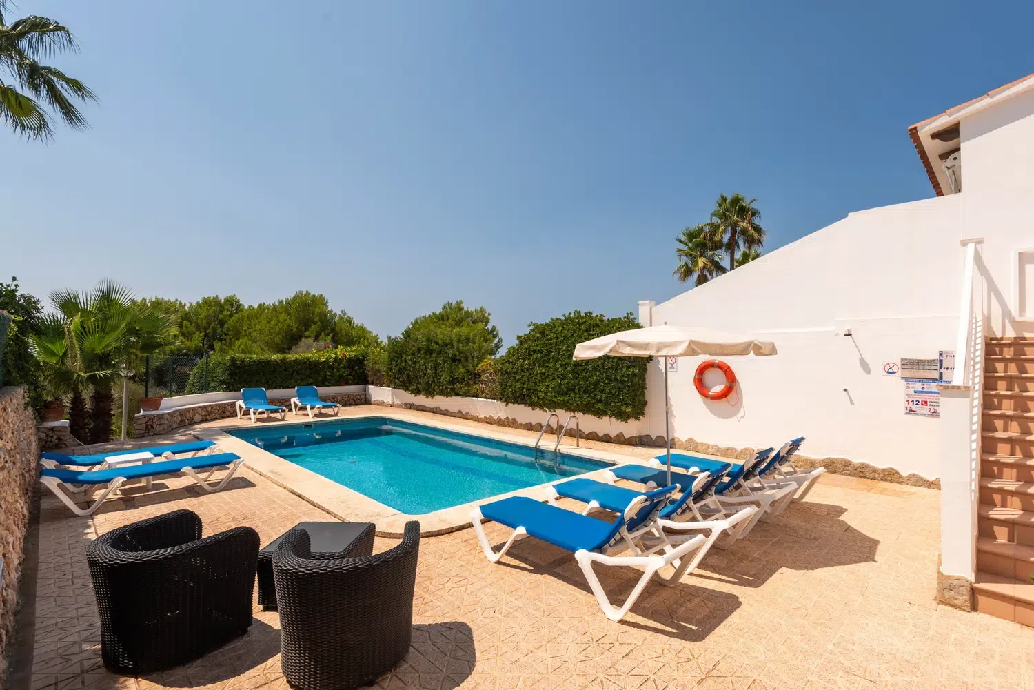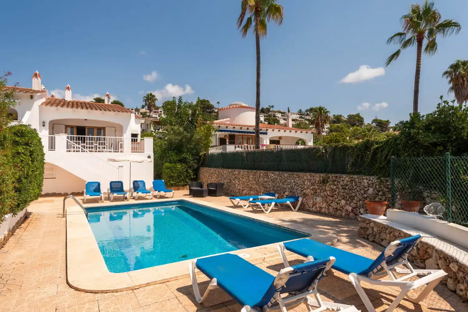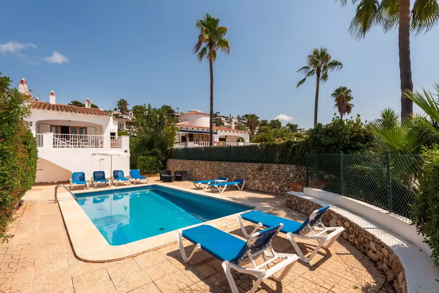 En la planta inferior están ubicados dos dormitorios dobles, un baño común y una habitación de matrimonio con baño privado con bañera. Dispone de aire acondicionado en las zonas comunes de las dos plantas. La zona de la piscina y su terraza ofrecen la posibilidad de disfrutar al máximo de los exteriores de la casa. Todos los dormitorios disponen de ventiladores de techo.