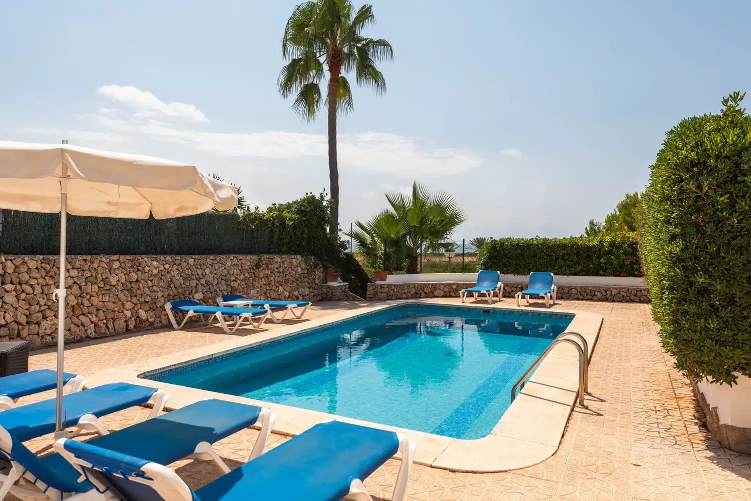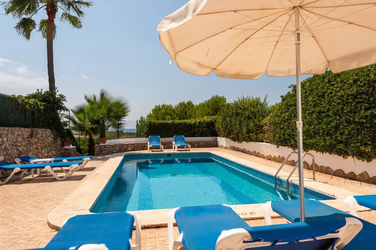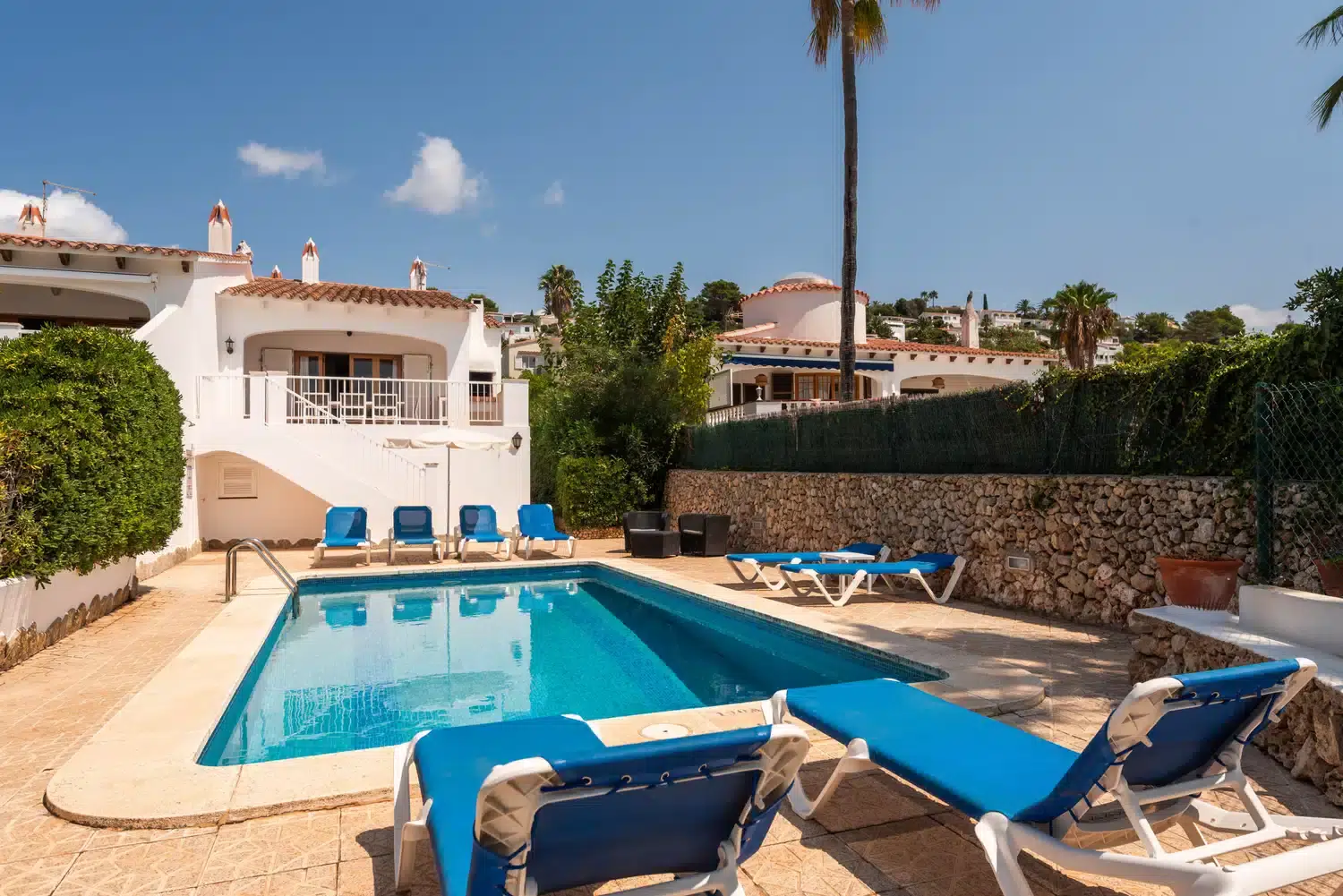 En la planta inferior están ubicados dos dormitorios dobles, un baño común y una habitación de matrimonio con baño privado con bañera. Dispone de aire acondicionado en las zonas comunes de las dos plantas. La zona de la piscina y su terraza ofrecen la posibilidad de disfrutar al máximo de los exteriores de la casa. Todos los dormitorios disponen de ventiladores de techo.