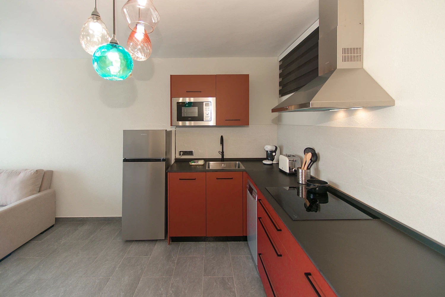 Este apartamento puede albergar hasta cuatro huéspedes, lo que lo convierte en una opción ideal para familias o pequeños grupos de amigos. En la espaciosa sala de estar, encontrará un sofá acogedor, un televisor y una zona de comedor, así como una cocina completamente equipada para preparar sus platos favoritos. Desde la sala de estar hay acceso a una terraza donde se puede disfrutar del desayuno o la cena con vistas al canal y los barcos que pasan.