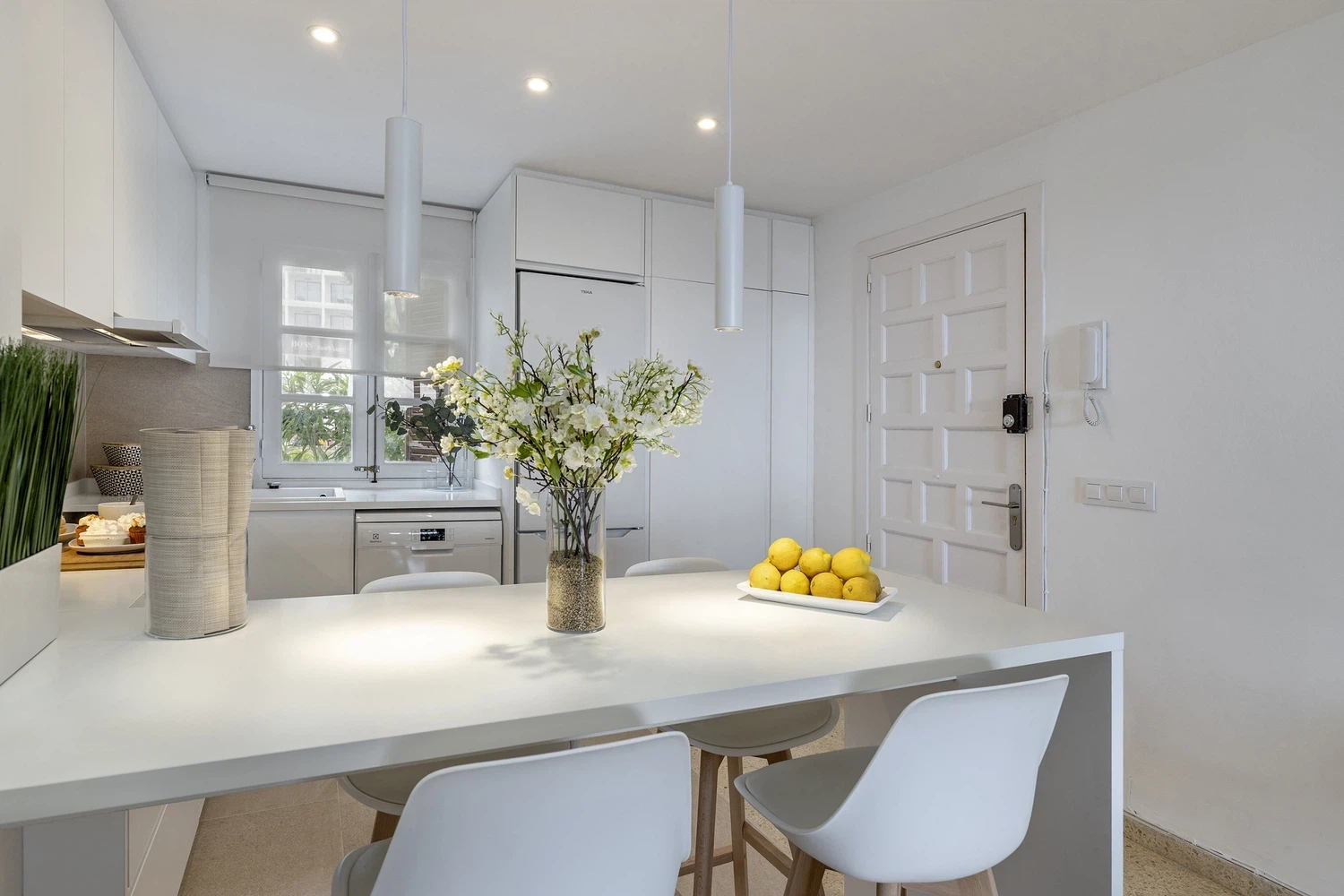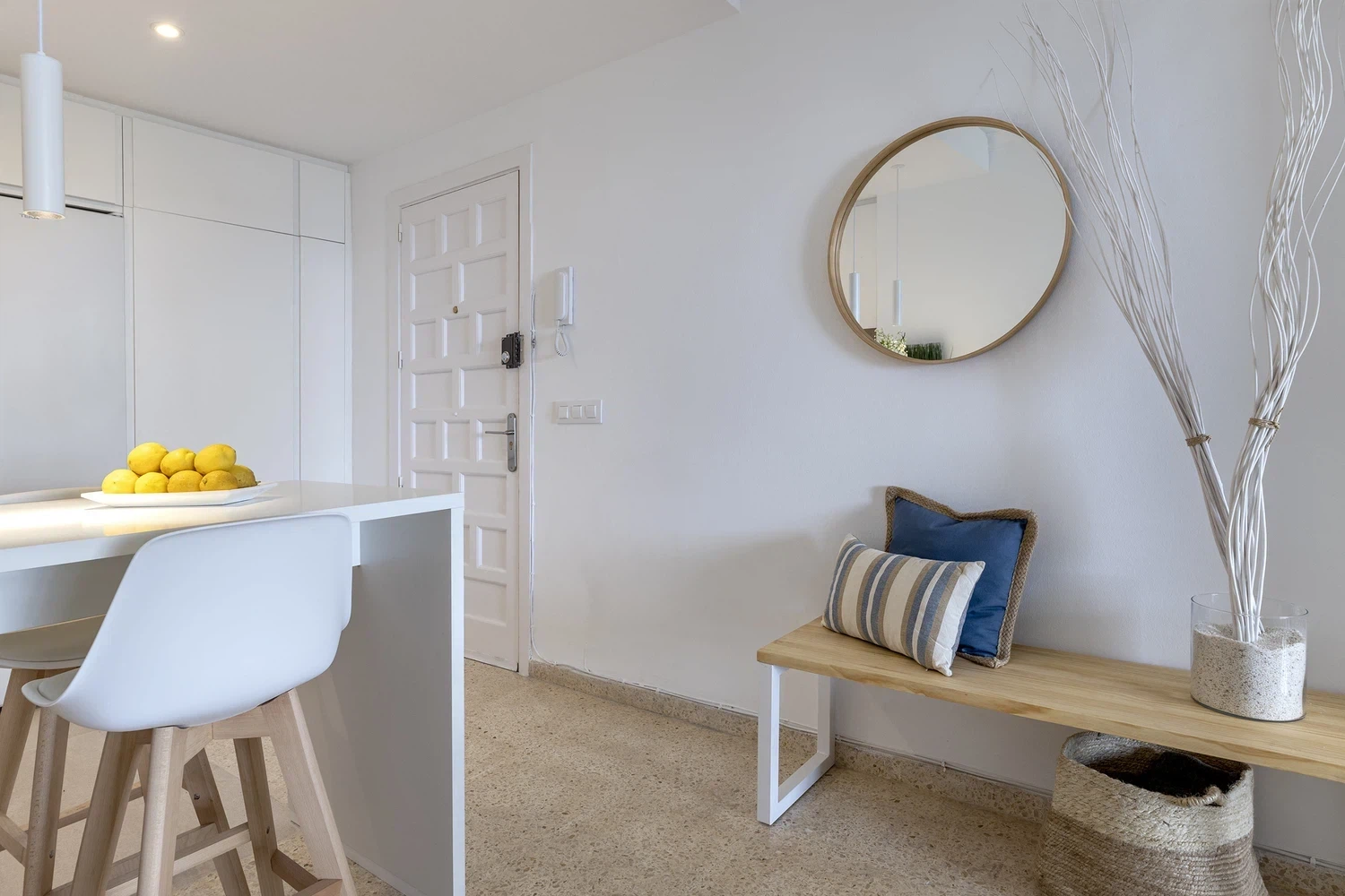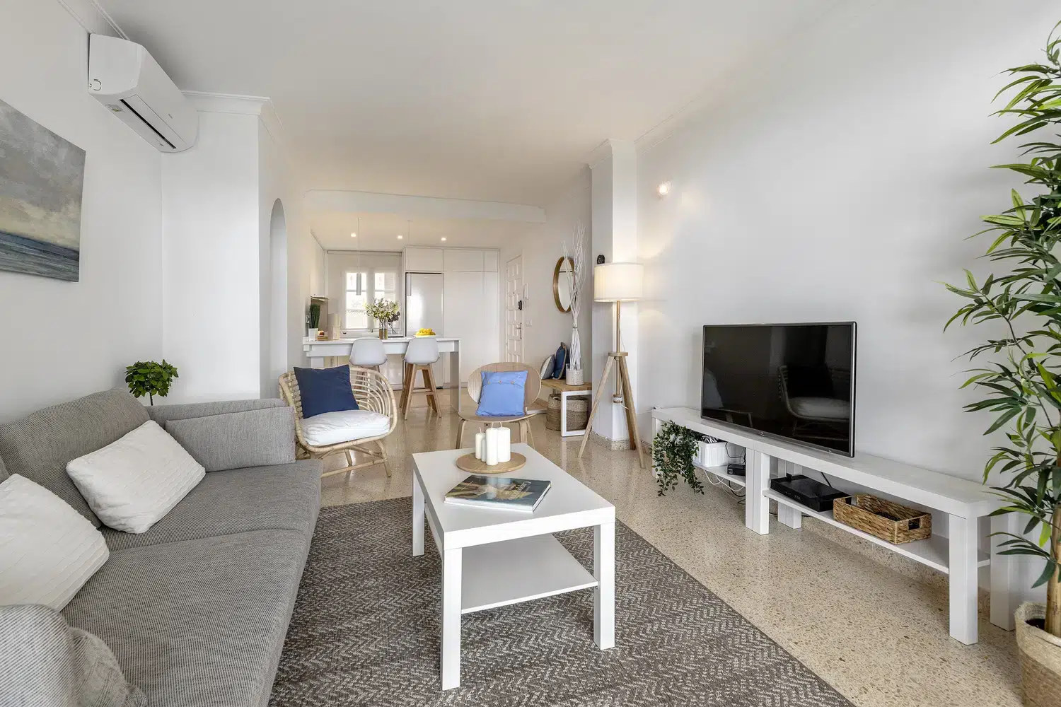 Se trata de un apartamento en planta baja que dispone de salón comedor, dos habitaciones dobles, cocina independiente totalmente equipada, baño con ducha y un aseo. Es un apartamento de verano sencillo, fresco y muy luminoso con una terraza de 8 m² frente a la playa, dónde disfrutará unas espectaculares vistas al mar y al puerto deportivo.