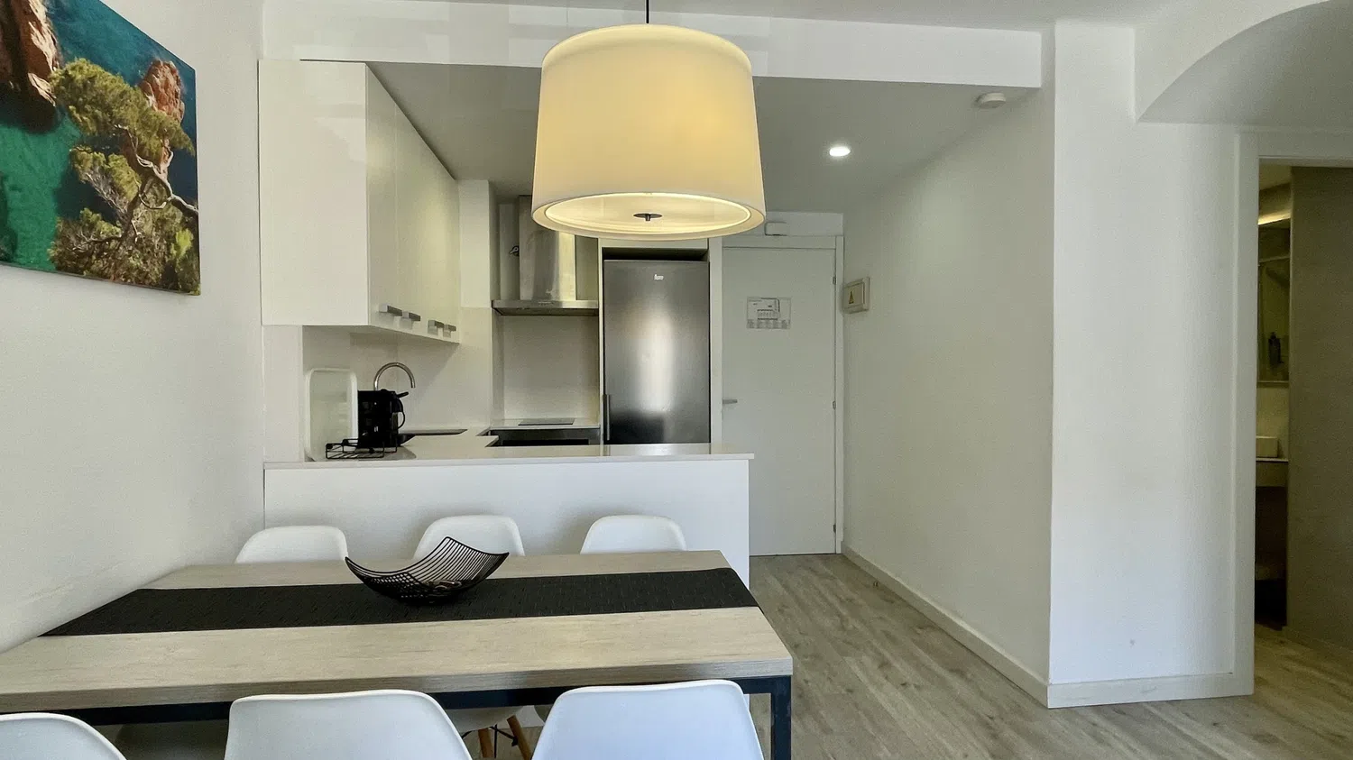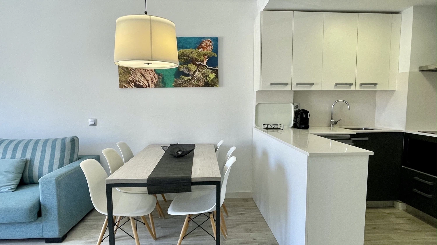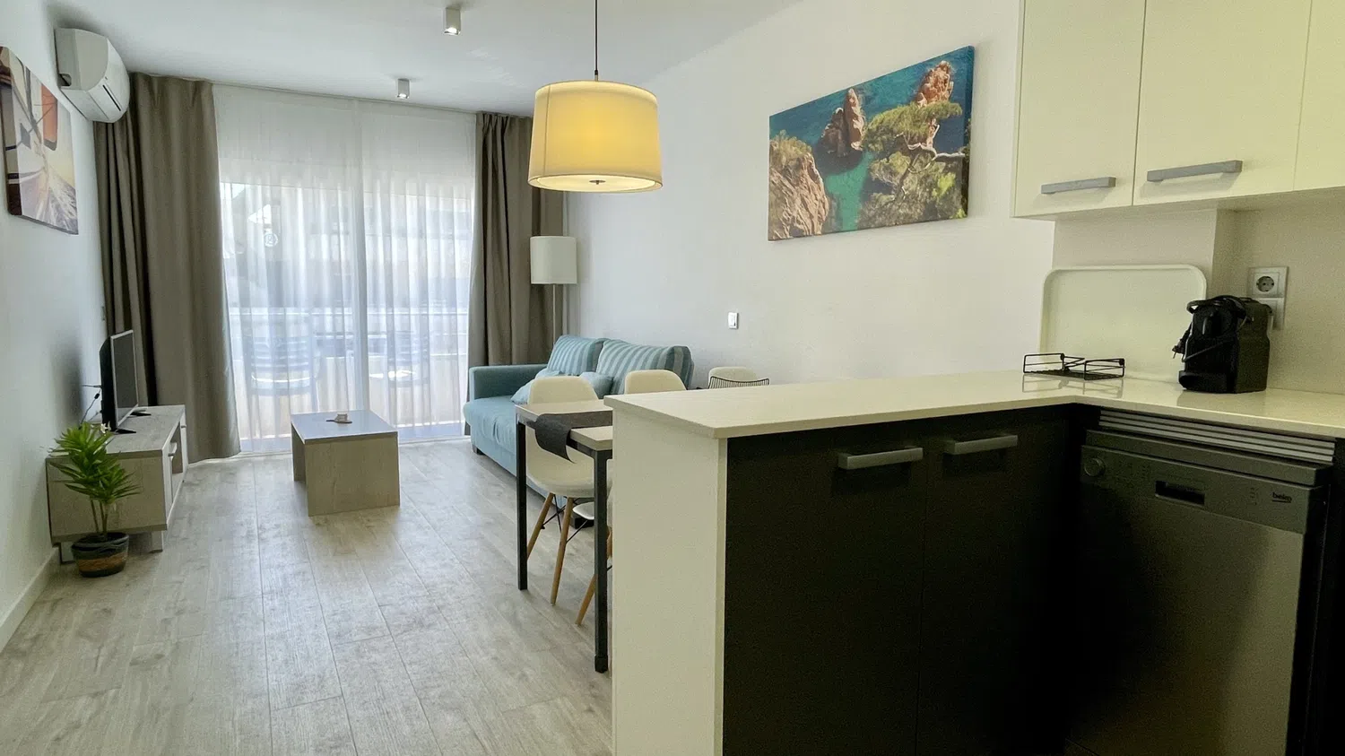 El apartamento cuenta con aire acondicionado para mantener un ambiente fresco durante los días más calurosos, ideal para familias con niños. La cocina americana está completamente equipada con electrodomésticos modernos como nevera, congelador, lavavajillas, microondas, tostadora y máquina de café, facilitando la preparación de comidas y snacks para toda la familia.