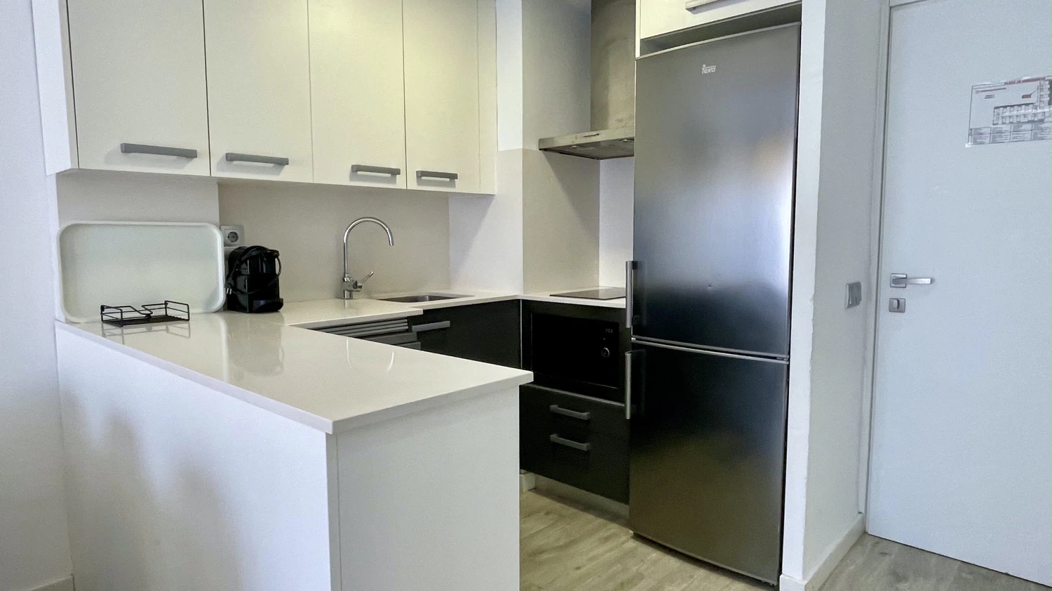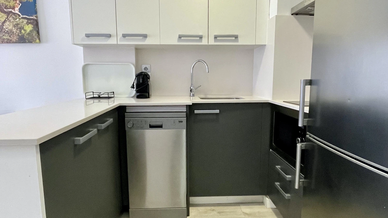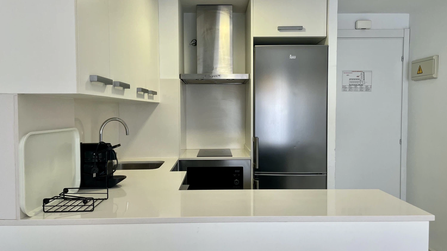 El apartamento cuenta con aire acondicionado para mantener un ambiente fresco durante los días más calurosos, ideal para familias con niños. La cocina americana está completamente equipada con electrodomésticos modernos como nevera, congelador, lavavajillas, microondas, tostadora y máquina de café, facilitando la preparación de comidas y snacks para toda la familia.