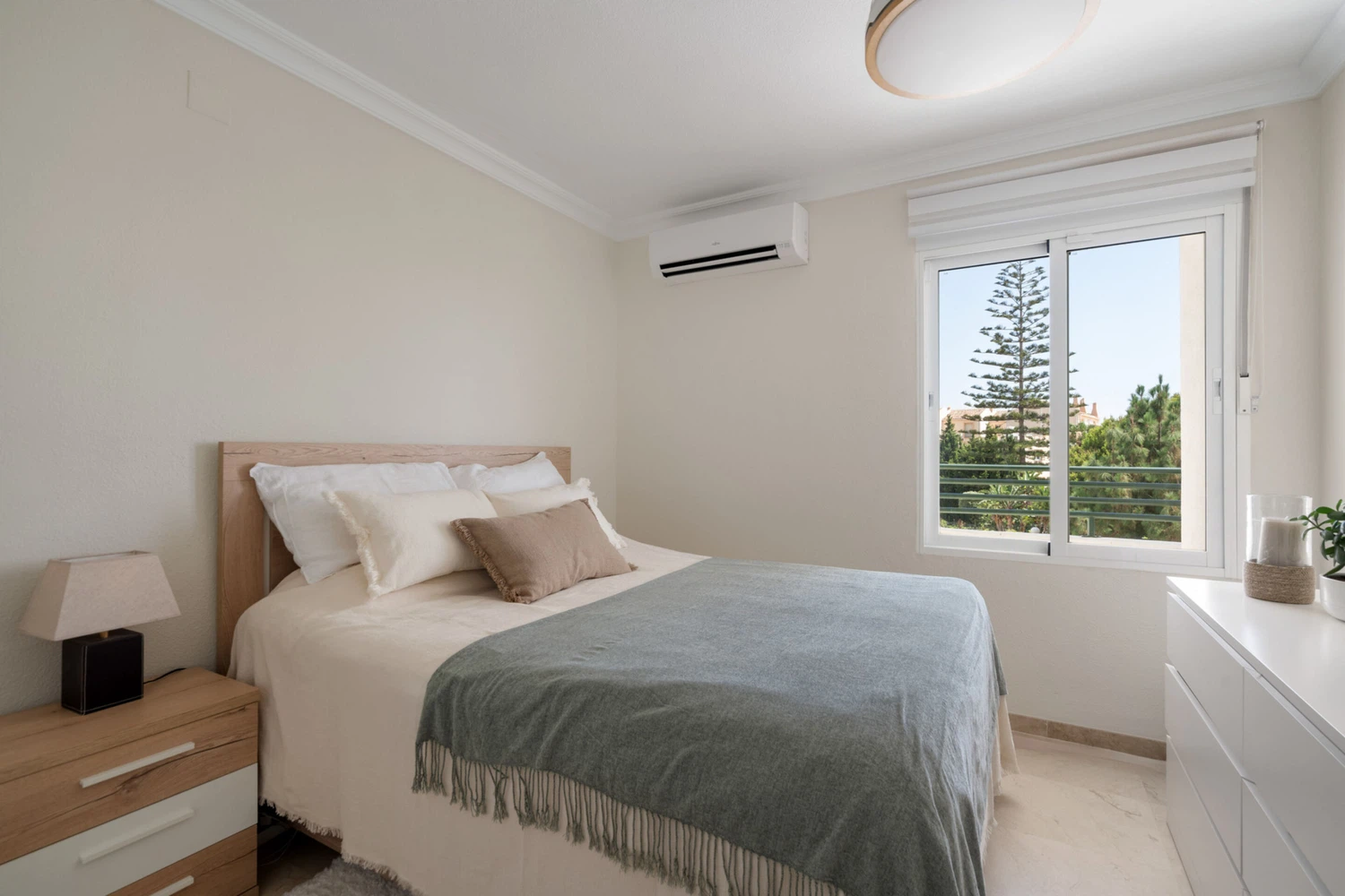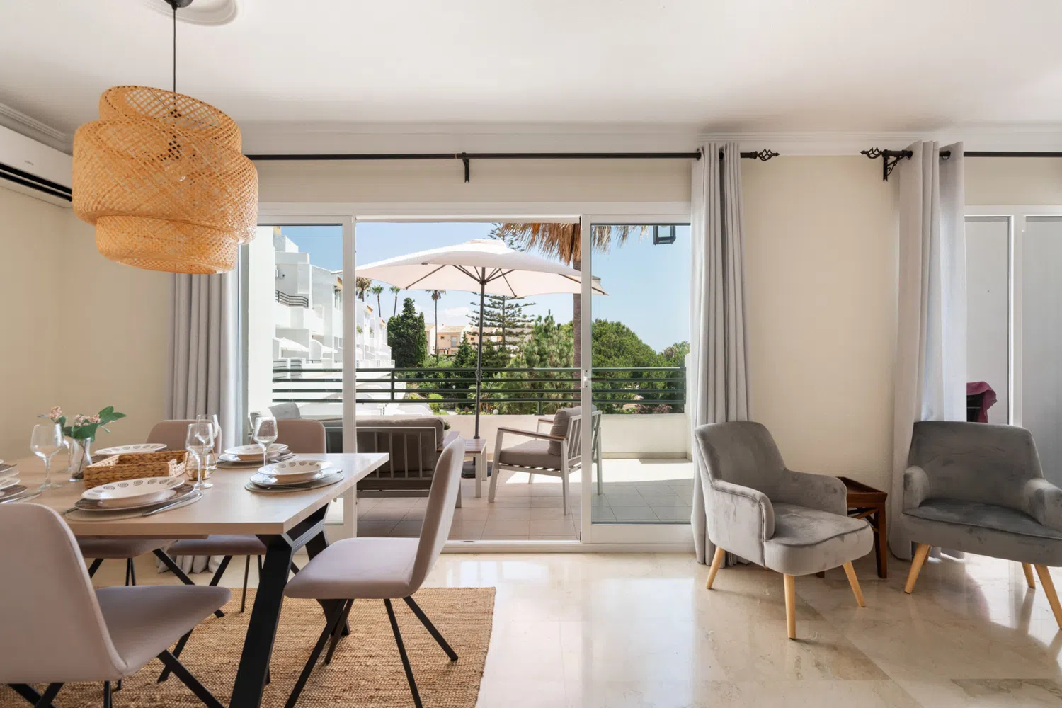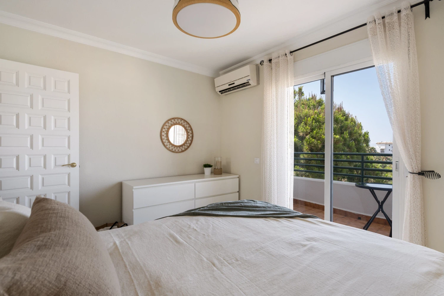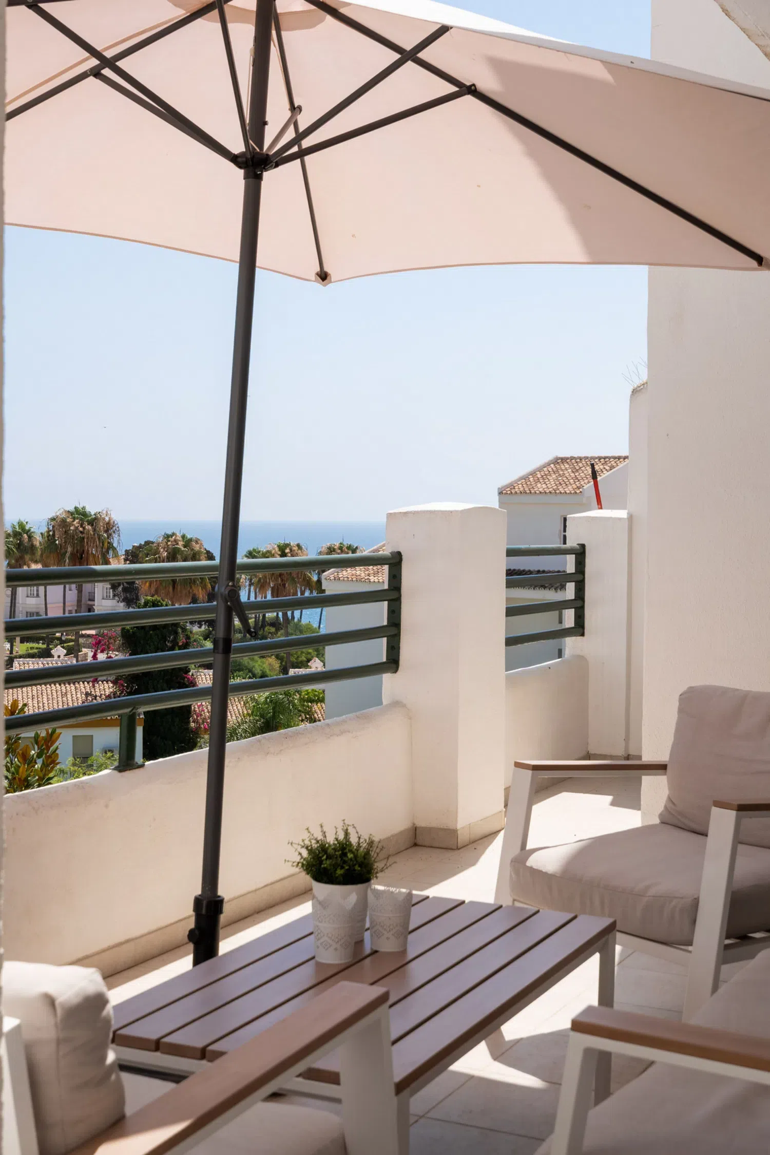 Decorado con mucho gusto y atención al detalle, el apartamento combina funcionalidad con un estilo elegante y relajante. Dispone de una amplia terraza privada con vistas al mar y al jardín, perfecta para desayunos al sol o cenas al aire libre. Además, el dormitorio principal cuenta con su propio balcón privado, donde podrás disfrutar de la brisa mediterránea.