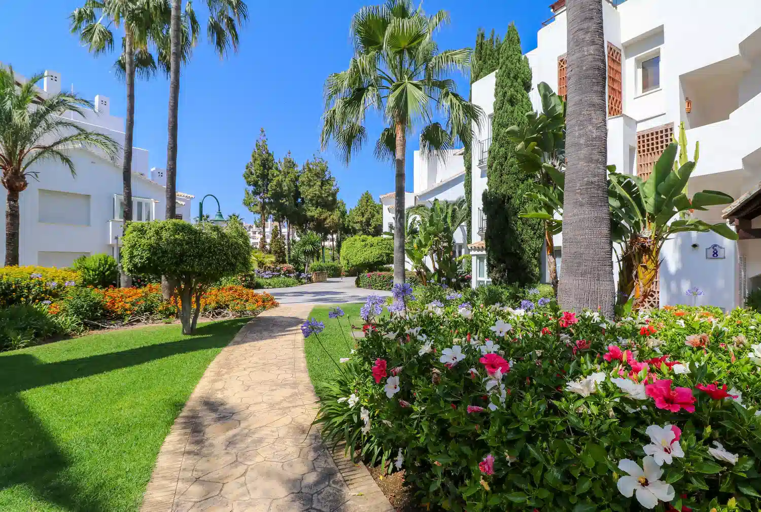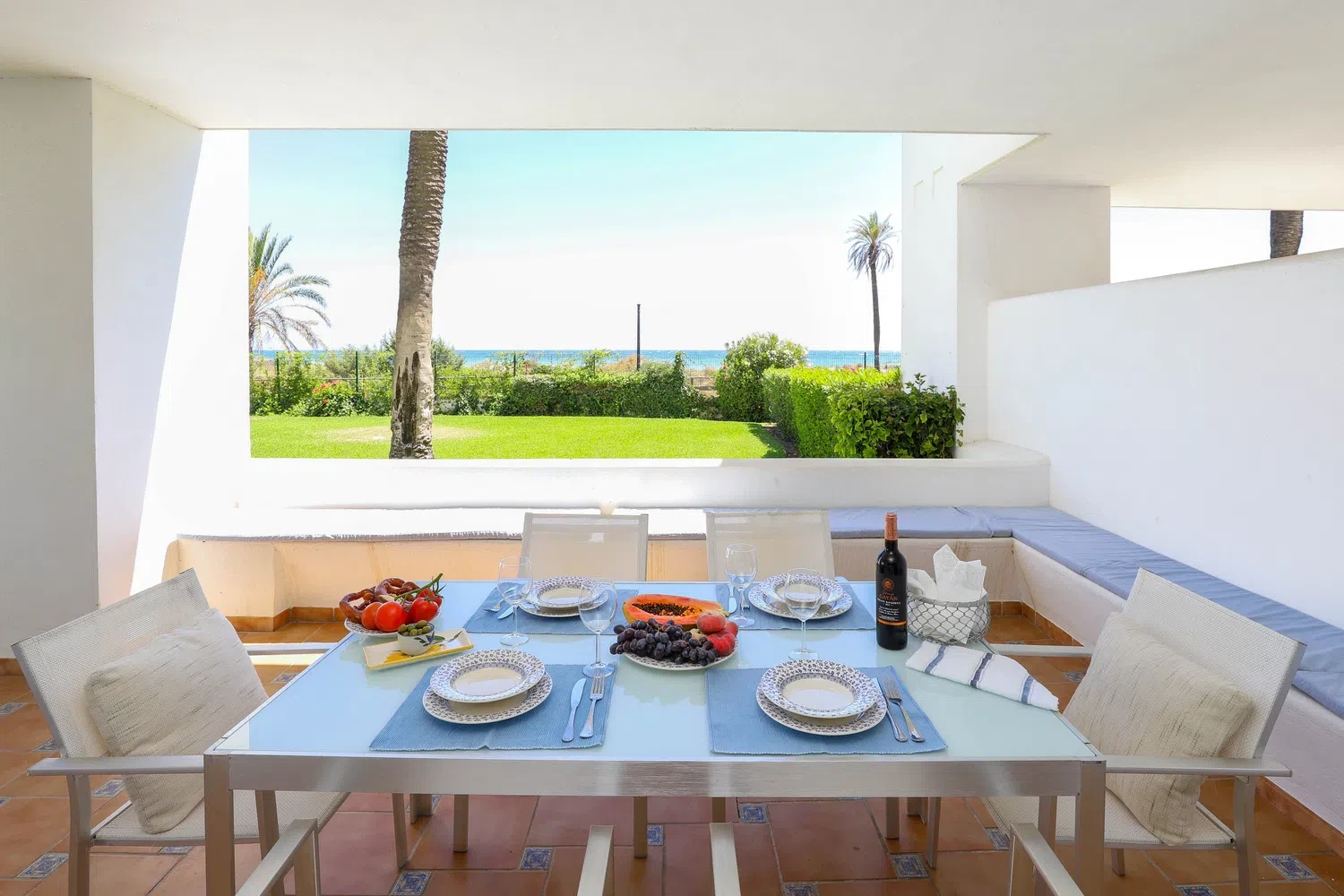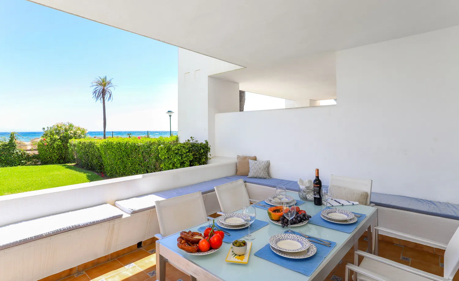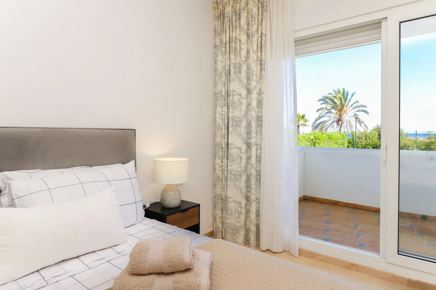 Apartamento en planta baja de estilo andaluz con un gran jardín privado y vistas abiertas al mar ubicado en el famoso complejo residencial Los Monteros Palm Beach con acceso directo a las mejores playas de Marbella Este. La ubicación es muy tranquila incluso en verano y se tarda 30 minutos a pie hasta el centro de Marbella por el paseo marítimo. Este encantador apartamento ofrece tres amplios dormitorios, todos con su propio cuarto de baño. Amplio salón que da a una gran terraza cubierta rodeada de cuidados jardines privados con vistas abiertas al mar y el sonido de olas. La cocina está totalmente equipada, tiene una mesa para desayunar y un lavadero adyacente. Aire acondicionado en todo el apartamento, Wi-Fi rápido, Smart TV 65'. Piscina más cercana a solo unos pasos. 2 plazas de aparcamiento en el garaje con ascensor.
