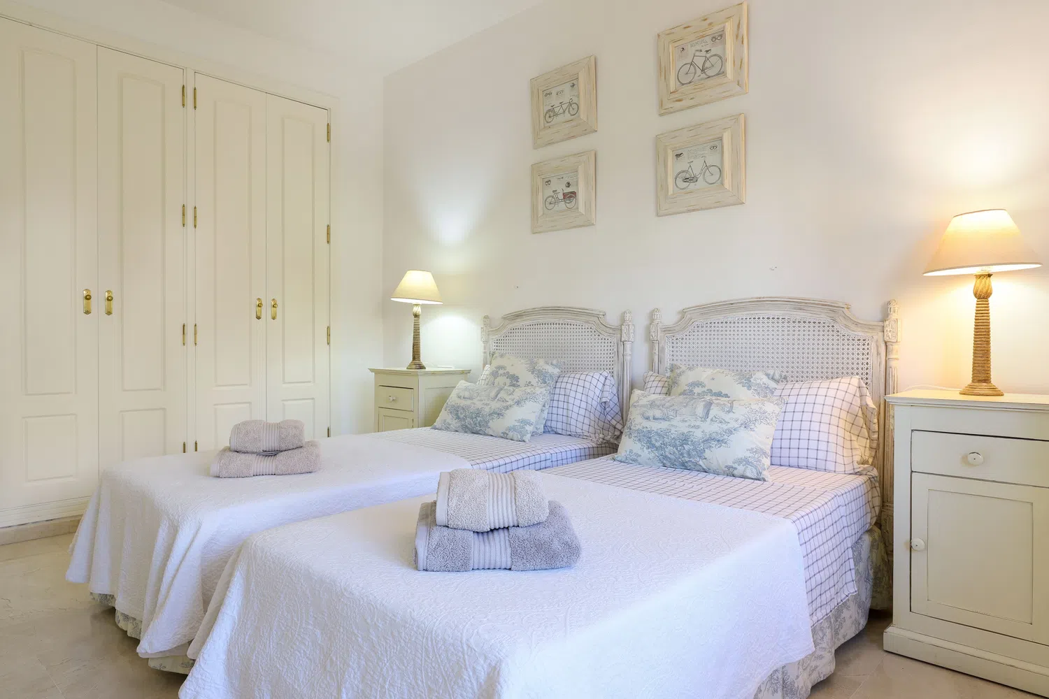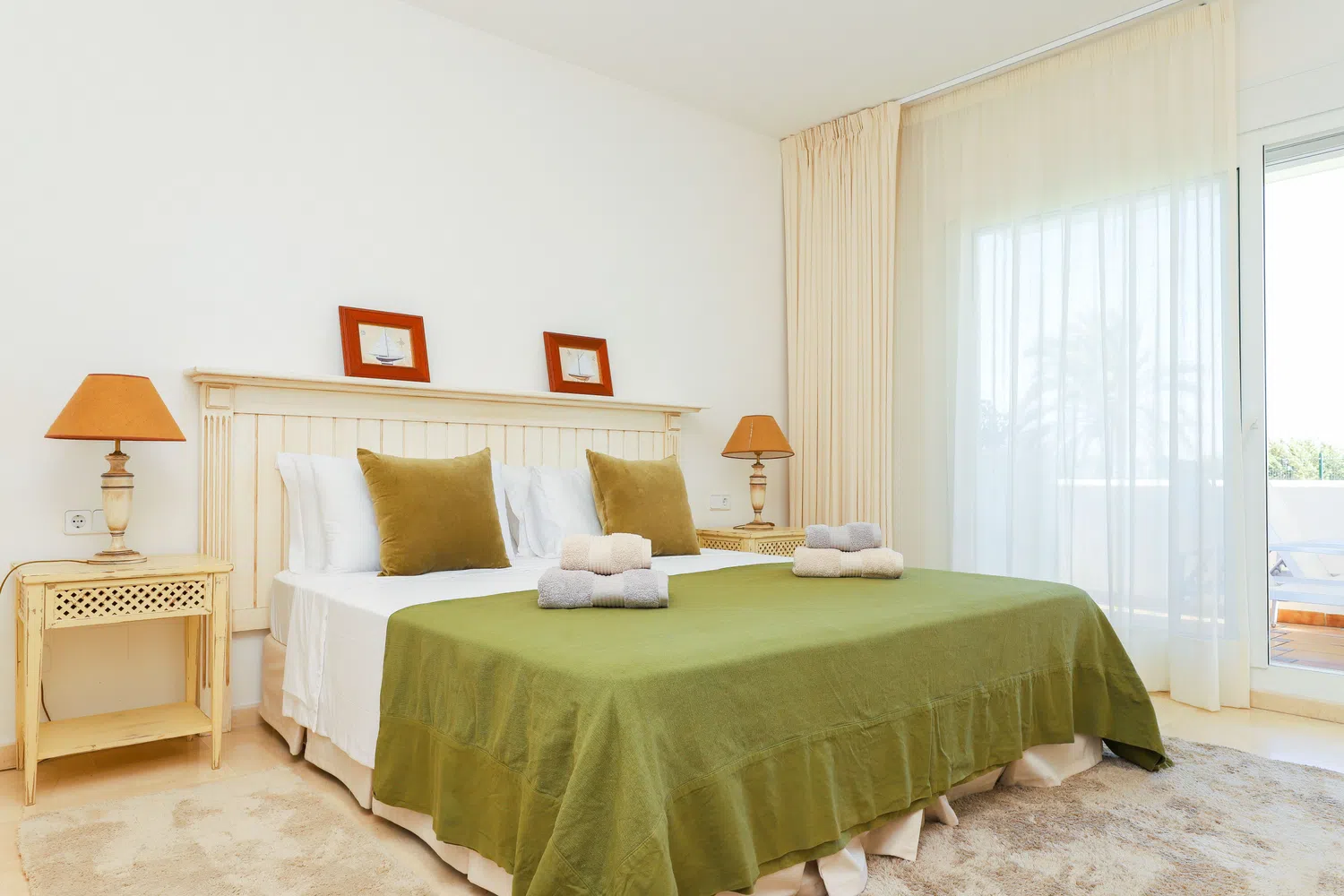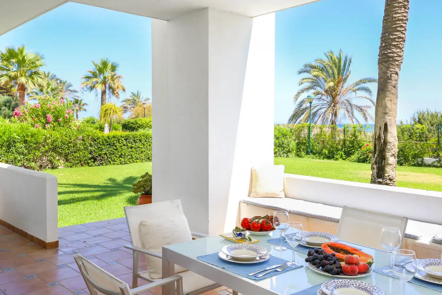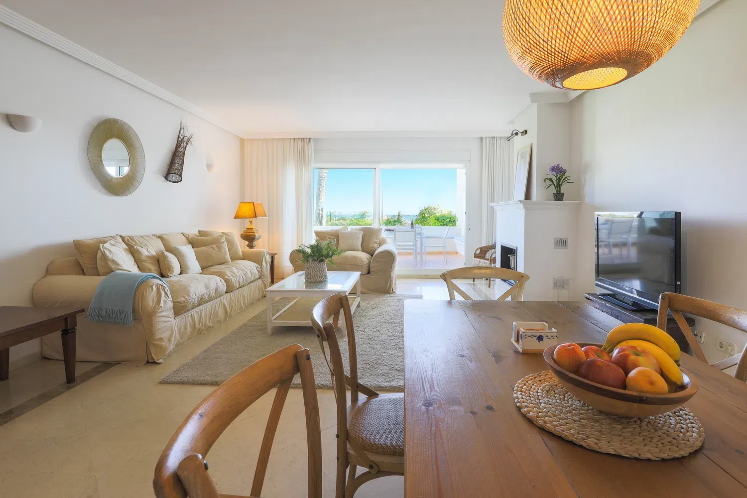 Apartamento en planta baja de estilo andaluz con un gran jardín privado y vistas abiertas al mar ubicado en el famoso complejo residencial Los Monteros Palm Beach con acceso directo a las mejores playas de Marbella Este. La ubicación es muy tranquila incluso en verano y se tarda 30 minutos a pie hasta el centro de Marbella por el paseo marítimo. Este encantador apartamento ofrece tres amplios dormitorios, todos con su propio cuarto de baño. Amplio salón que da a una gran terraza cubierta rodeada de cuidados jardines privados con vistas abiertas al mar y el sonido de olas. La cocina está totalmente equipada, tiene una mesa para desayunar y un lavadero adyacente. Aire acondicionado en todo el apartamento, Wi-Fi rápido, Smart TV 65'. Piscina más cercana a solo unos pasos. 2 plazas de aparcamiento en el garaje con ascensor.