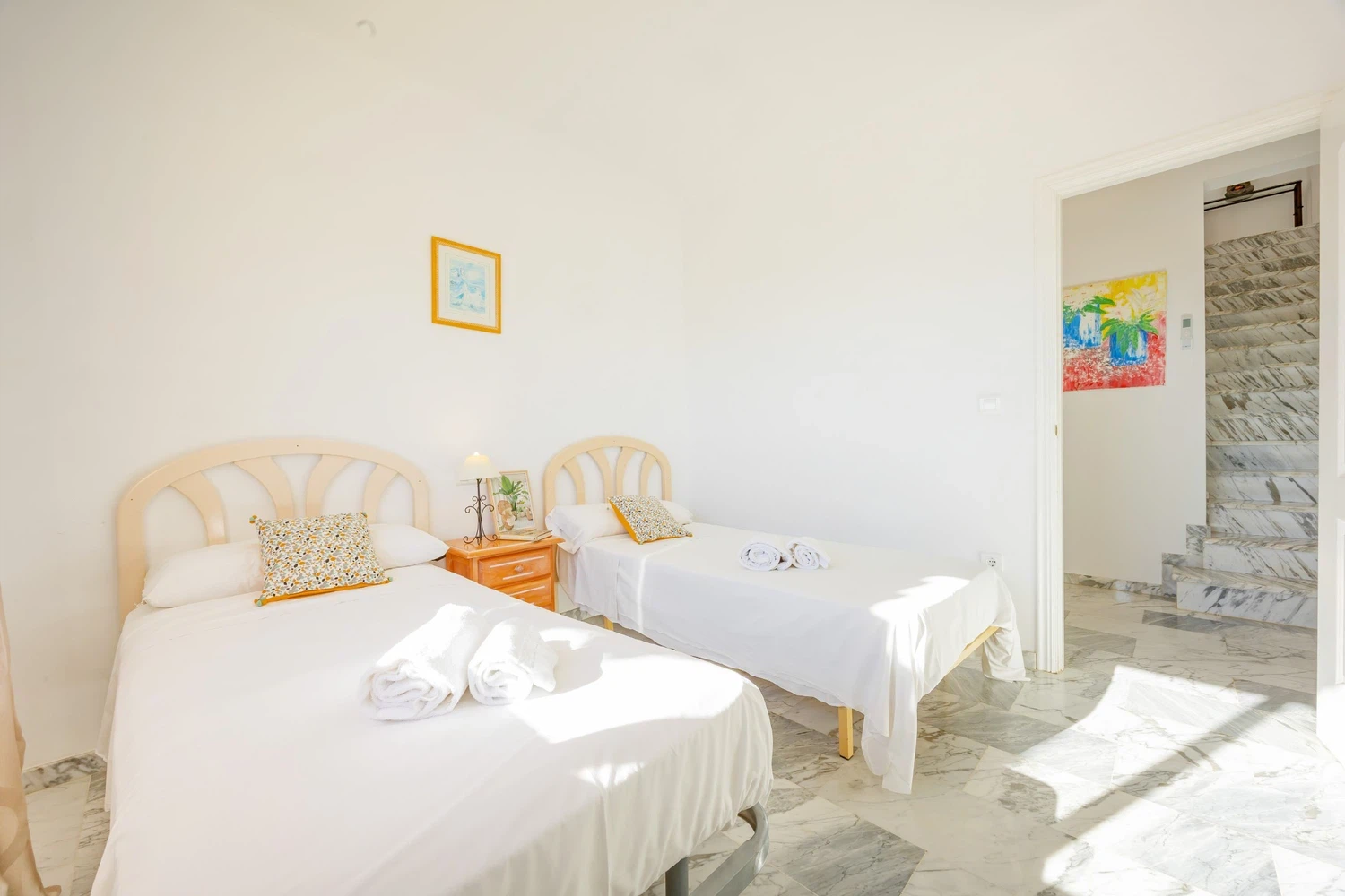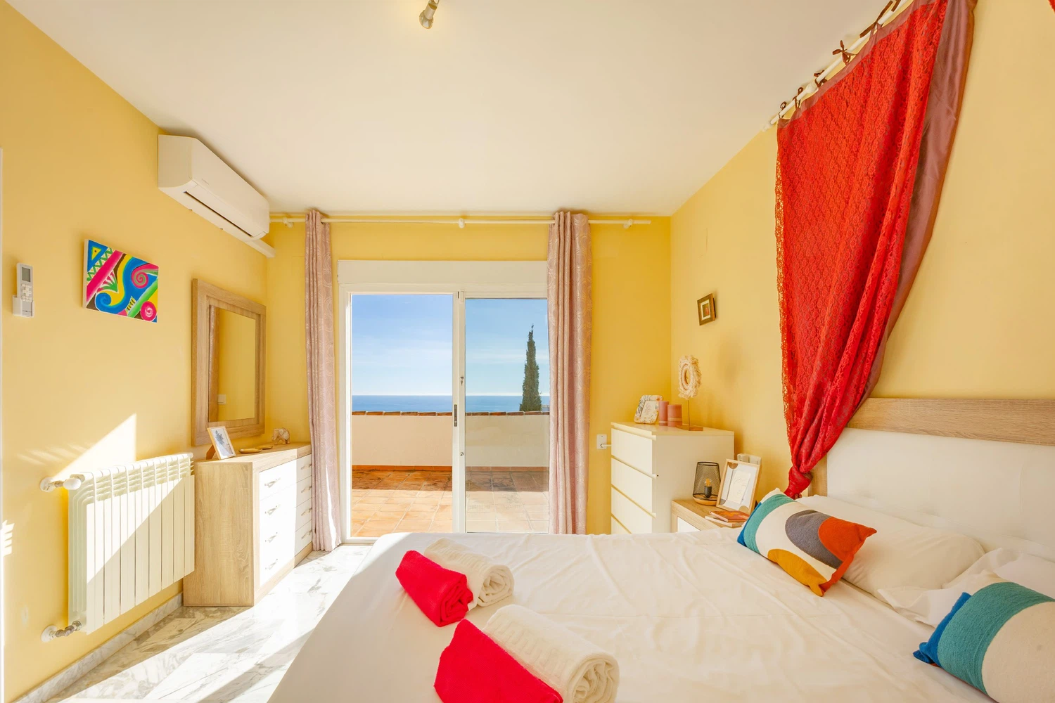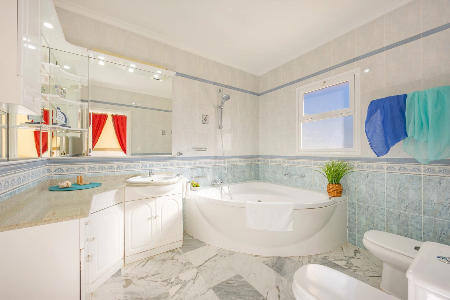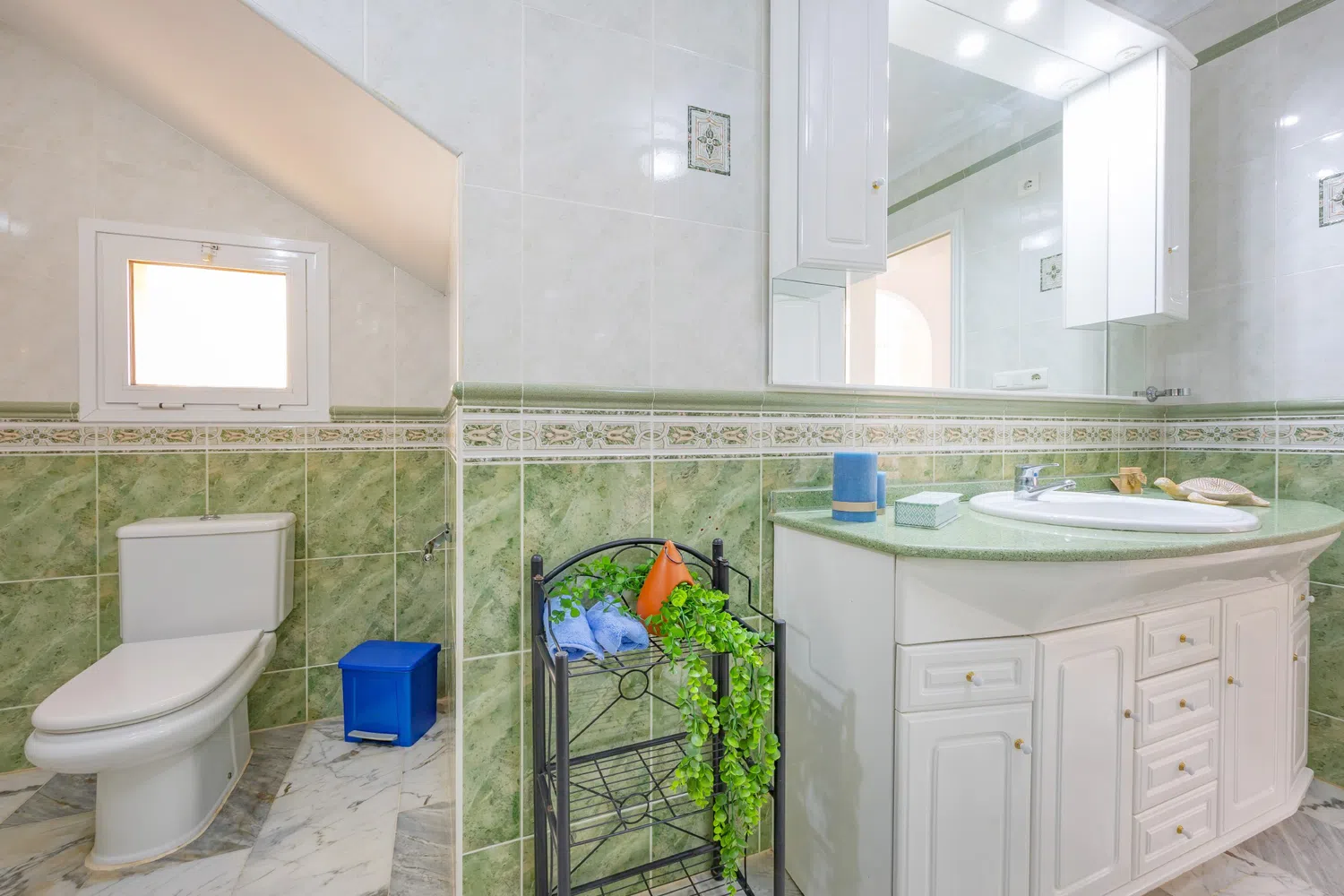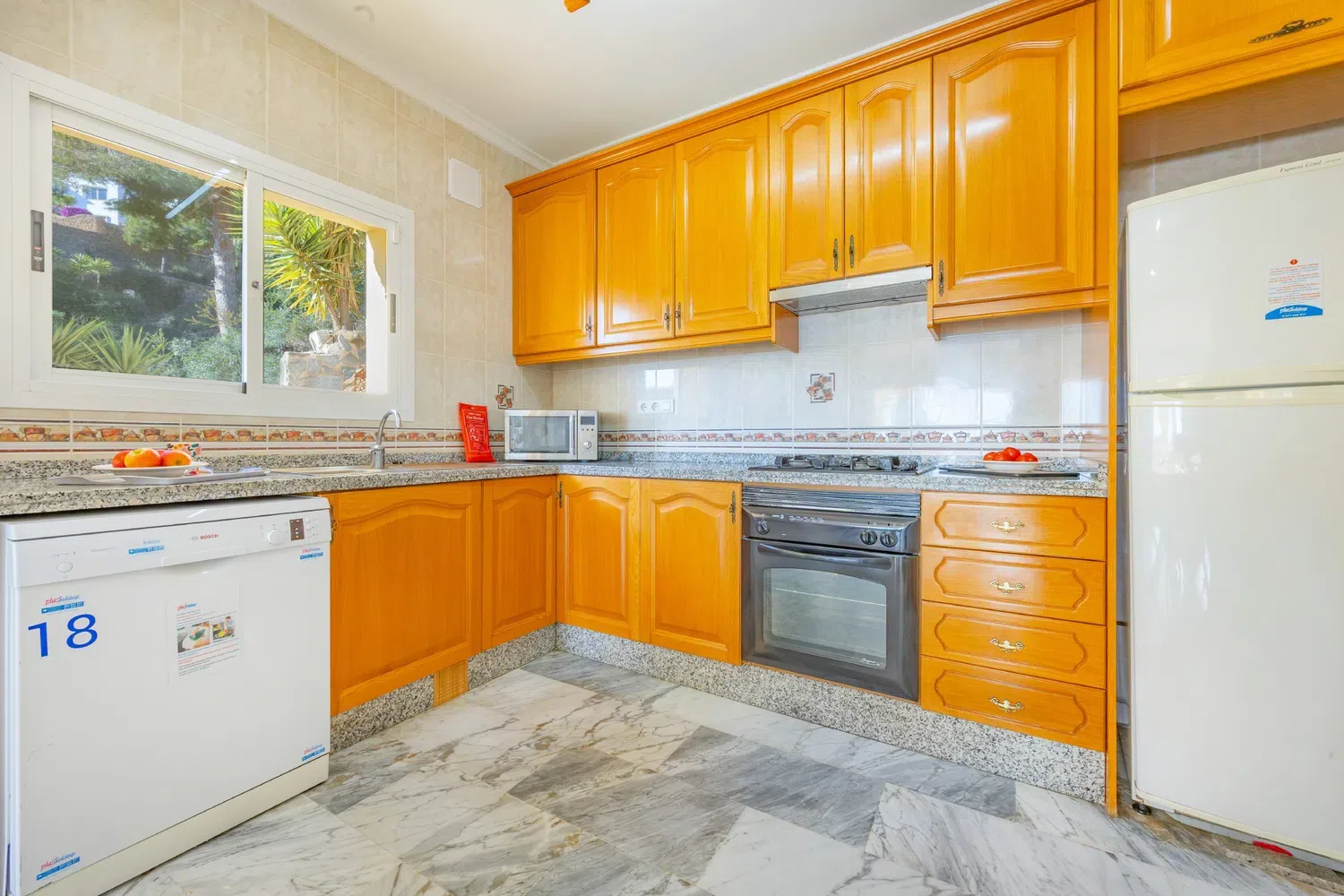 La bonita villa se distribuye en la PLANTA ALTA, donde encontrará un acogedor hall de entrada, un dormitorio con cama de matrimonio y acceso a un soleado solárium con vistas impresionantes al mar. Este dormitorio también cuenta con un baño en suite equipado con bañera. Descendiendo por escaleras interiores, llegamos a la PLANTA BAJA, que ofrece un amplio salón-comedor con TV SAT/TDT y vistas al mar, con acceso a una terraza cubierta y la zona de la piscina. La cocina abierta, totalmente equipada con cocina de gas y lavavajillas, se convierte en el corazón de la vivienda. Dos dormitorios más, ambos con vistas al mar (uno con cama de matrimonio y otro con dos camas individuales), junto con otro cuarto de baño con ducha, completan las comodidades interiores.