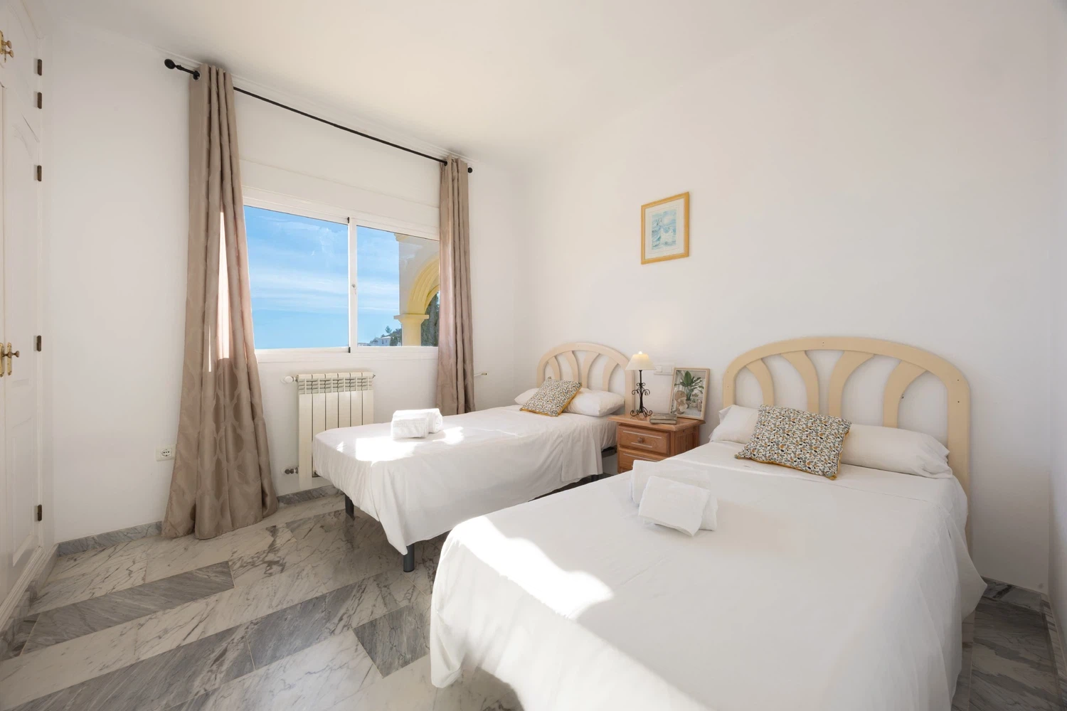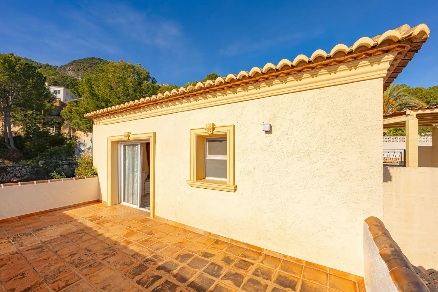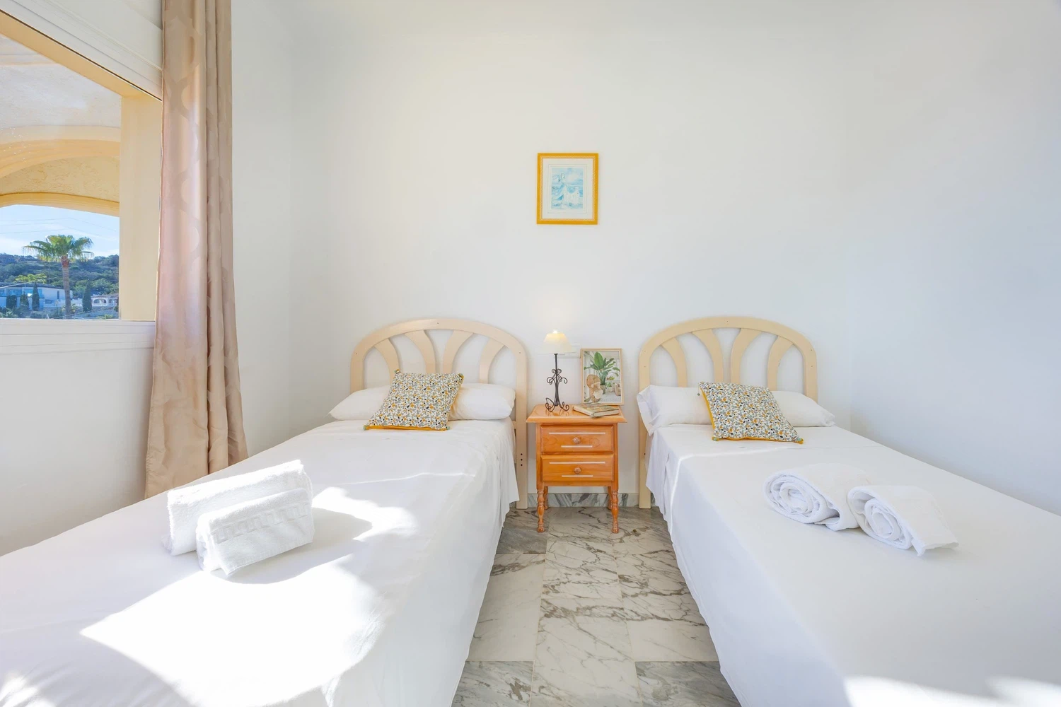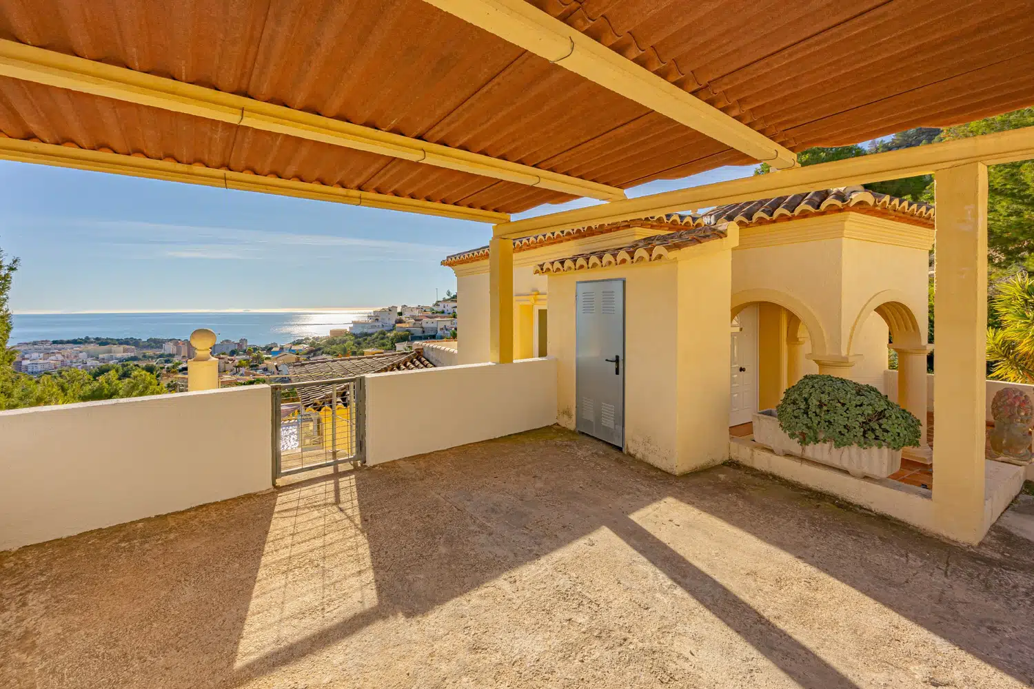La bonita villa se distribuye en la PLANTA ALTA, donde encontrará un acogedor hall de entrada, un dormitorio con cama de matrimonio y acceso a un soleado solárium con vistas impresionantes al mar. Este dormitorio también cuenta con un baño en suite equipado con bañera. Descendiendo por escaleras interiores, llegamos a la PLANTA BAJA, que ofrece un amplio salón-comedor con TV SAT/TDT y vistas al mar, con acceso a una terraza cubierta y la zona de la piscina. La cocina abierta, totalmente equipada con cocina de gas y lavavajillas, se convierte en el corazón de la vivienda. Dos dormitorios más, ambos con vistas al mar (uno con cama de matrimonio y otro con dos camas individuales), junto con otro cuarto de baño con ducha, completan las comodidades interiores.