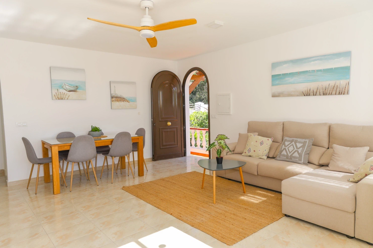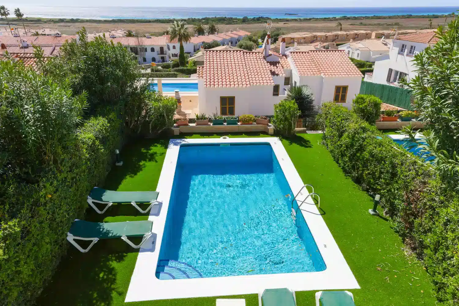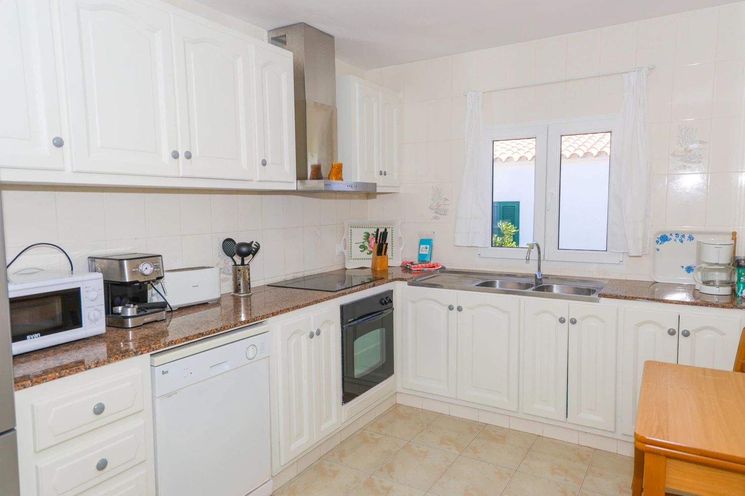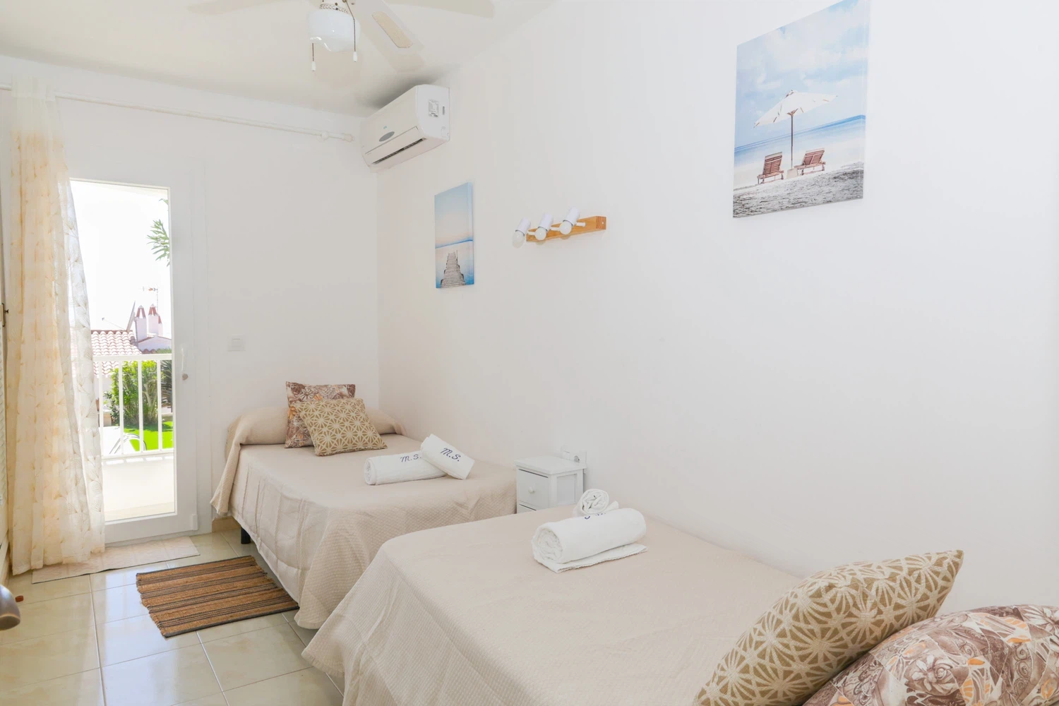 Las Villas Zodiaco son 2 villas juntas adosadas. La villa Zodiaco Acuario se encuentra en la urb. de Son bou a unos 600mts de la playa del mismo nombre. Consta de 3 dormitorios dobles con capacidad máxima hasta2 personas. Tiene espacioso salón-comedor con ventanal que da acceso a la terraza con unas magníficas vistas al mar y a la puesta de sol de Menorca. La planta noble consta de salón con ventiladores de techo, WIFI gratuito para los clientes, Smart TV, bluetooth. Hermosa cocina, bien equipada, con horno eléctrico, vitrocerámica, lavaplatos, cafetera eléctrica y de capsulas, kettle, tostador y microondas, nevera con congelador. Al lado del salón hay un baño con bañera y secador de pelo. En la planta inferior están distribuidos los 3 dormitorios dobles, uno de ellos con cama de matrimonio y dos de ellos con 2 camas individuales cada uno. Todos los dormitorios disponen de aire acondicionado. Hay un baño con ducha con secador de pelo.