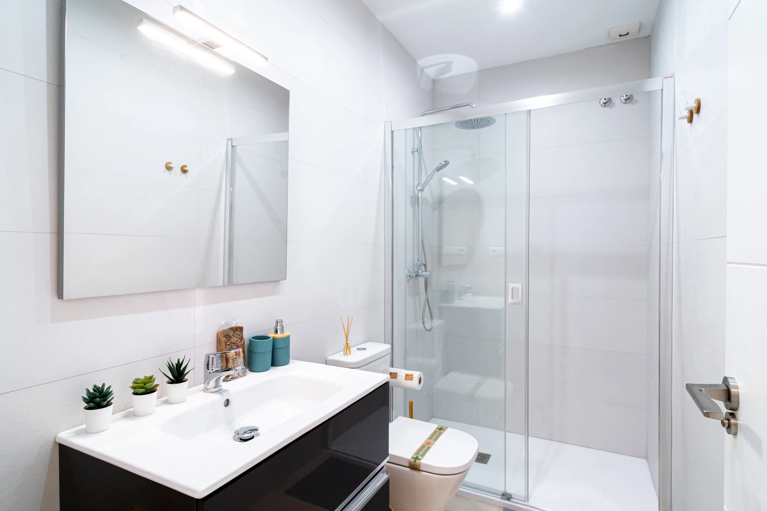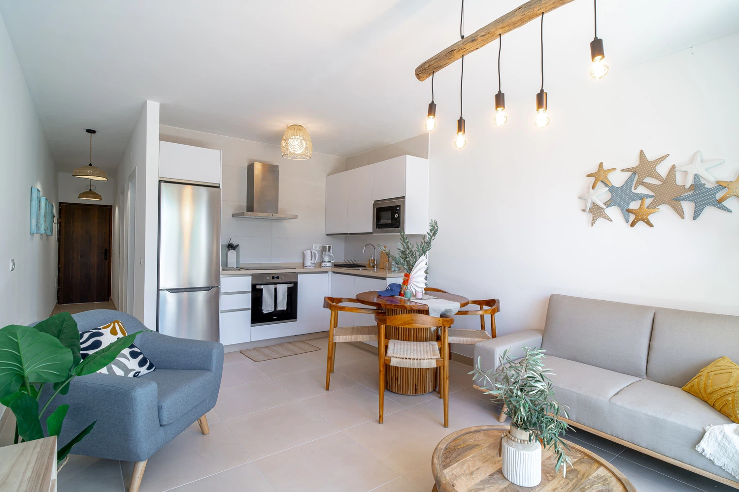 El apartamento incluye un baño moderno con una ducha elegante, ofreciendo un espacio refrescante para comenzar o terminar tu día. La cocina está totalmente equipada con electrodomésticos de última generación, perfecta para preparar desde desayunos rápidos hasta cenas gourmet.