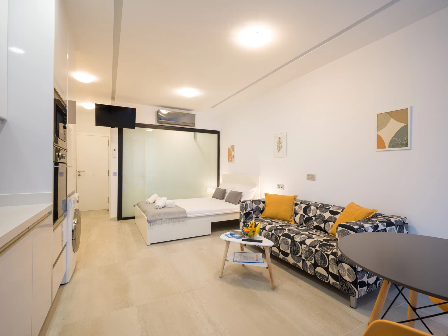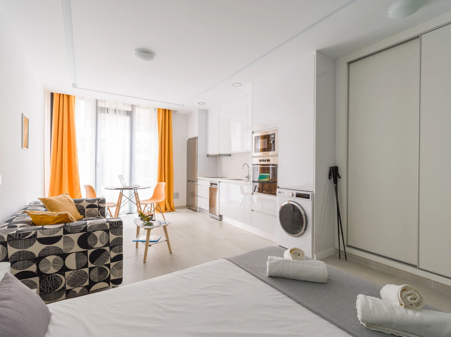 El estudio está ubicado en un edificio construido a finales del año 2022, que está equipado con dos ascensores y un acceso sin barreras. Dispone de equipamientos de última generación y calidad como aire acondicionado, acceso a internet por fibra (wifi), smart TV, armario empotrado, frigorífico, congelador, horno, microondas, lavadora, secadora, lavavajillas, vajilla/cubertería, utensilios de cocina, cafetera, tostadora, tetera, plancha y secador de pelo.